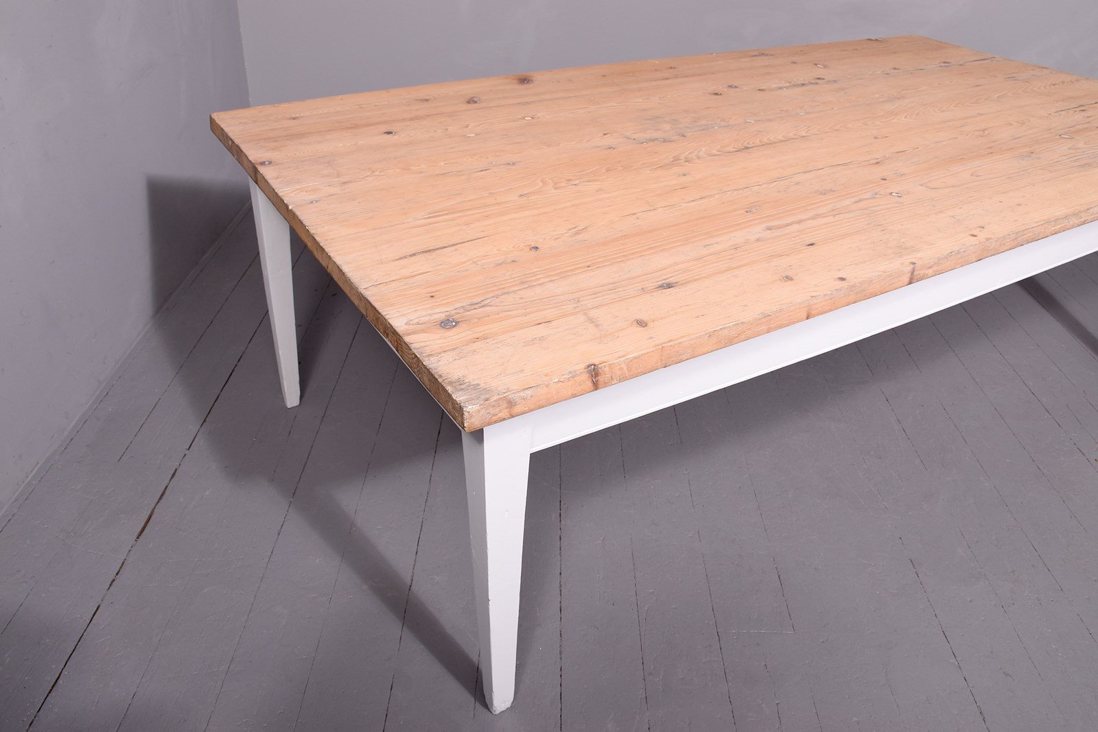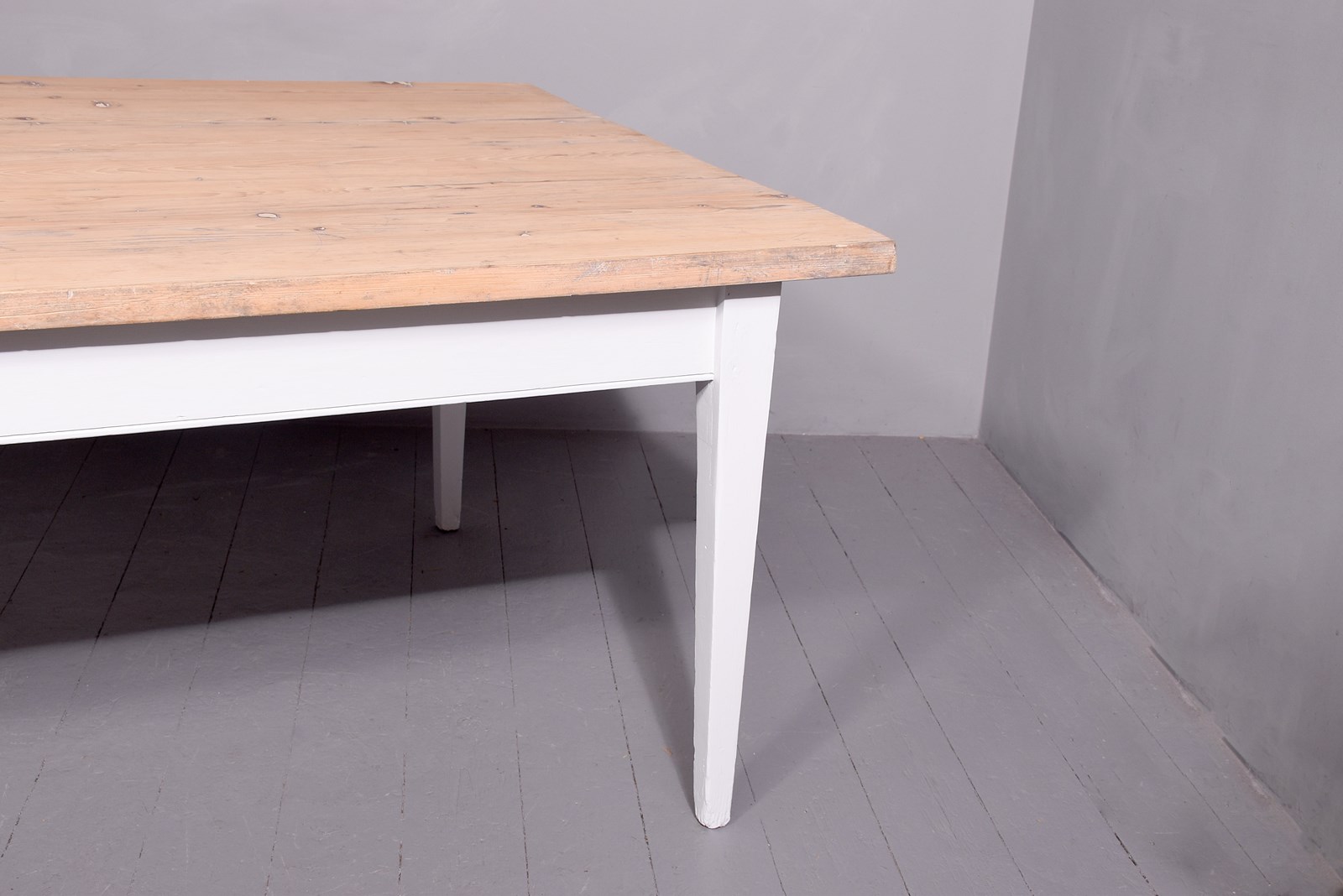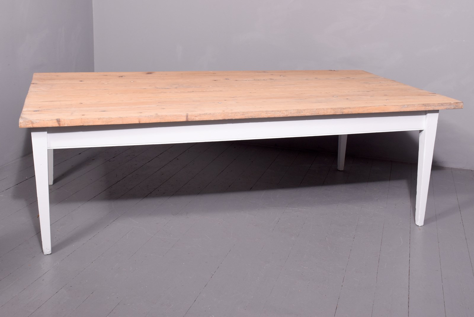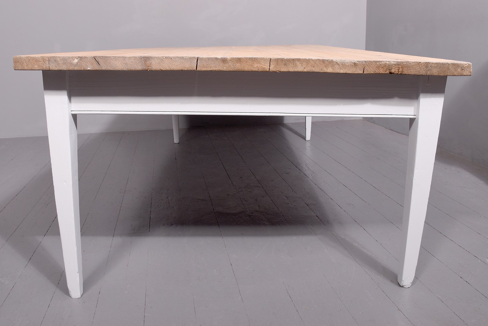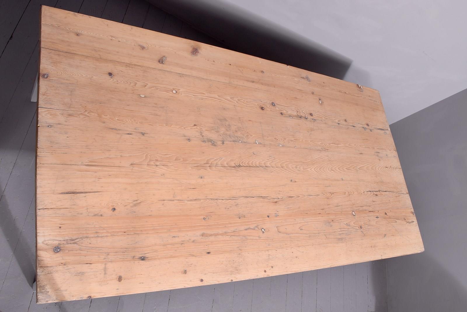 Circa 1870. A massive pine and painted kitchen table, the solid top made with several boards with a simple fore-edge, the top is 3.5cm thick, resting on a painted base with frieze, supported on four square tapering legs. Recently painted.
