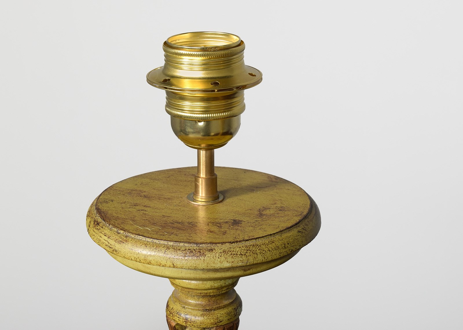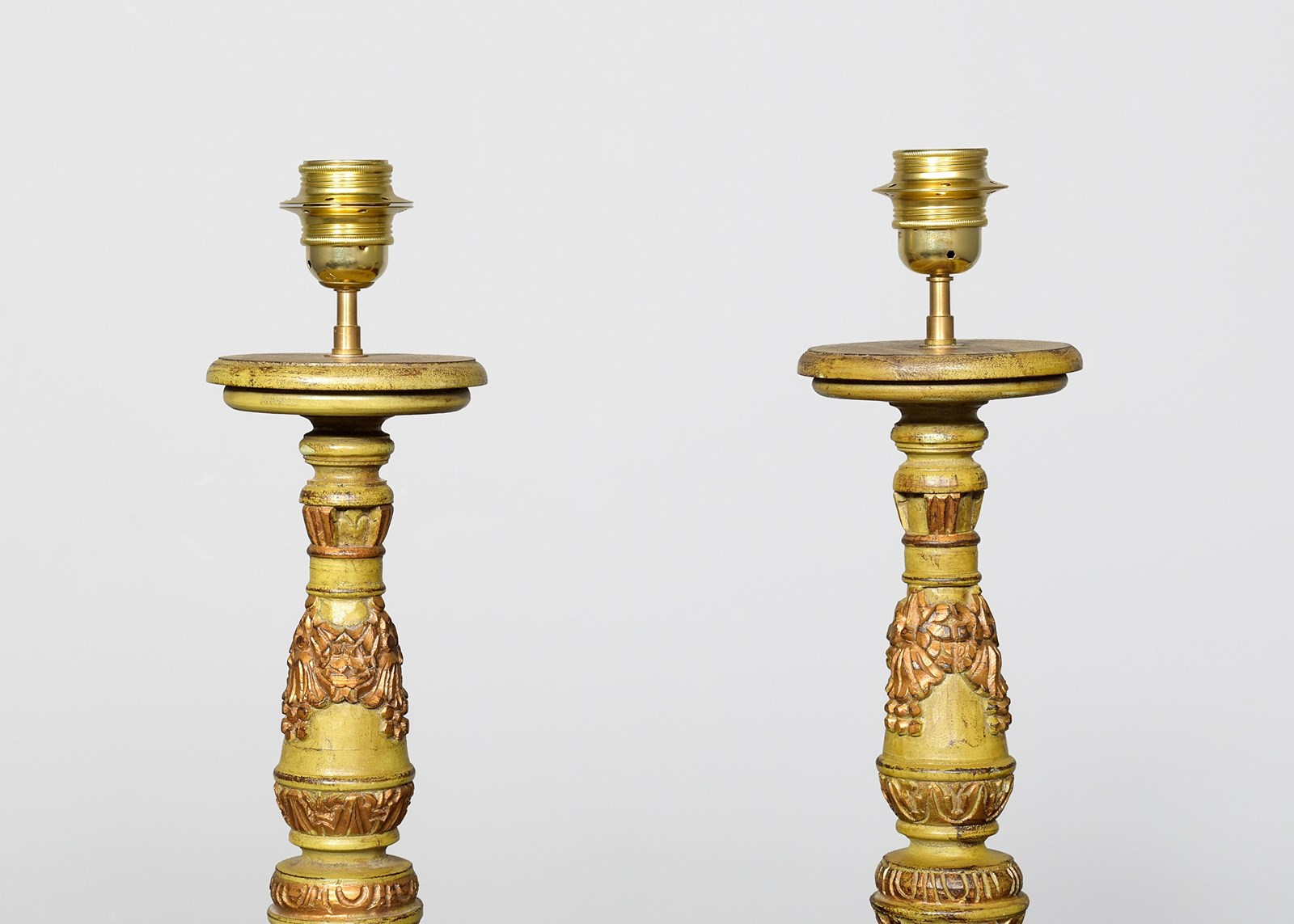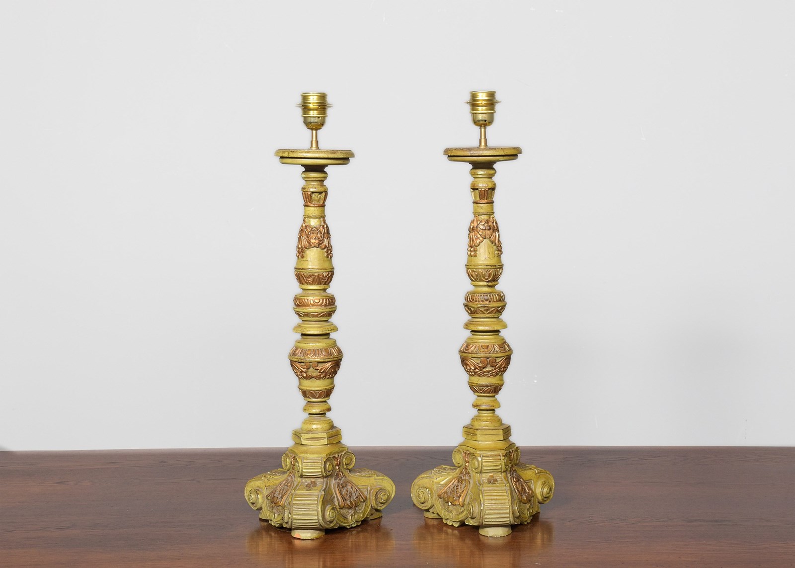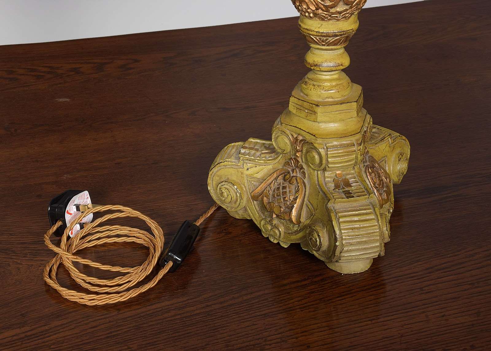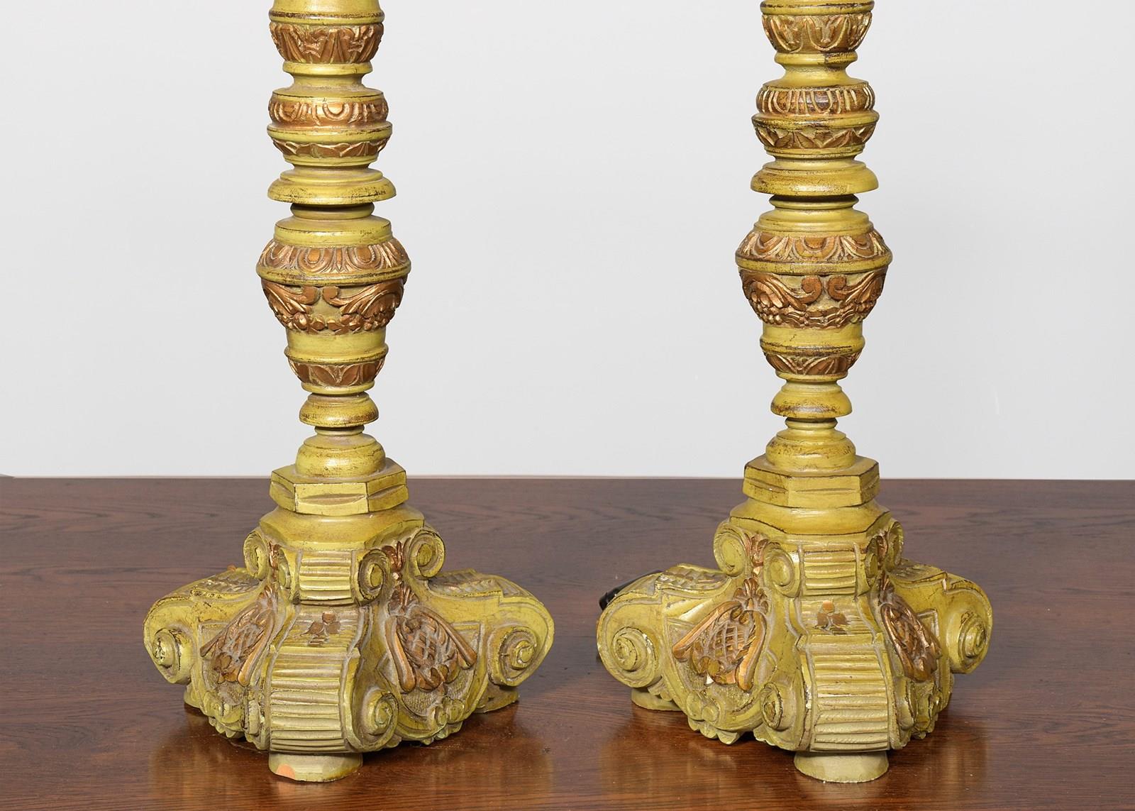 Circa 1970s. a pair of carved wood and painted Venetian-style lamps (recently rewired), with a brass top with gold flex with an inline switch, the painted green and gilded lamps with foliate carving on the upright, resting on a tripod base with ribbing, foliate carving in the form of a cartouche and resting on small painted feet, the pair of pleated shades of similar colour with frieze of frills is included.