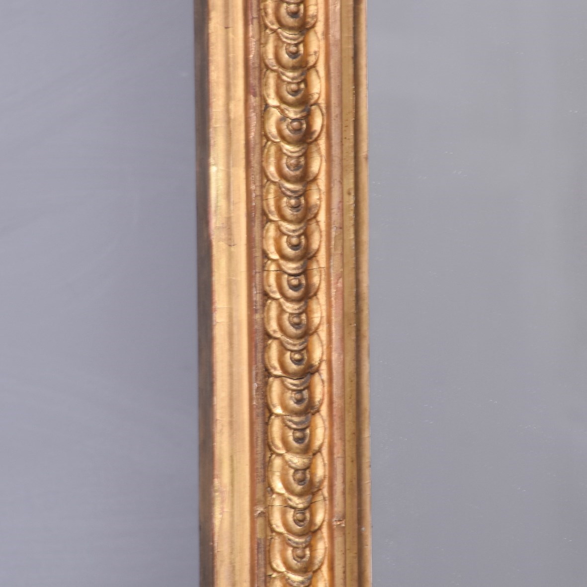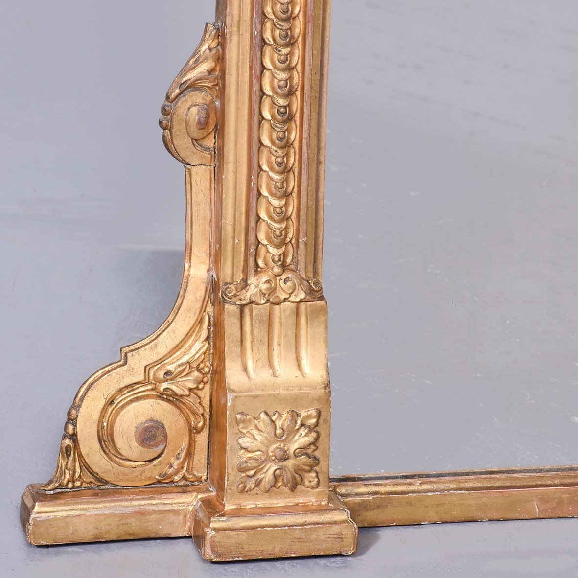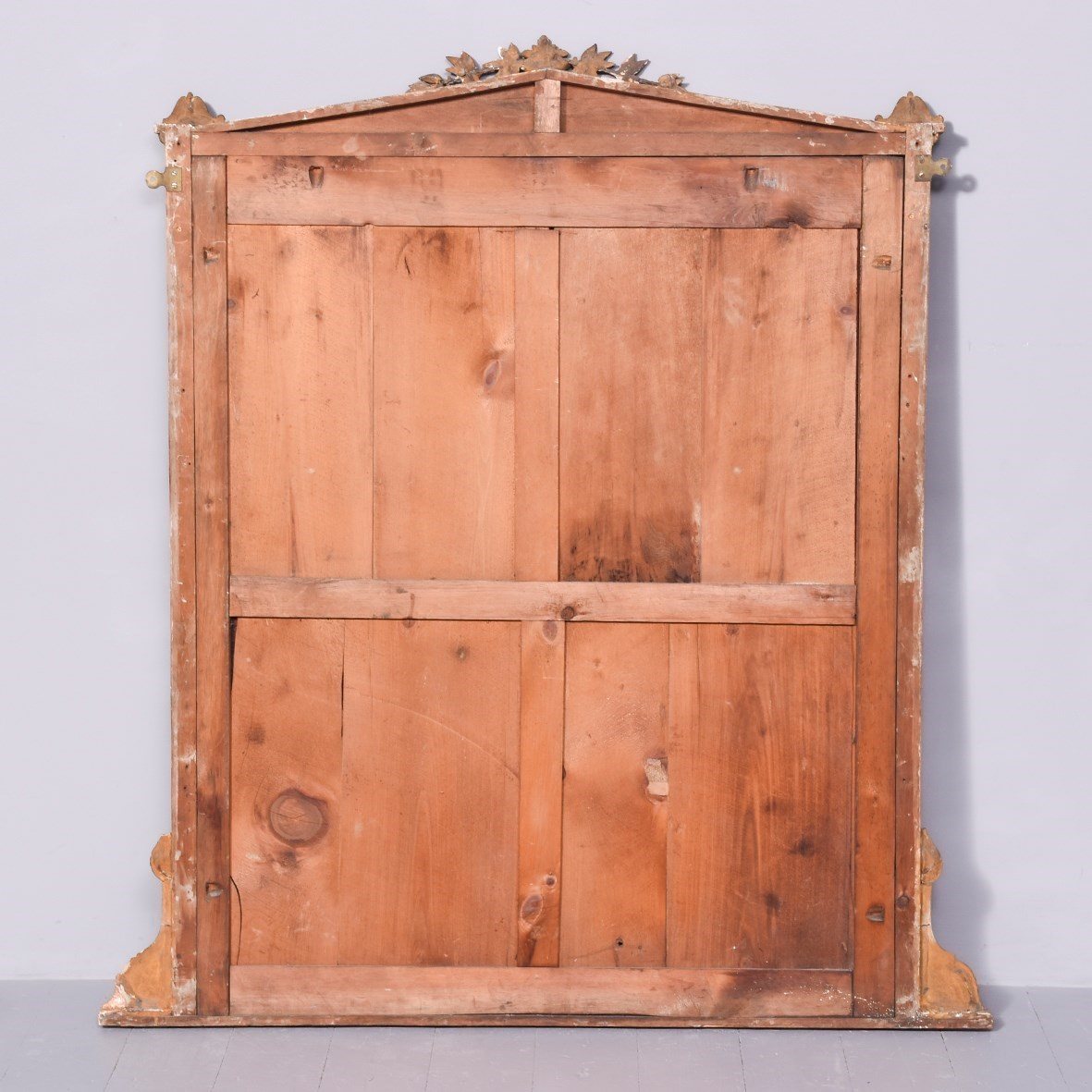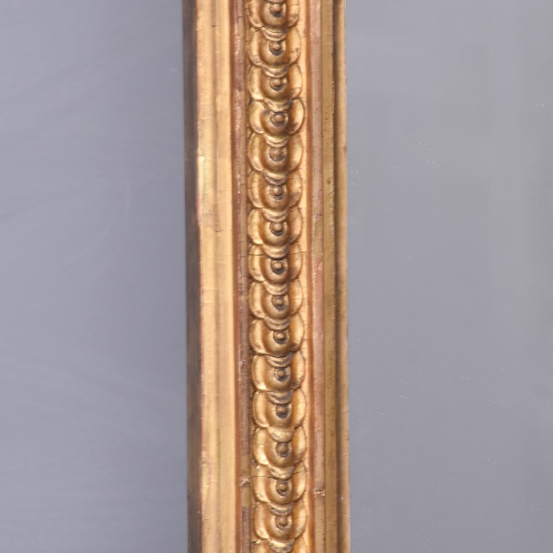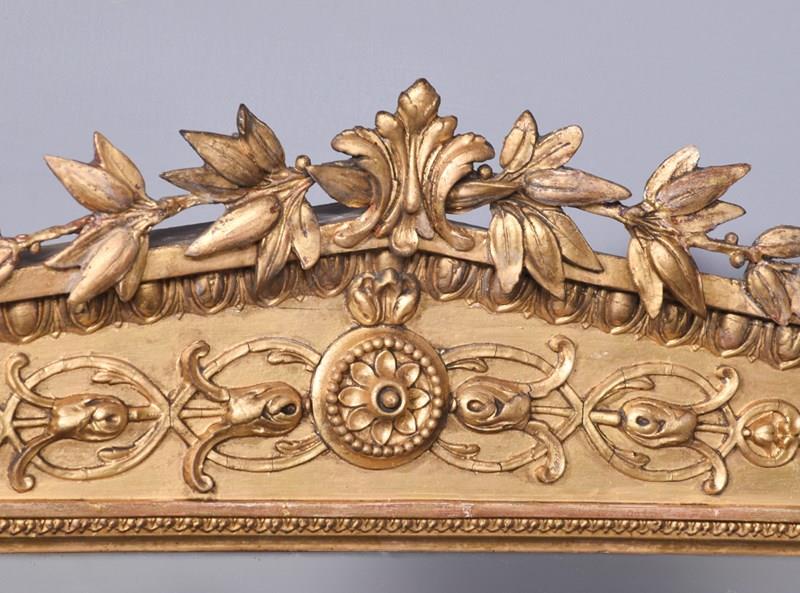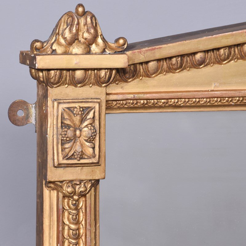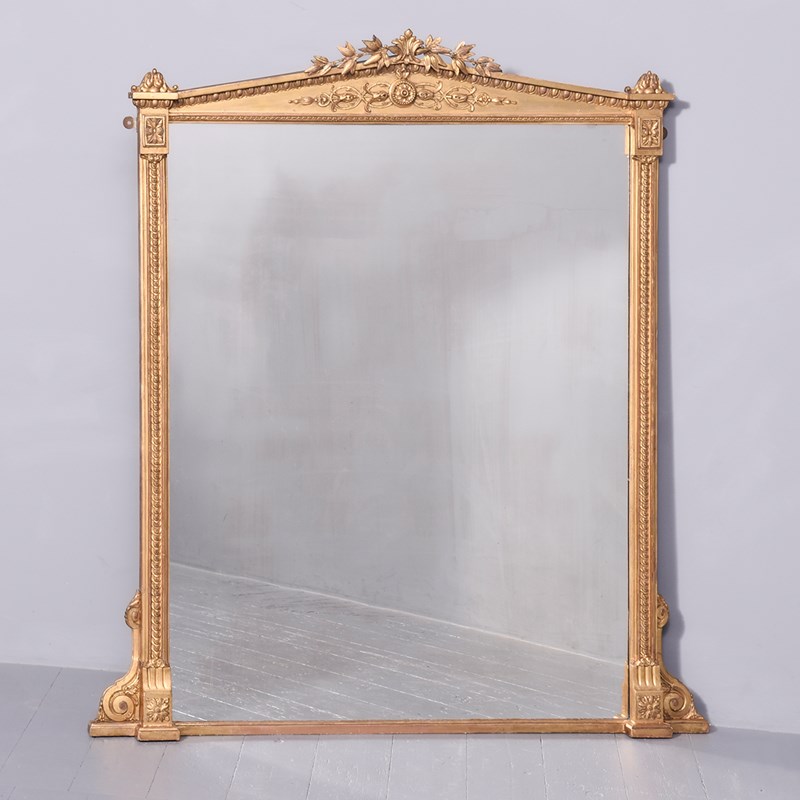 Circa 1870. A Mid Victorian carved giltwood overmantle mirror with an architectural pediment surmounted with foliate carving. The triangular frieze with a stylish top border and decorative mouldings to the centre. The frame retains its original mirror plate, which is in excellent condition, surrounded by a simple gilded slip. The sides, with scrolled decoration with small capitals, with scrolling ends and rectangular flower heads to the base.