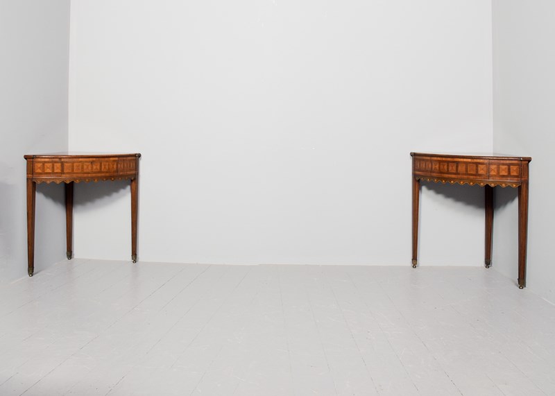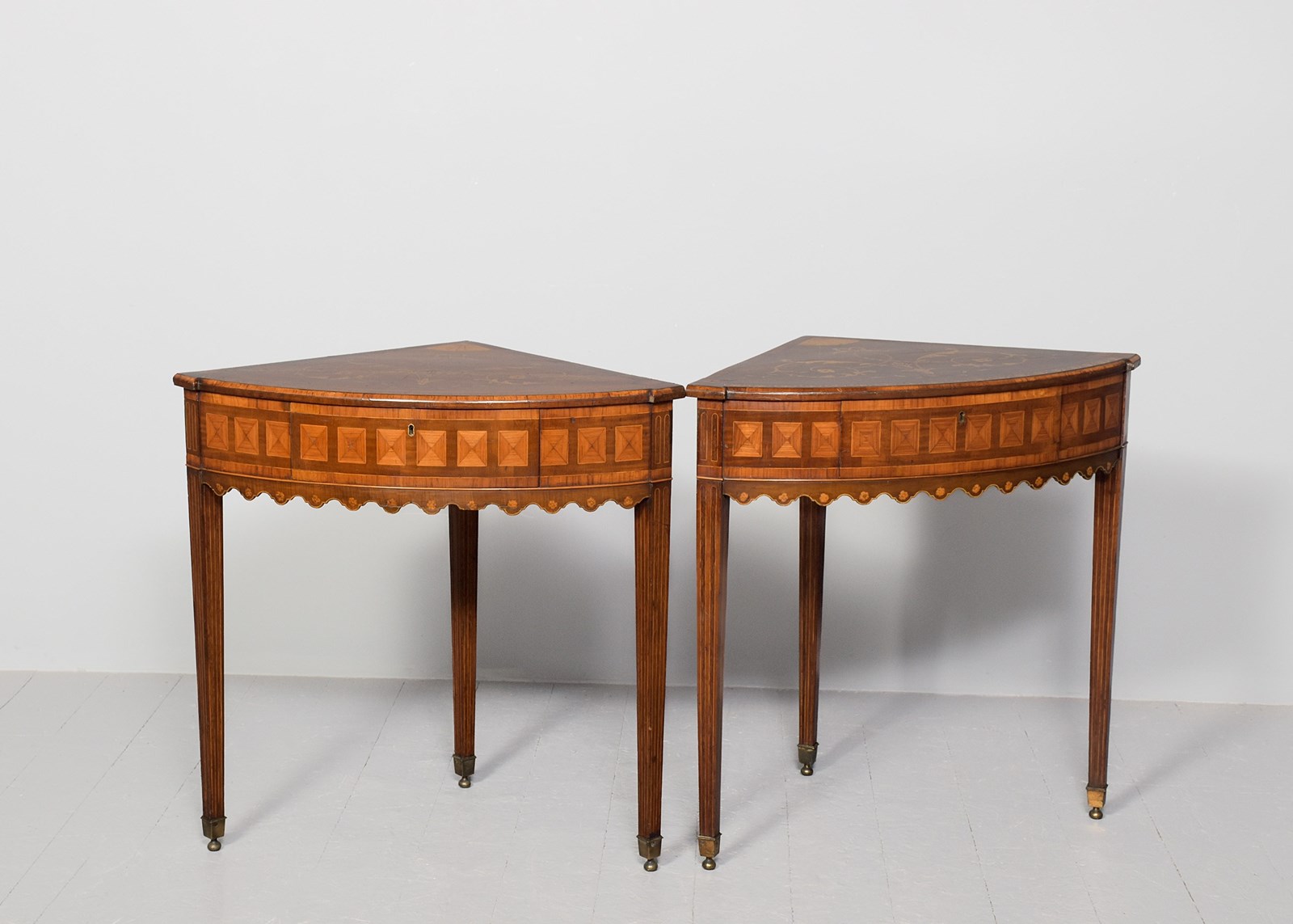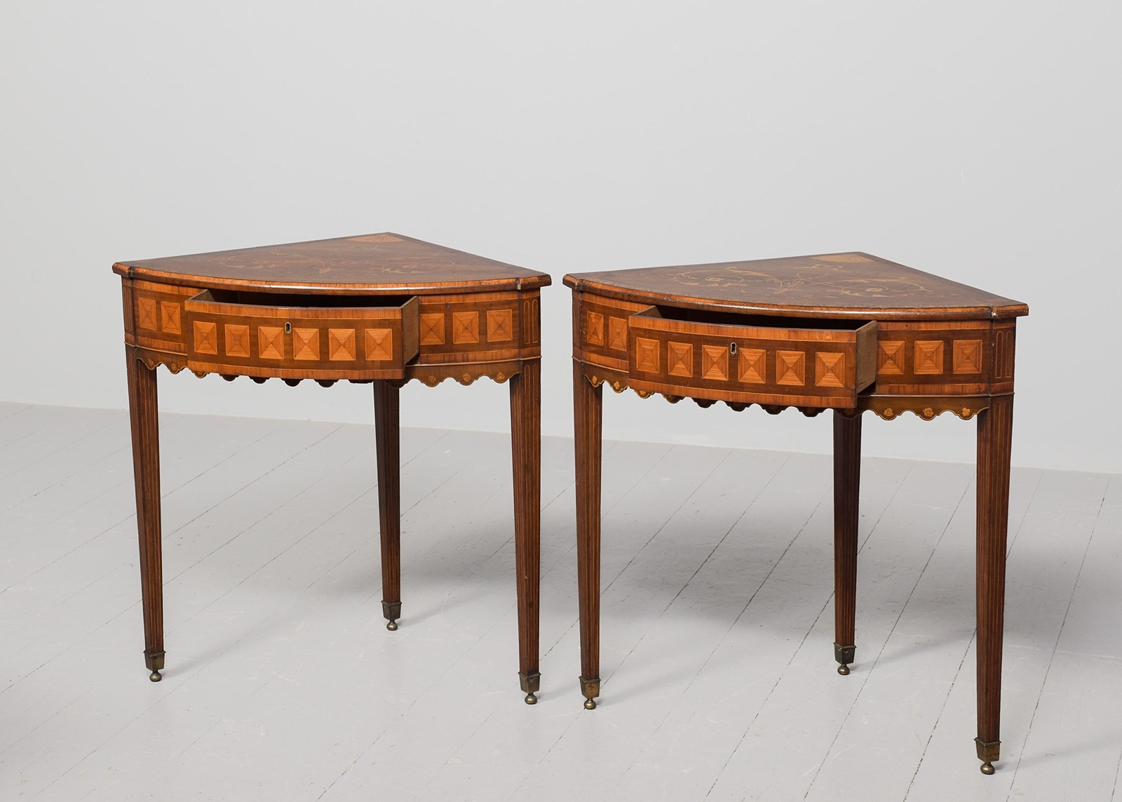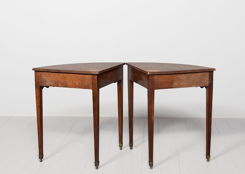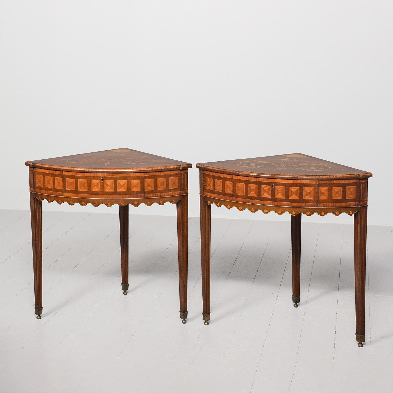 A Pair Of Mahogany, Satinwood, Fruitwood And Marquetry Corner Tables