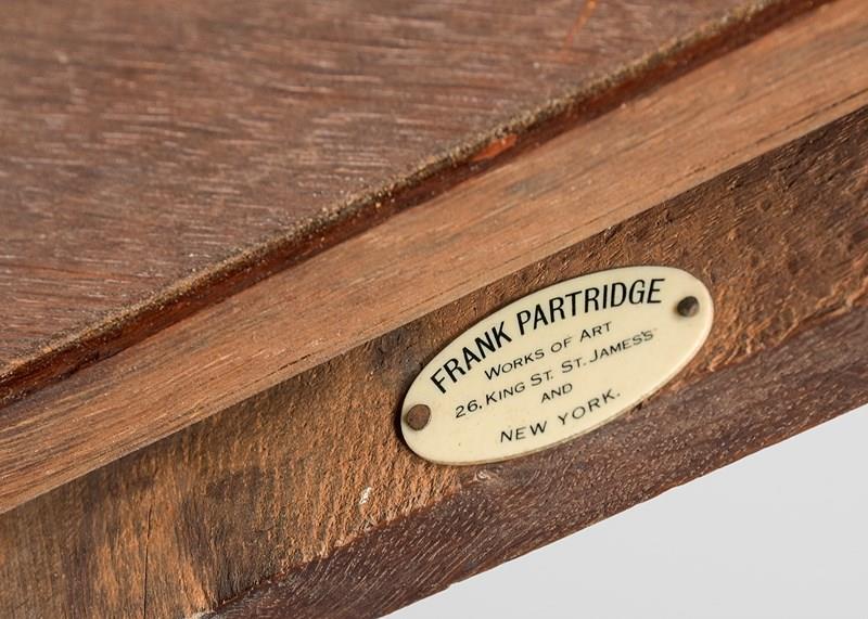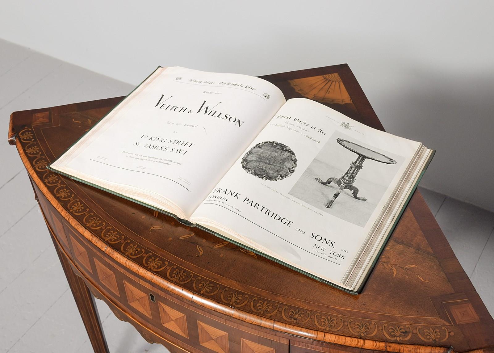 Circa 1770. A pair of mahogany, satinwood, fruitwood and marquetry corner (quadrant-shaped) in the manner of ‘Ince and Mayhew’. The bow-front tops with quarter fans, ribbon-tied husk, swags and foliate scrolls within the border above the friezes, concealed drawers, inside of each there is a trade label for ‘Frank Partridge, St James & New York’. The frieze with parquetry inlay, and a wavy inlaid apron, raised on inlaid square tapering legs terminating with brass castors and ball feet.