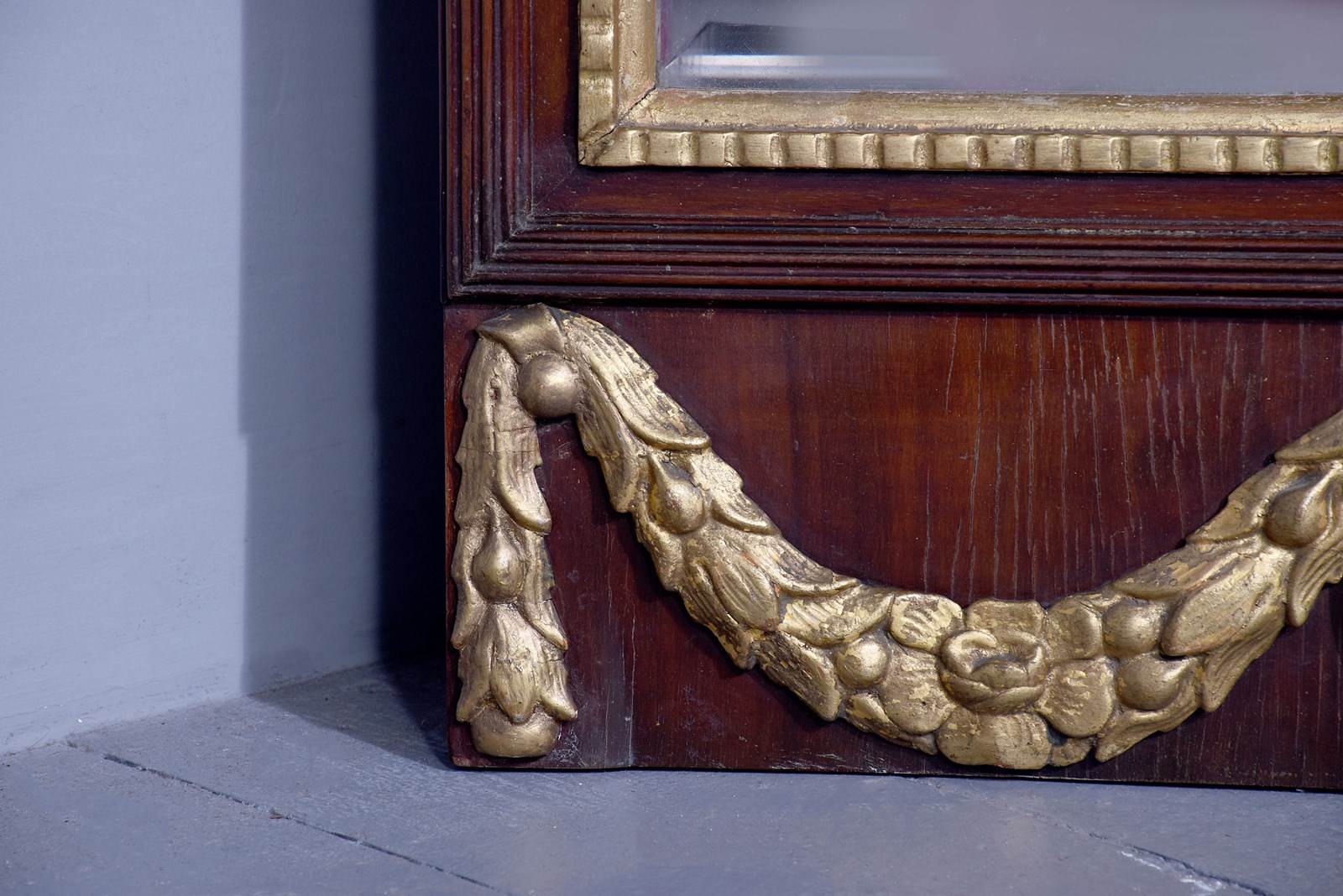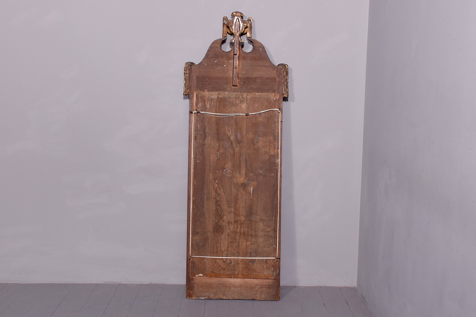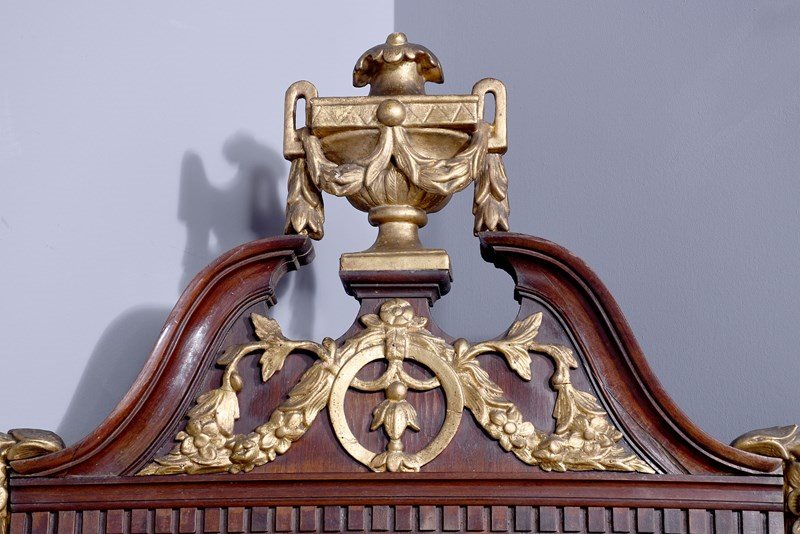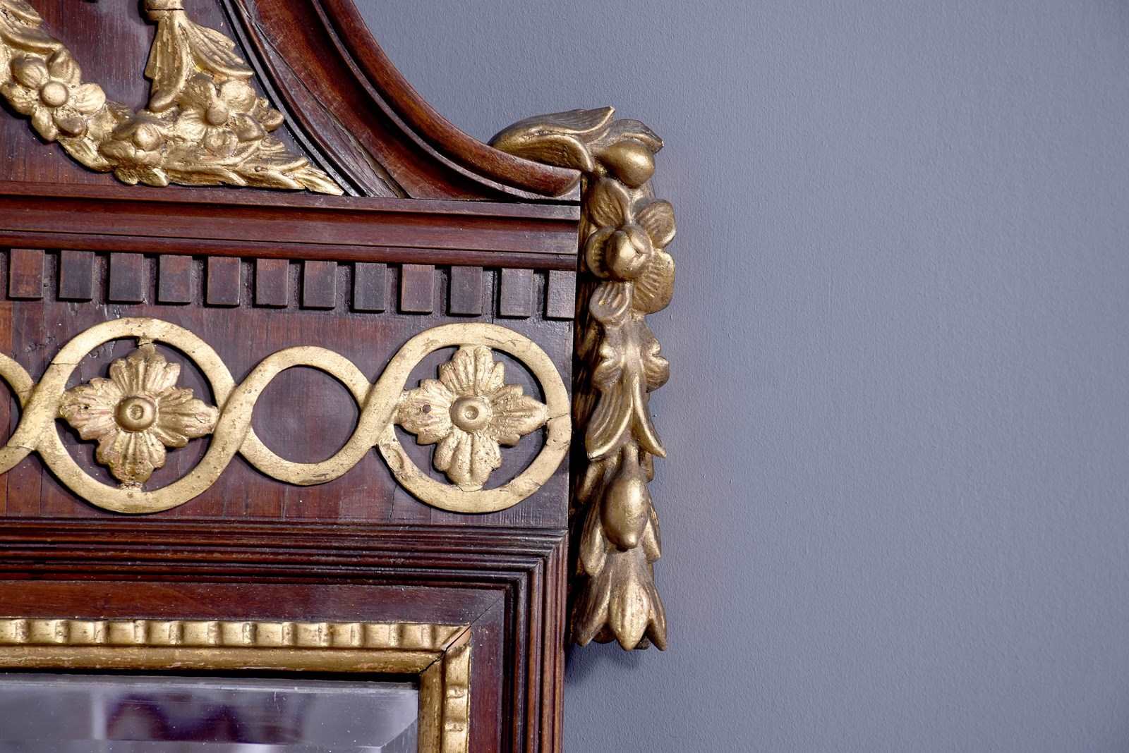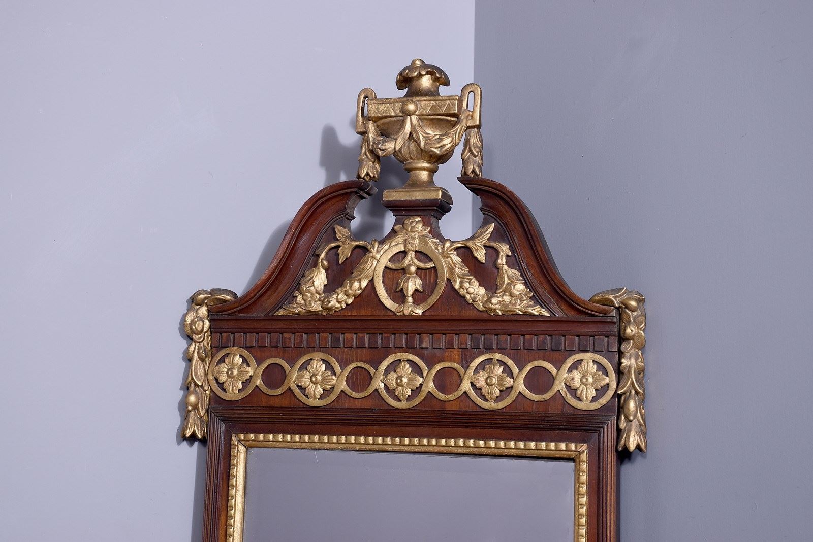 Circa 1820. A rare and unusual mahogany and gilded Swedish Pier mirror, the Neoclassical gilded and mahogany mirror with the original two-part mirror, surmounted by a carved and gilded urn with swags and a broken arched pediment with foliate carving to the centre and trailing down the sides, the frieze with roundels with flower heads in the centre, the bevel-edged mirrors contained within the gilded slip with ribbing to the outside with more swags and tails to the base.