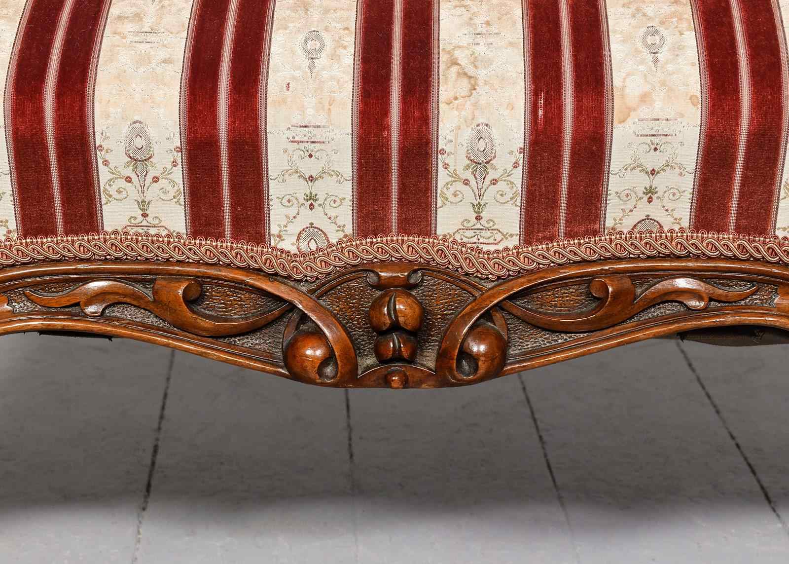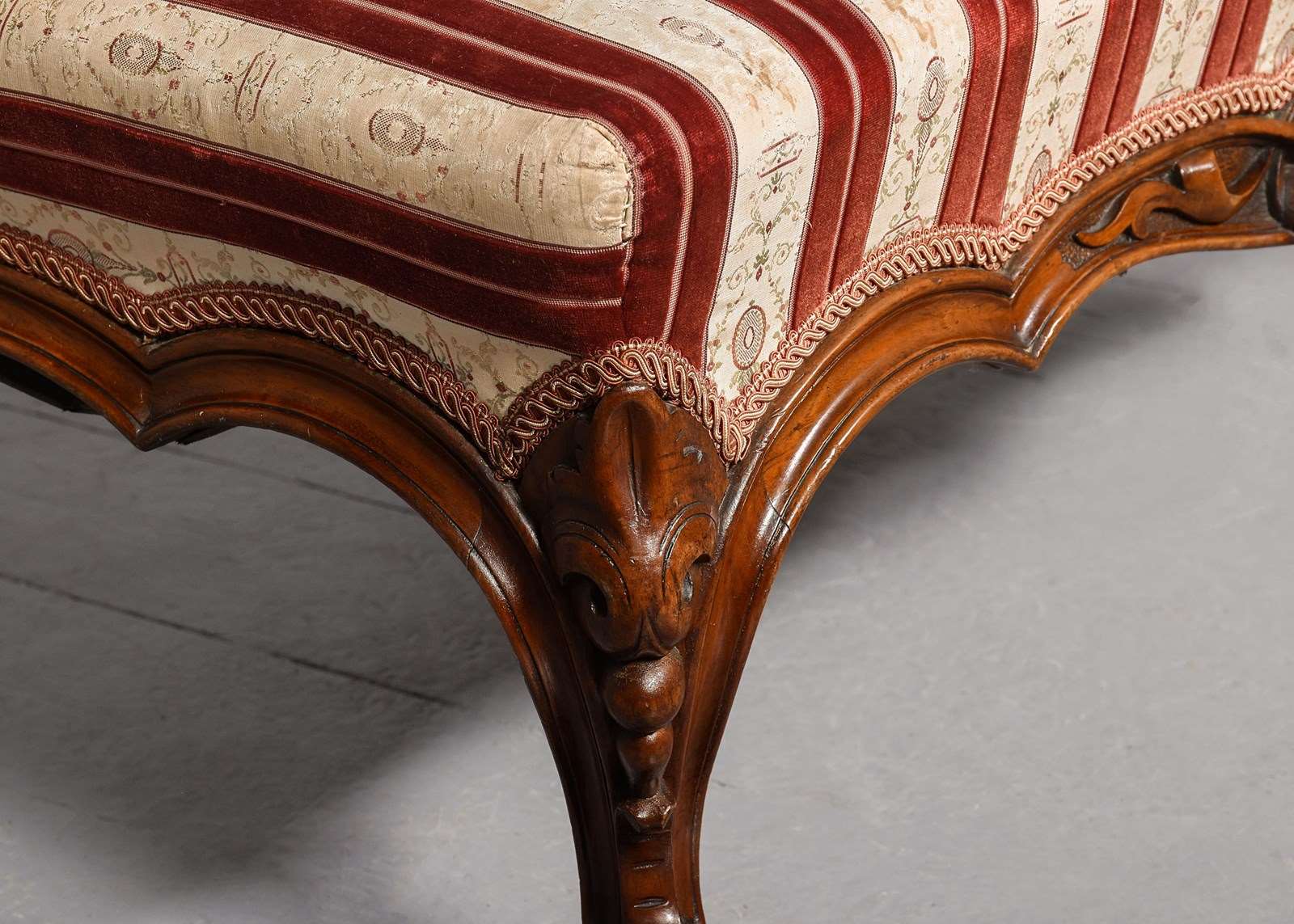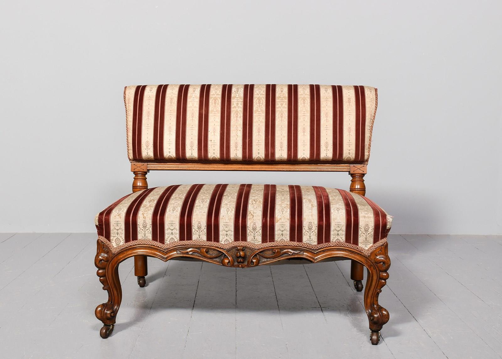 Circa 1860. (Some slight damage to the fabric). Attractive, neat-sized carved walnut Victorian settee with an upholstered curved shaped back, the upholstery with bands of embroidered silk and velvet with gimp borders, on short turned supports above the generous size seat with matching upholstery and a foliate carved shaped apron. Supported on front on short carved cabriole legs with foliate carved knees and scrolled toes with brass and brown porcelain castors and with outswept rear supports on matching castors.
