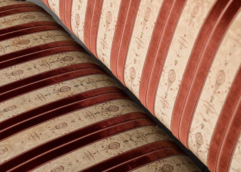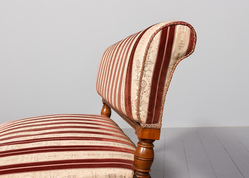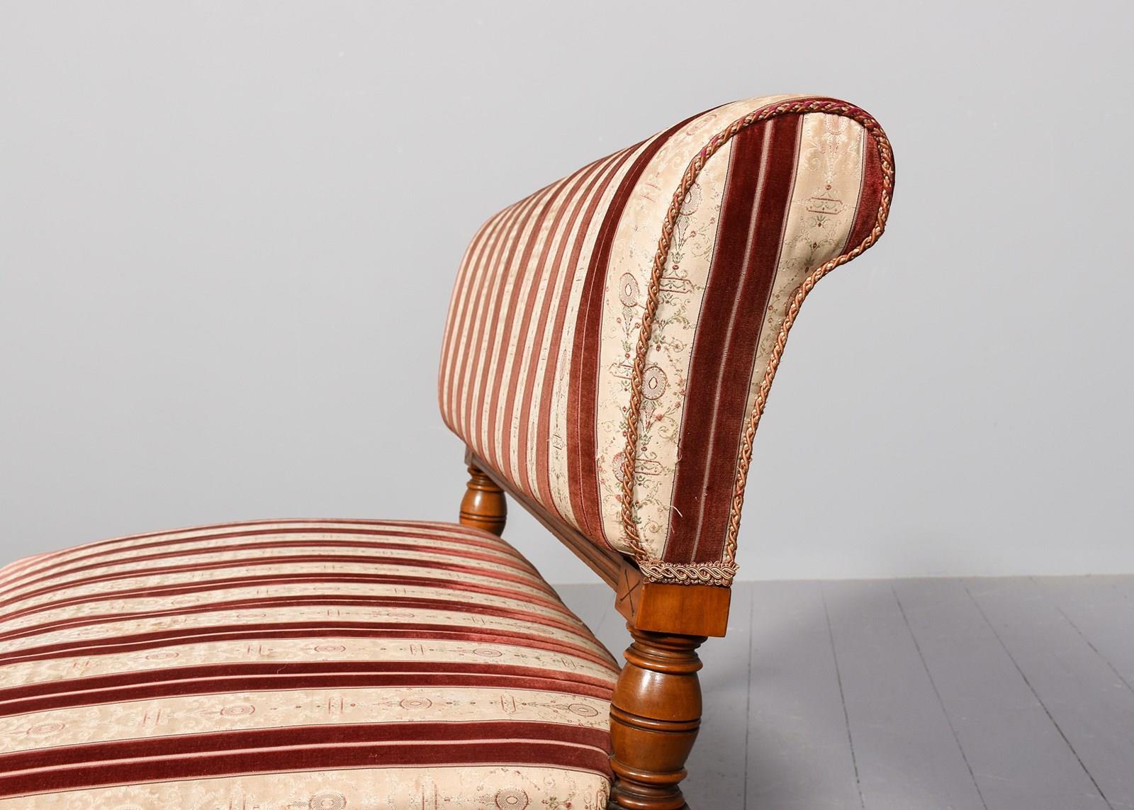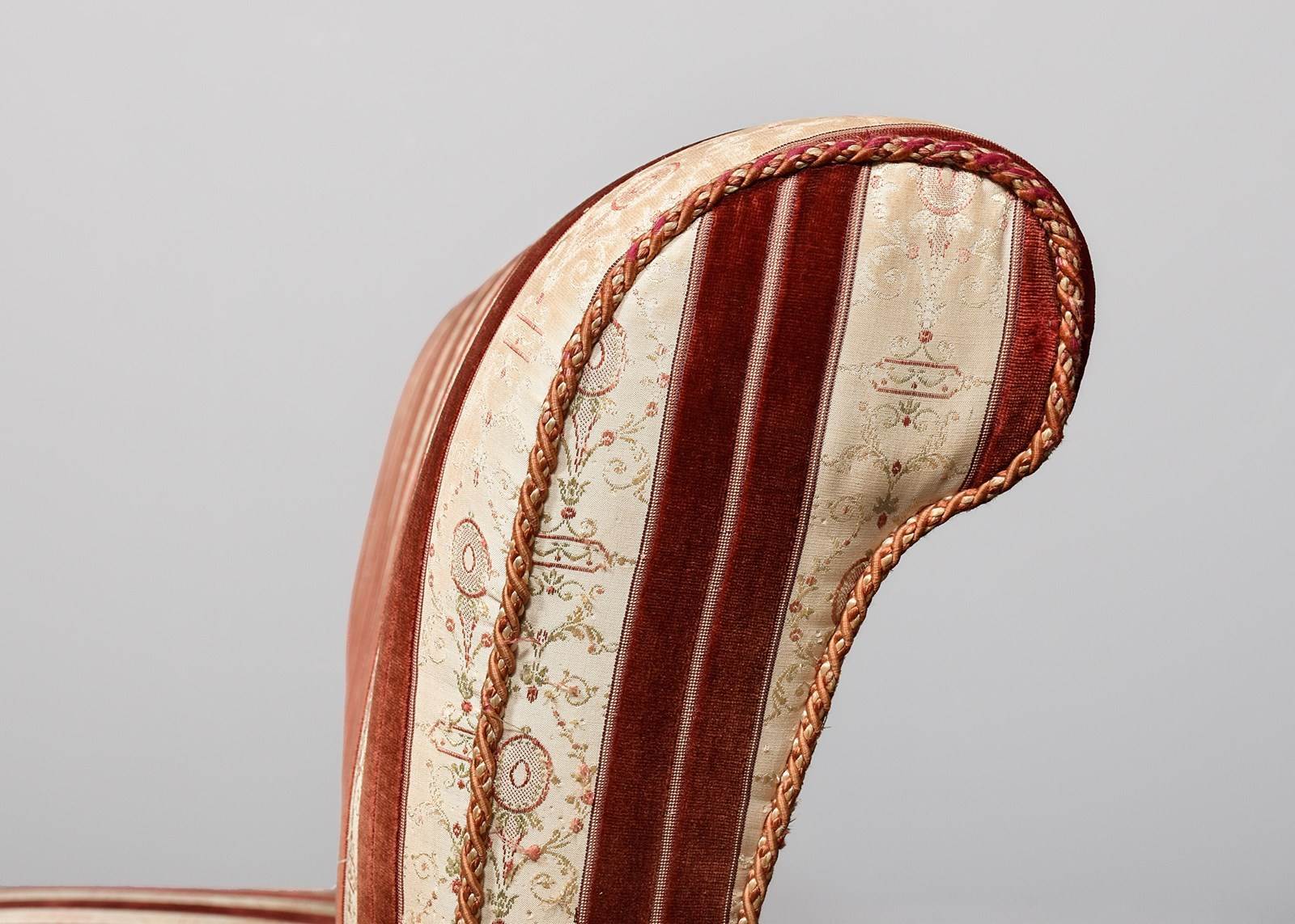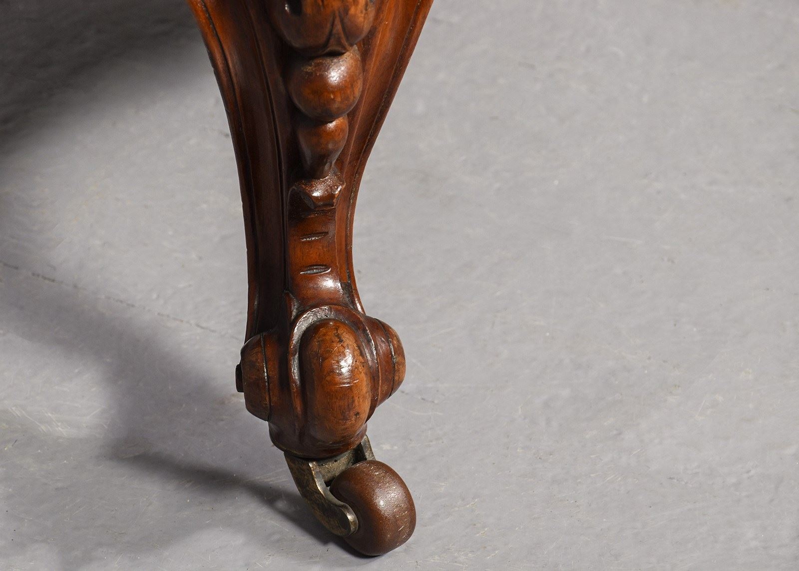 Circa 1860. (Some slight damage to the fabric). Attractive, neat-sized carved walnut Victorian settee with an upholstered curved shaped back, the upholstery with bands of embroidered silk and velvet with gimp borders, on short turned supports above the generous size seat with matching upholstery and a foliate carved shaped apron. Supported on front on short carved cabriole legs with foliate carved knees and scrolled toes with brass and brown porcelain castors and with outswept rear supports on matching castors.