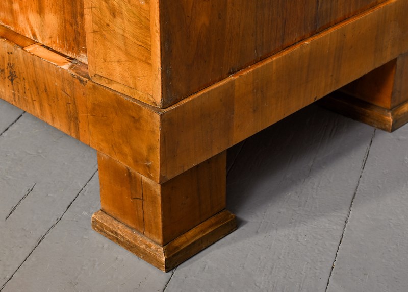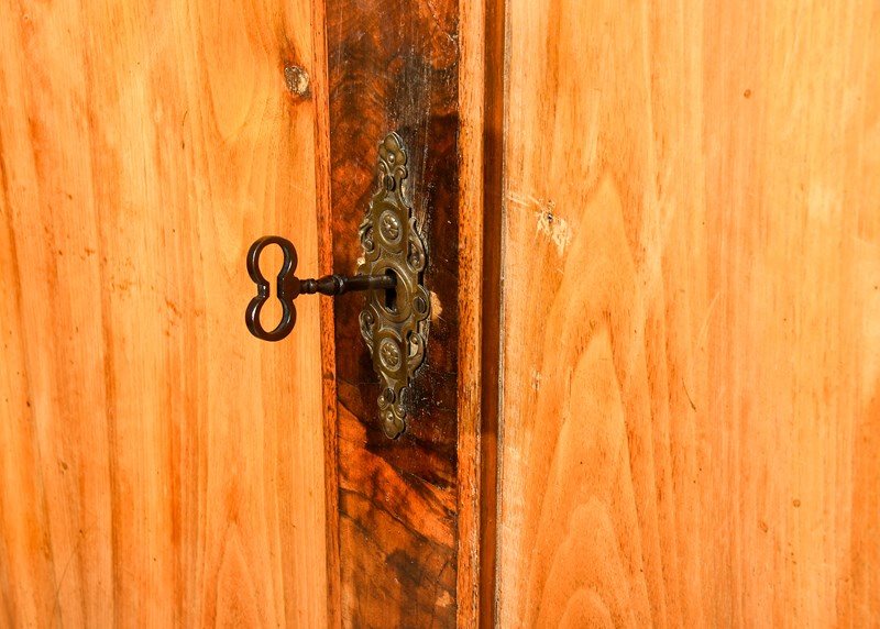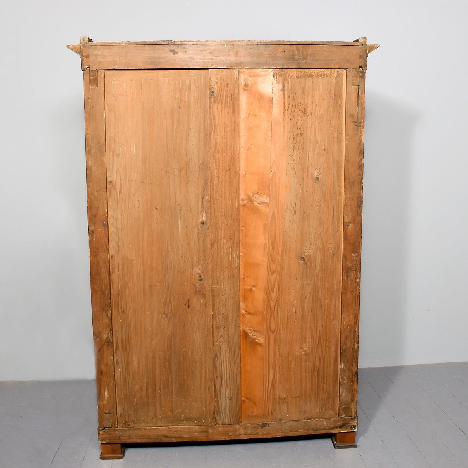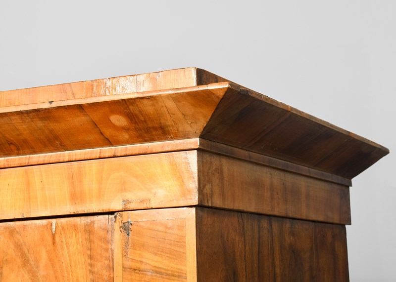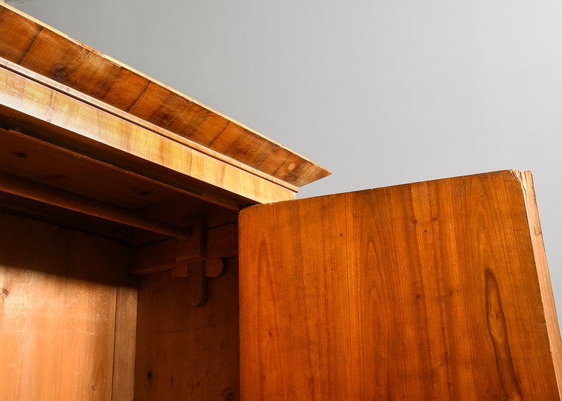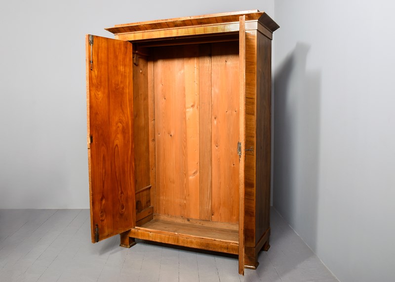 Circa 1850. An unusual, stylish Austrian walnut two-door wardrobe. the stylish pediment with raised, sloped and crossbanded section, with a pair of full-length doors in book matched walnut, with a broad and overlapping panel in the center and stylish cast brass escutcheon and original key, open to an uninterrupted interior with a hanging rail in the top, the insides of the doors are polished, the sides of the doors have a crossbanded facings, beneath the doors there is a simple frieze, all resting on four square feet with small mouldings.