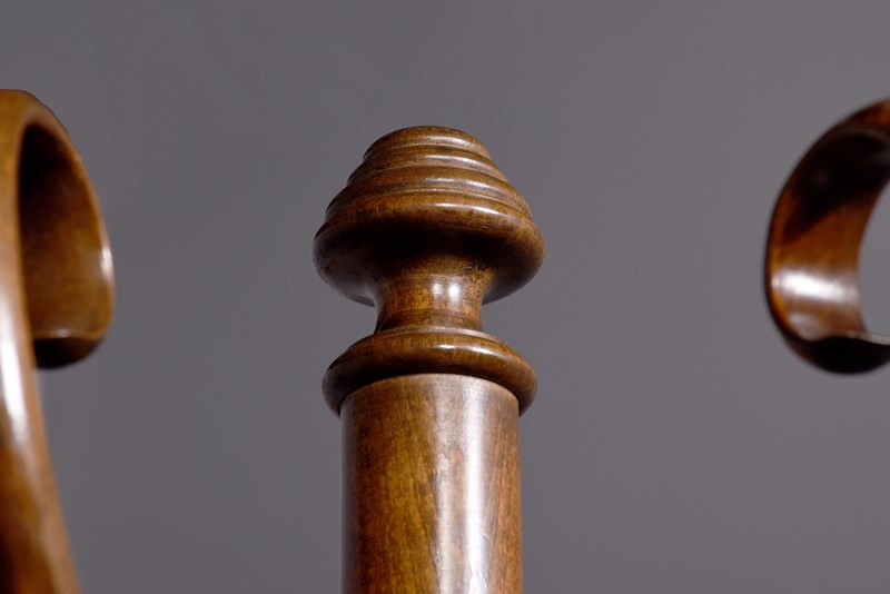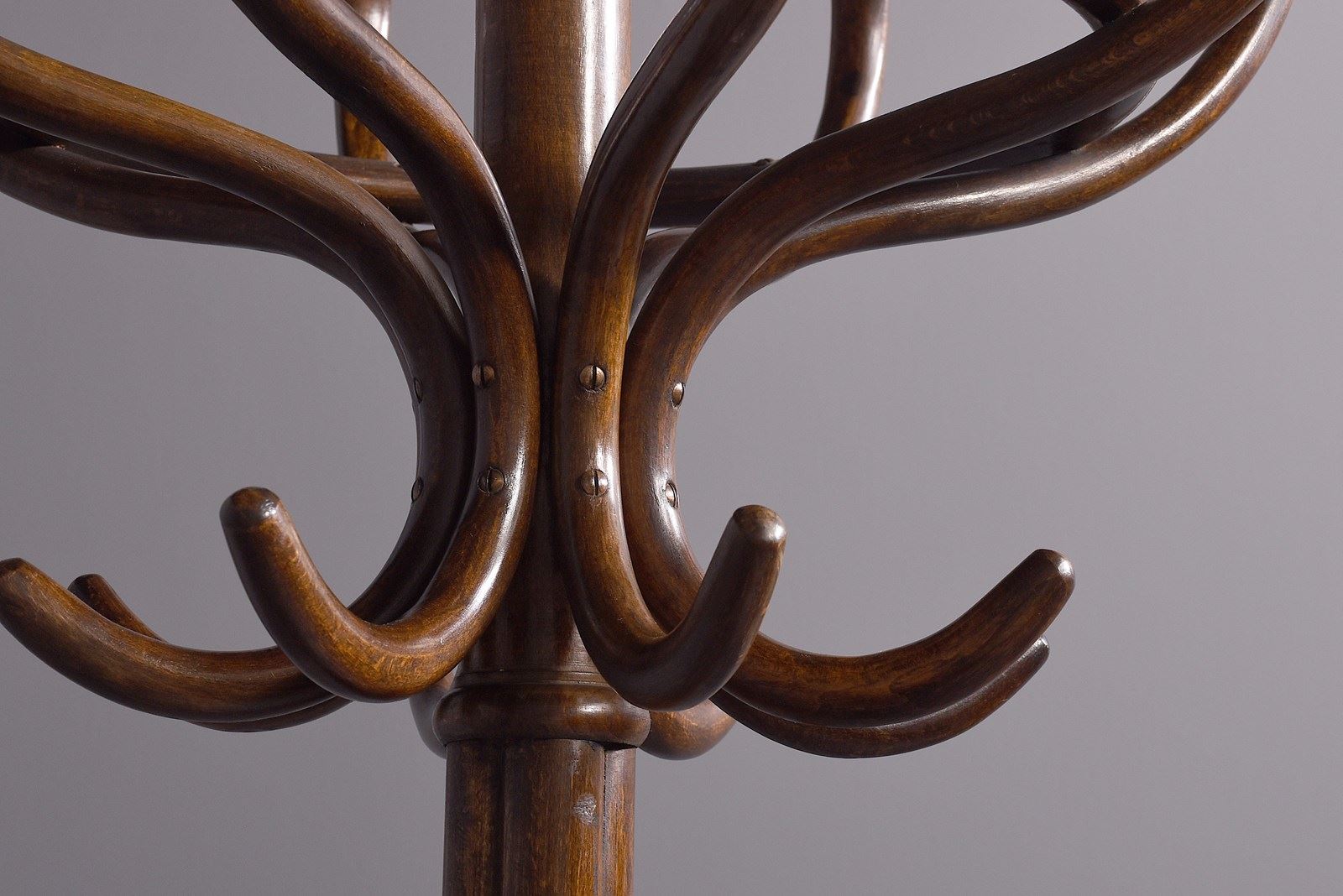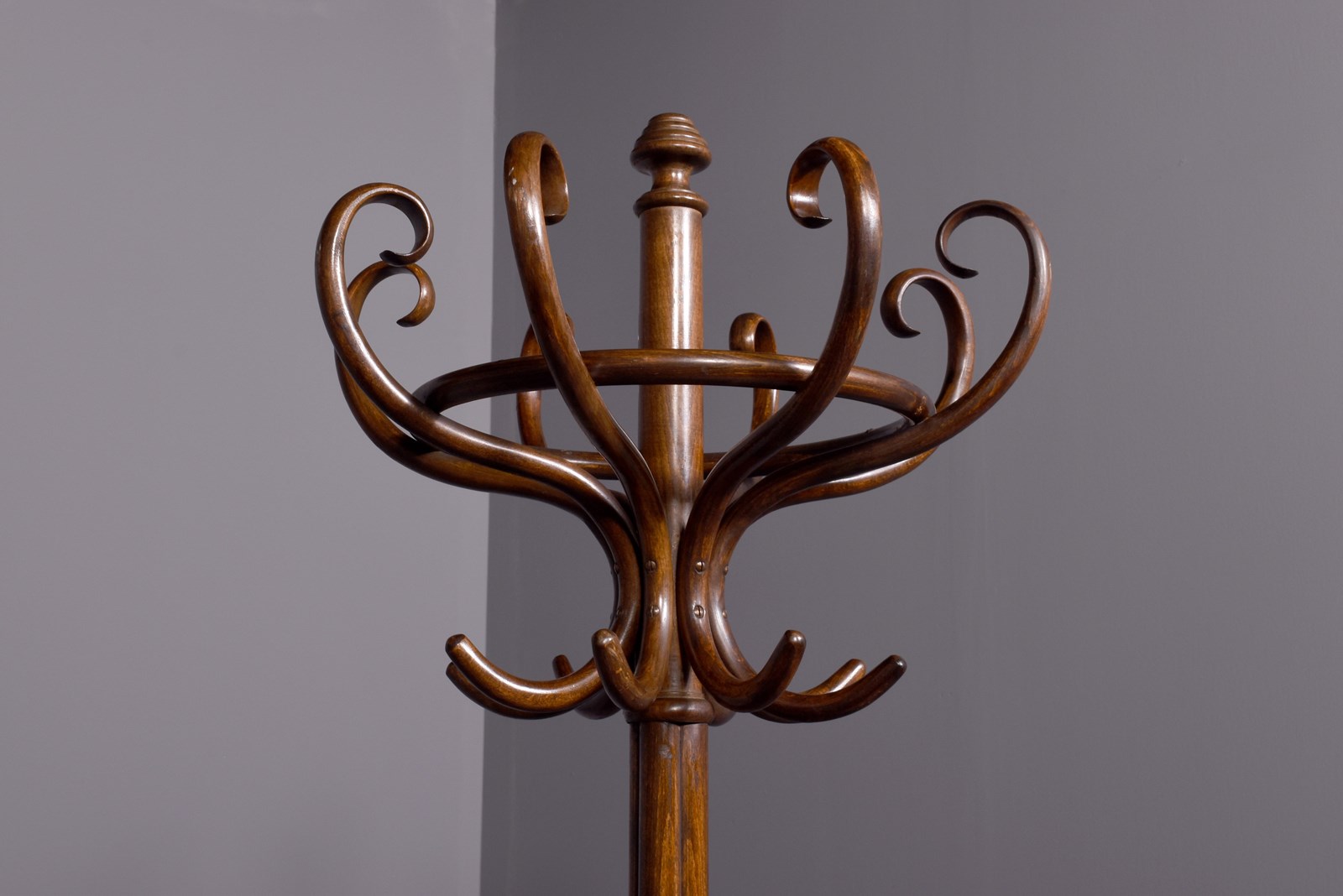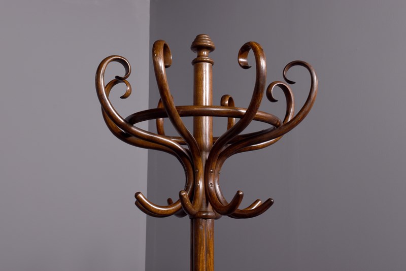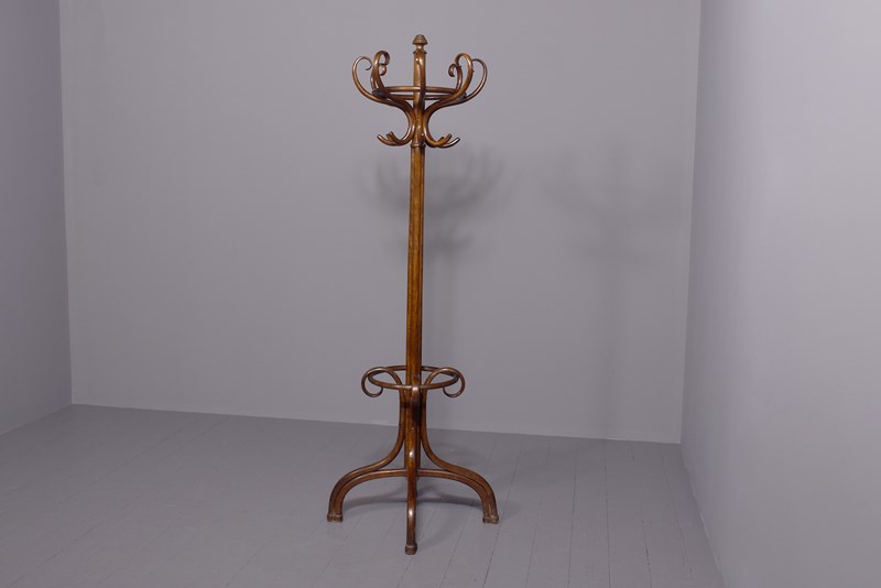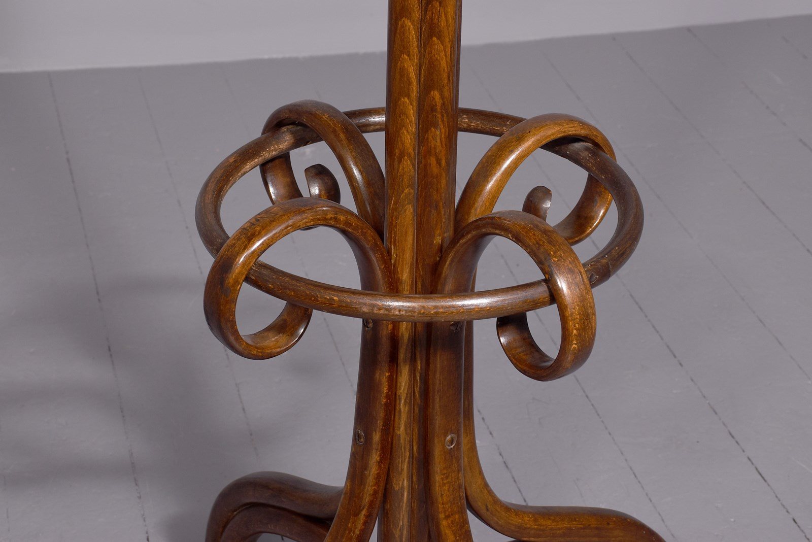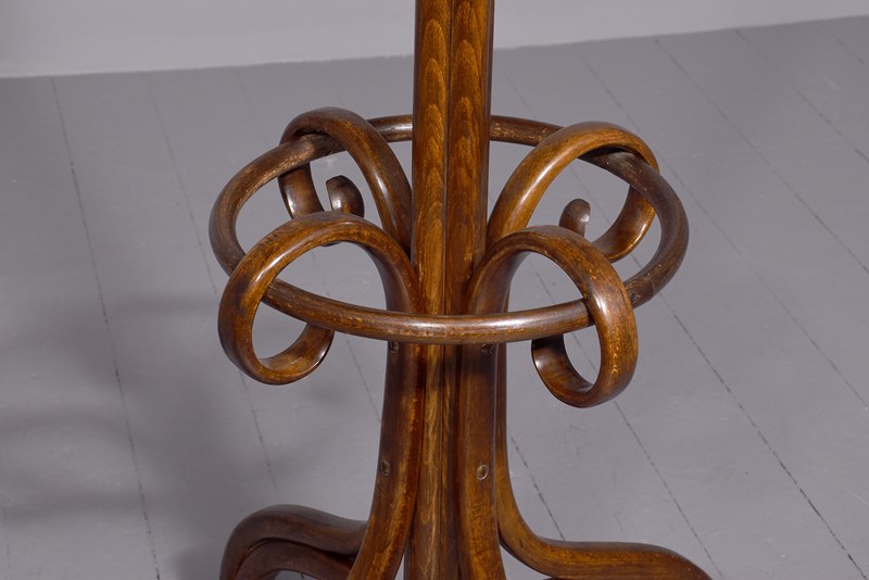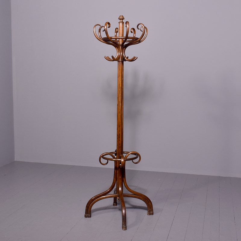 Circa 1900. A quality bentwood hall stand with the underside stamped ‘Thornet’ The central cluster stem surmounted with an elegant finial in the form of a beehive, with eight shaped arms forming the coatrack, towards the base, a circular section held in place by four curved sections of bentwood for holding sticks, all resting on four braced downward facing legs.
