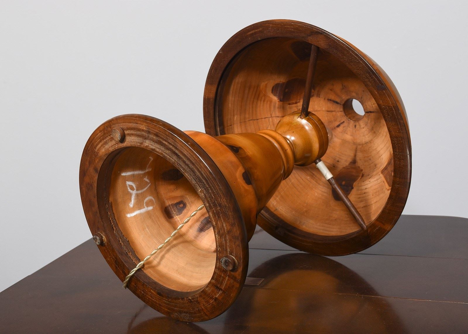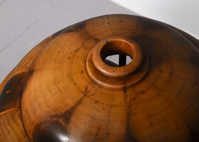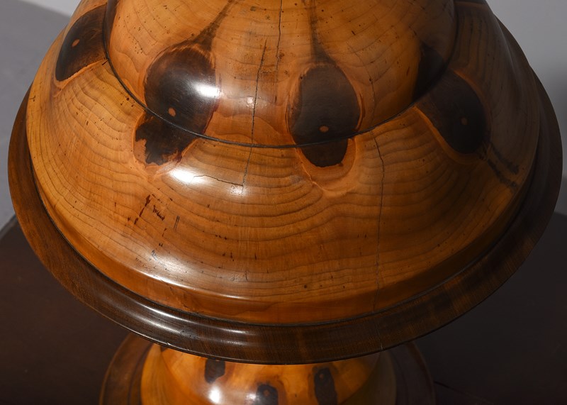Circa 1920s. A rare and unusual Brazilian monkey puzzle tree wood two-part table lamp, the domed top with wonderful panels resembling oysters, with the shade held in place by wooden arms, resting on a stylish tapering stem finishing with a flared rim.