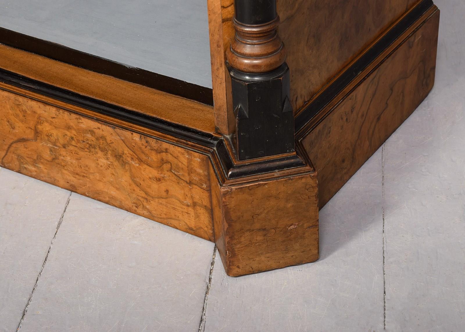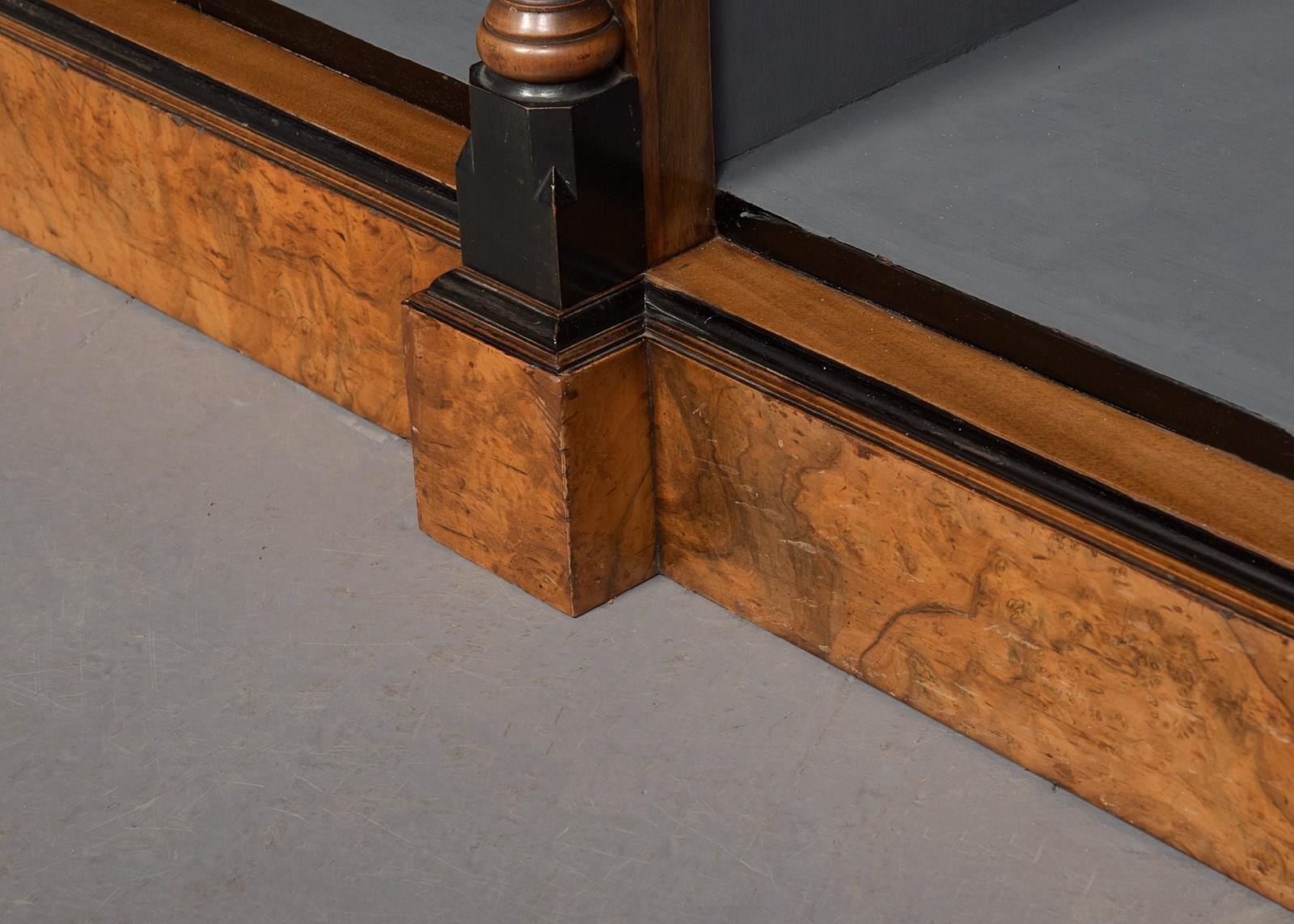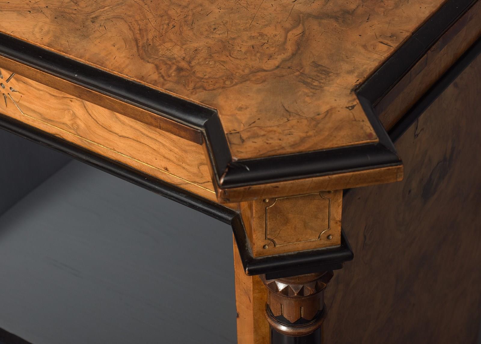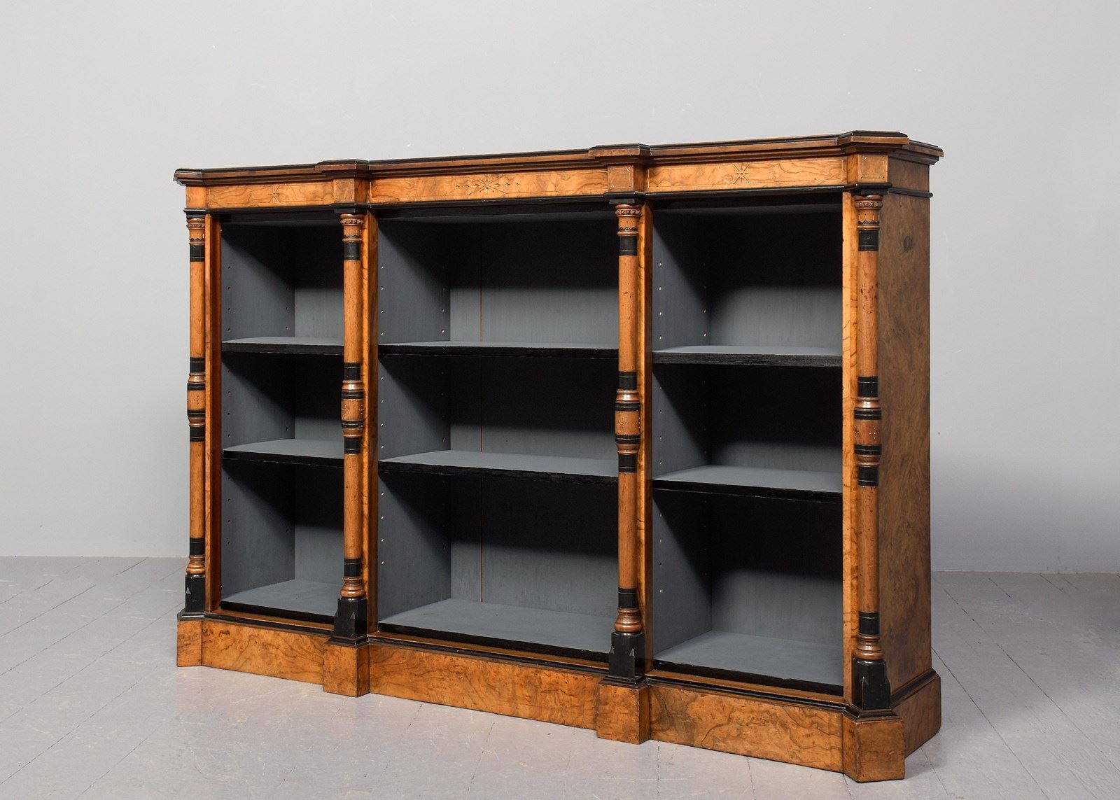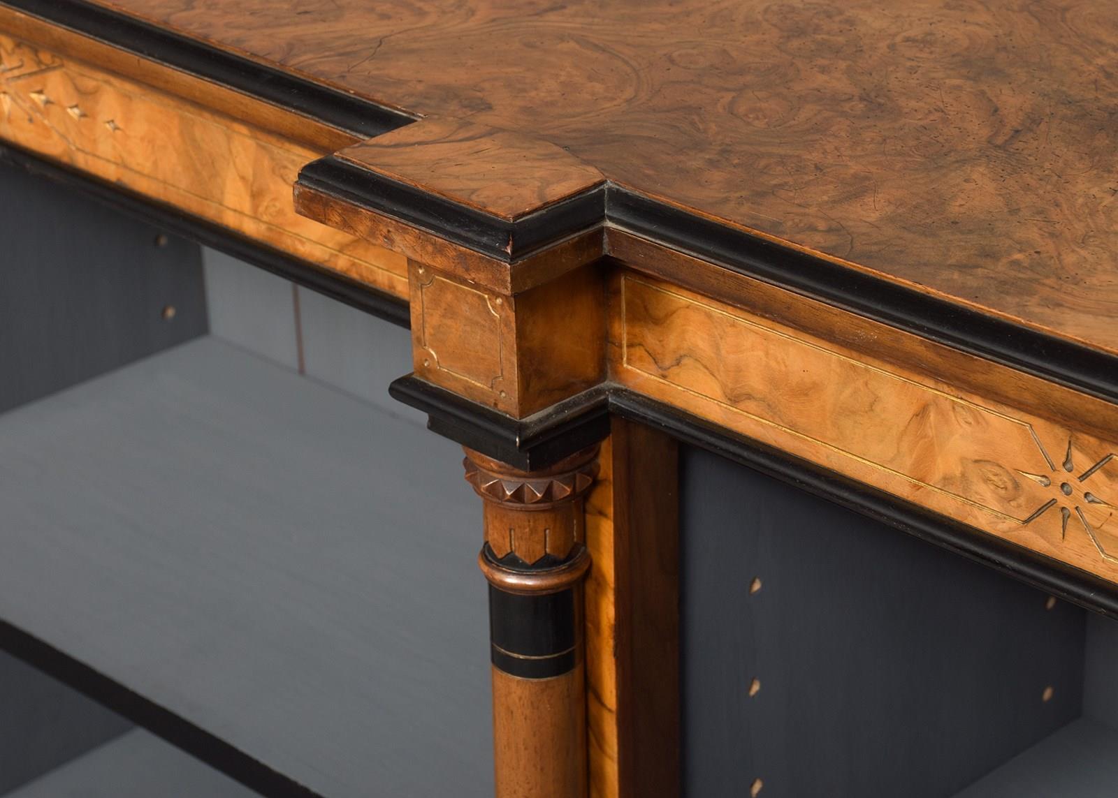 Circa 1880. Outstanding quality Arts and Crafts influence burr walnut three-section low, open bookcase. The top in mirror-matched burr walnut with beautiful figuring, canted sides and double breakfront sections, ebonized moulded fore edge, above a simple gilt carved frieze. Three open bookcase sections, each with two adjustable shelves flanked and separated by Arts and Crafts style pilasters with ebonized and ring turnings. All supported on a breakfront base. In excellent condition.