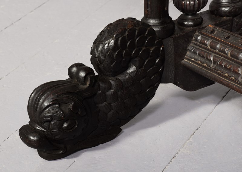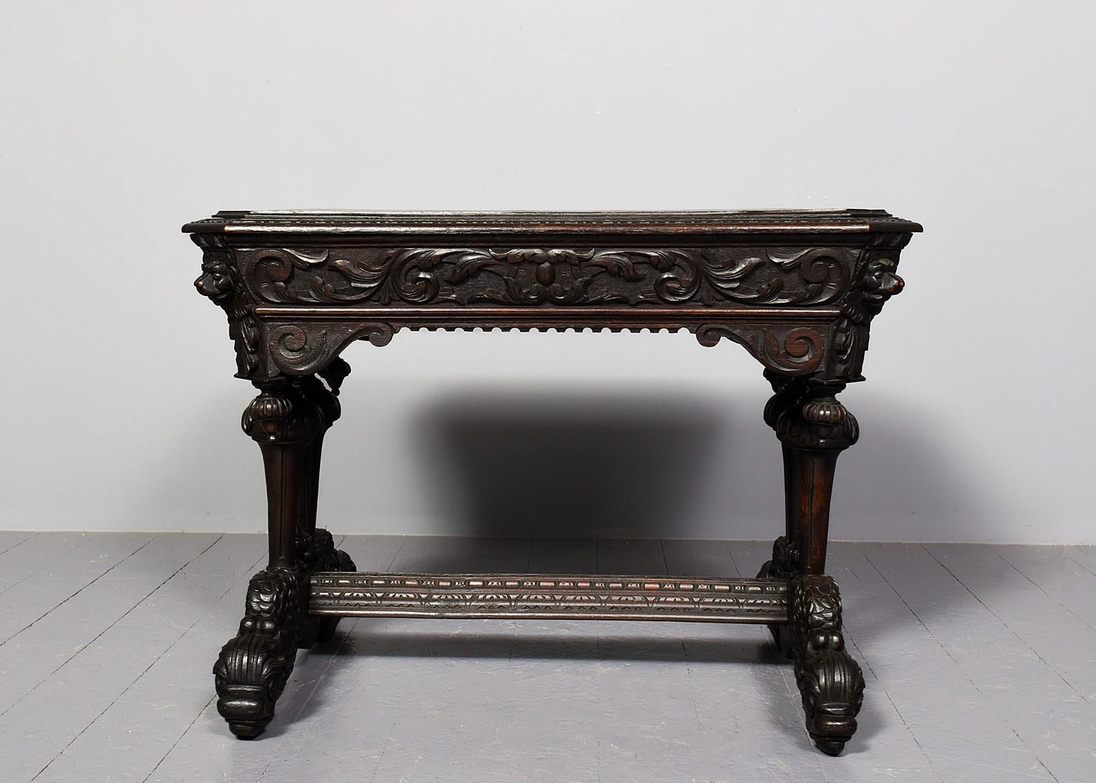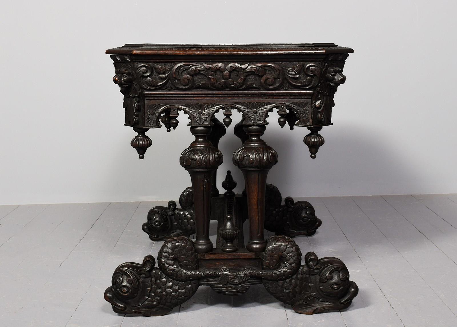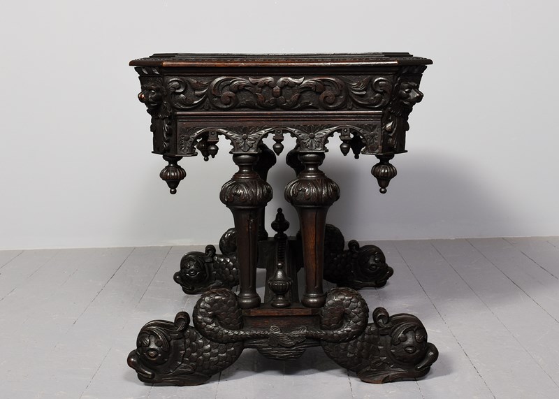 Circa 1870. A profusely carved Flemish oak dolphin table, the top with canted corners, moulded and carved fore-edge, the frieze with carved lion heads on each corner, a full length drawer on the front with scroll and a shaped handle, the back is finished with similar carving, resting on four carved circular tapering legs on a platform base, braced by a profusely carved stretcher with finials between the uprights, supported on four carved and entwined mythical sea dolphins, with the heads forming the feet braced by the scaled bodies.