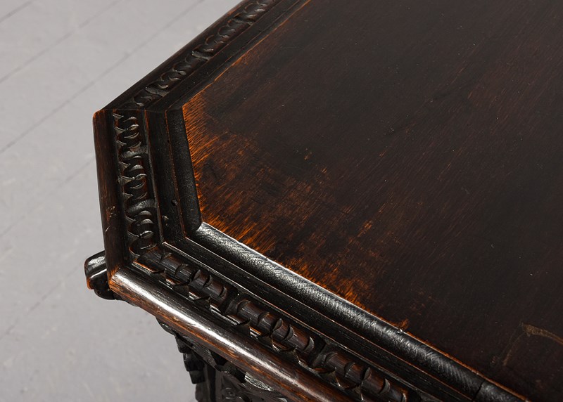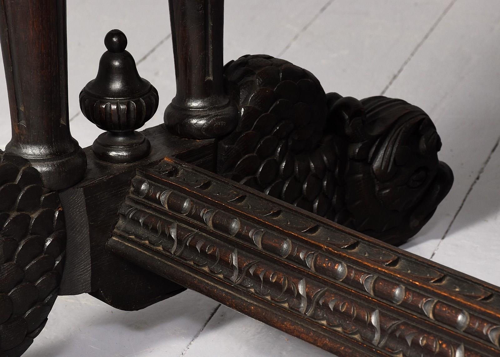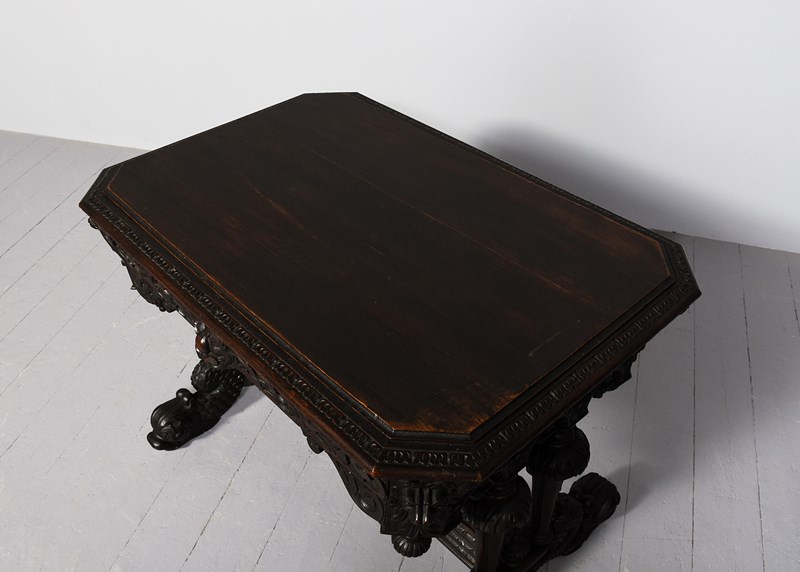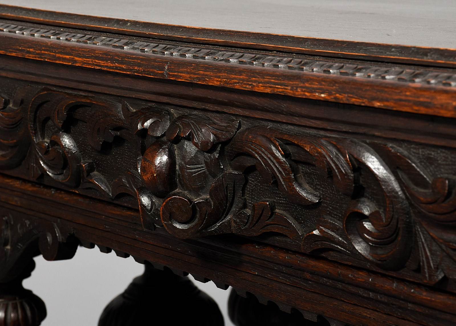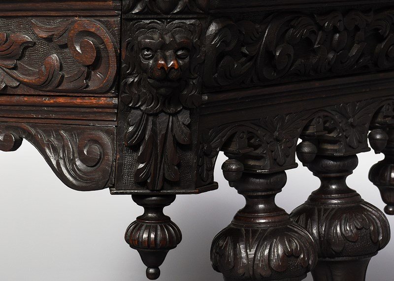 Circa 1870. A profusely carved Flemish oak dolphin table, the top with canted corners, moulded and carved fore-edge, the frieze with carved lion heads on each corner, a full length drawer on the front with scroll and a shaped handle, the back is finished with similar carving, resting on four carved circular tapering legs on a platform base, braced by a profusely carved stretcher with finials between the uprights, supported on four carved and entwined mythical sea dolphins, with the heads forming the feet braced by the scaled bodies.