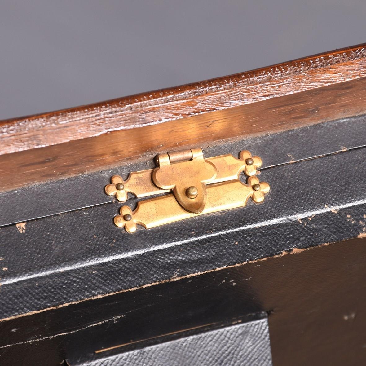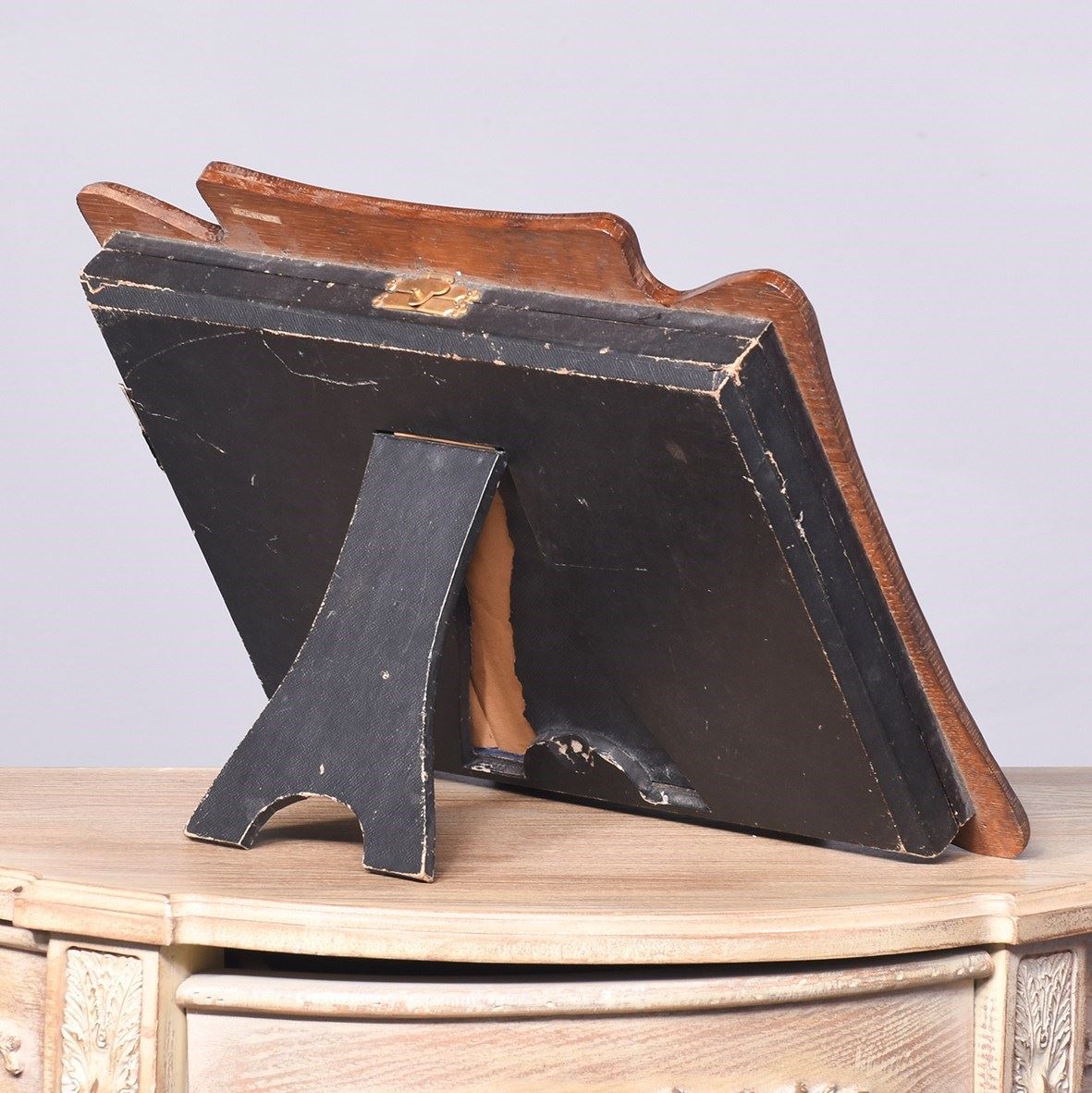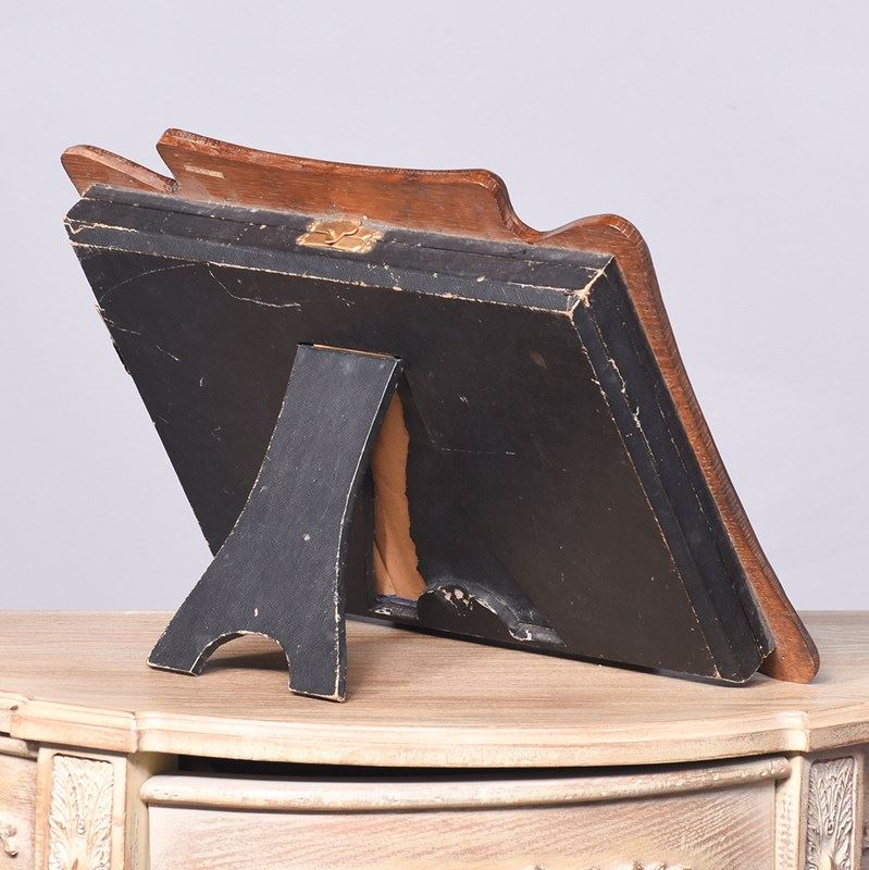 Circa 1890. Unusual stylish carved oak table top strut display frame, the solid oak frame carved with a raised top with a foliate carving on the sides and on the base, it retains its original bevel edged glass, inside is lined in fabric with a small peg at the bottom and clasp top for locking the frame in position, the back has is a pullout leg for standing upright.