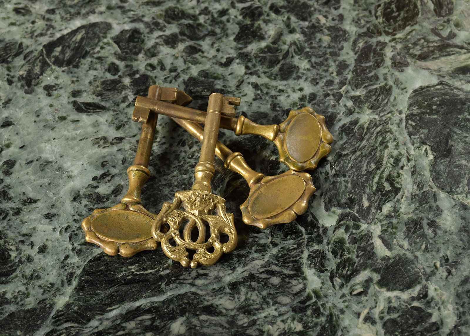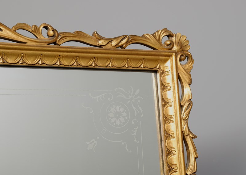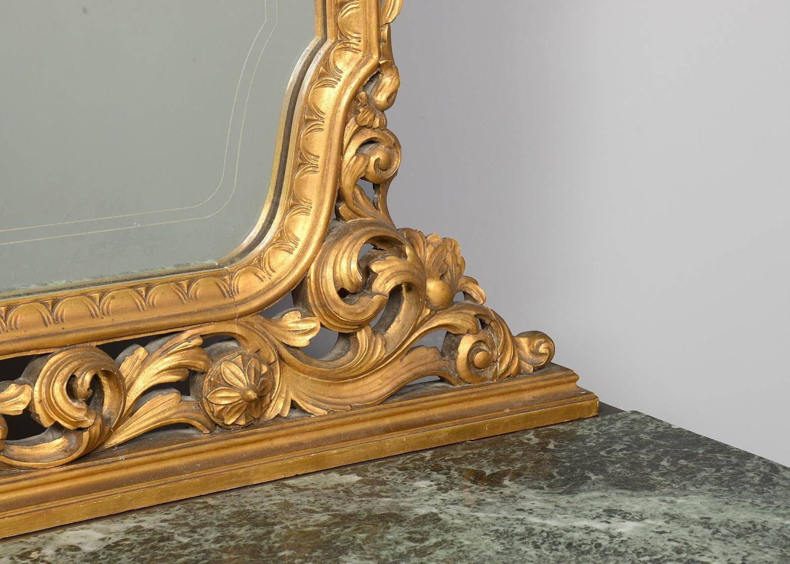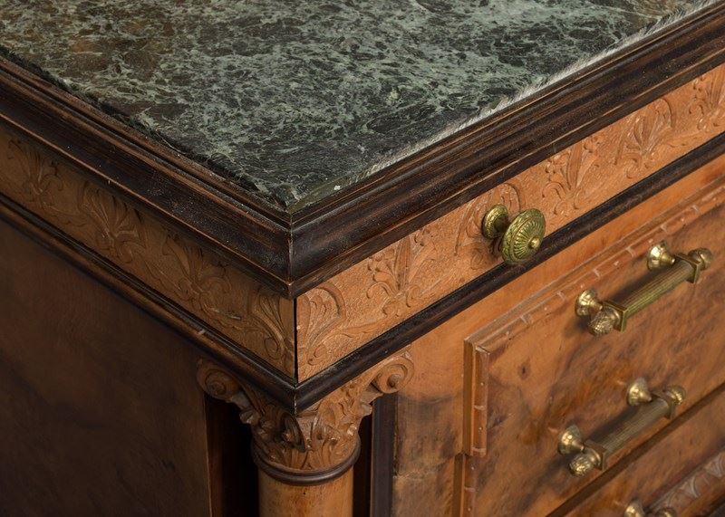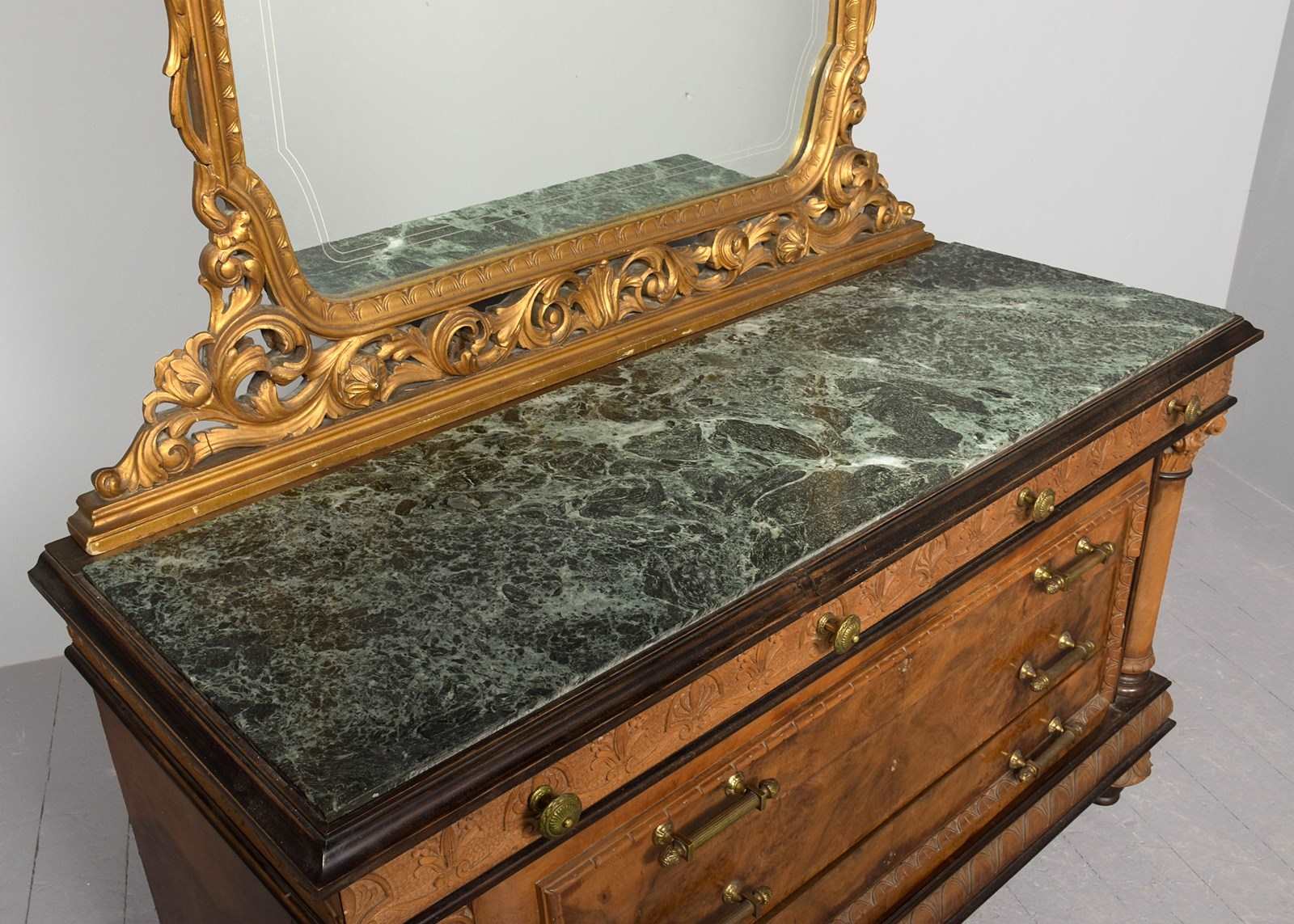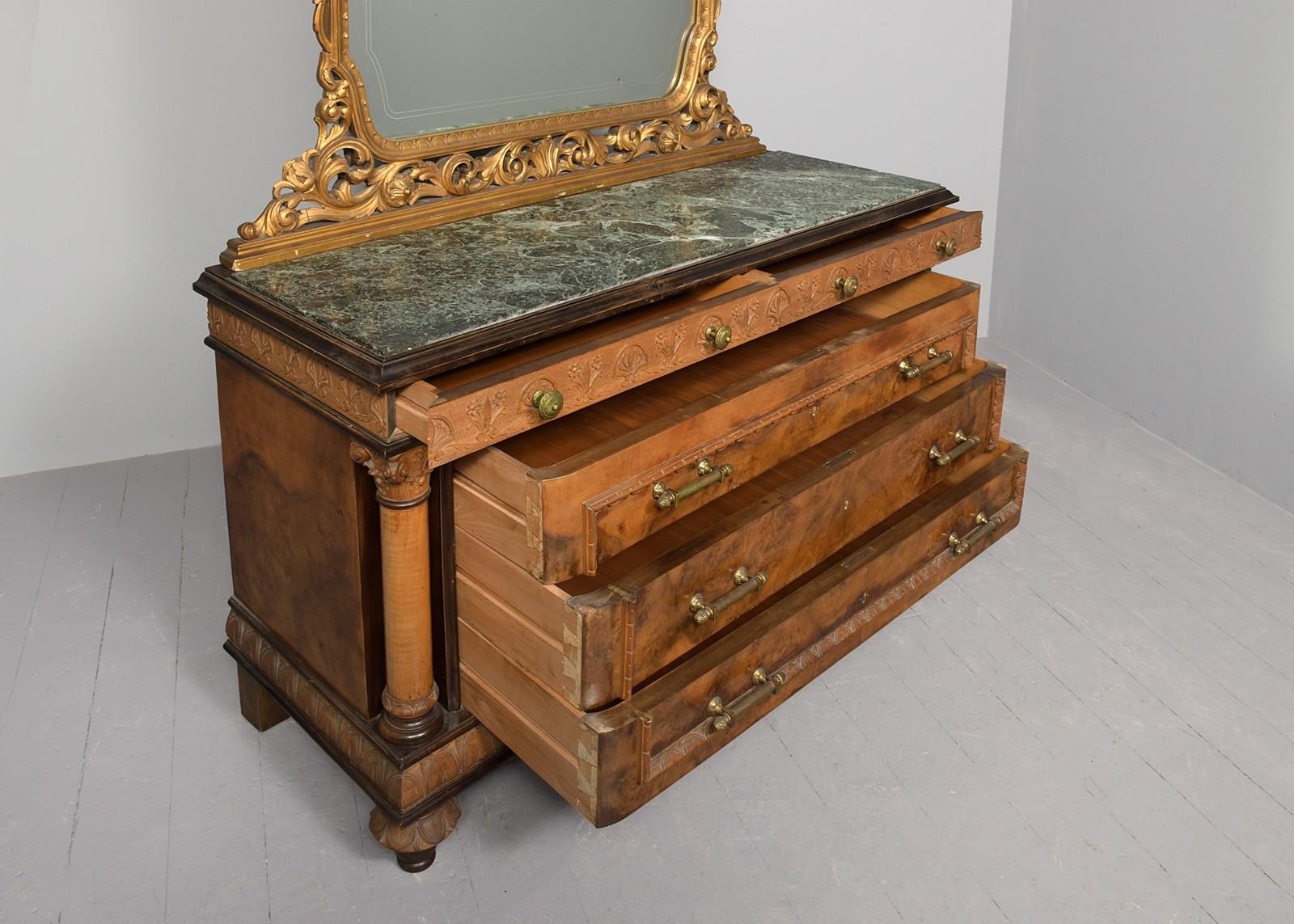 Circa 1920s. A finely carved gilded and marble-topped Italian dressing table, the back with a shaped and etched mirror contained in a carved, gilded and pierced frame, resting on a green mottled marble top, the carved frieze with two profusely carved drawers, below three full-length drawers with proud mouldings in book-matched burr walnut with heavy cast brass handles, the drawers with carved sides are flanked by a pair of Corinthian columns, the heavily carved base with beadings above and below, all resting on four carved walnut feet with an ebonized bun section beneath.