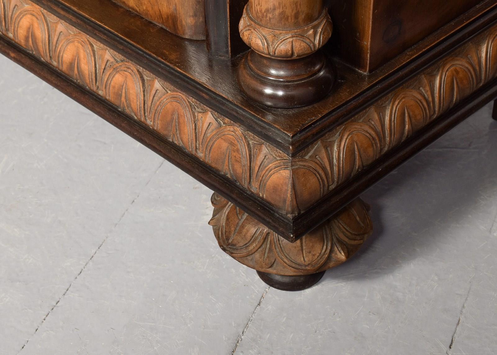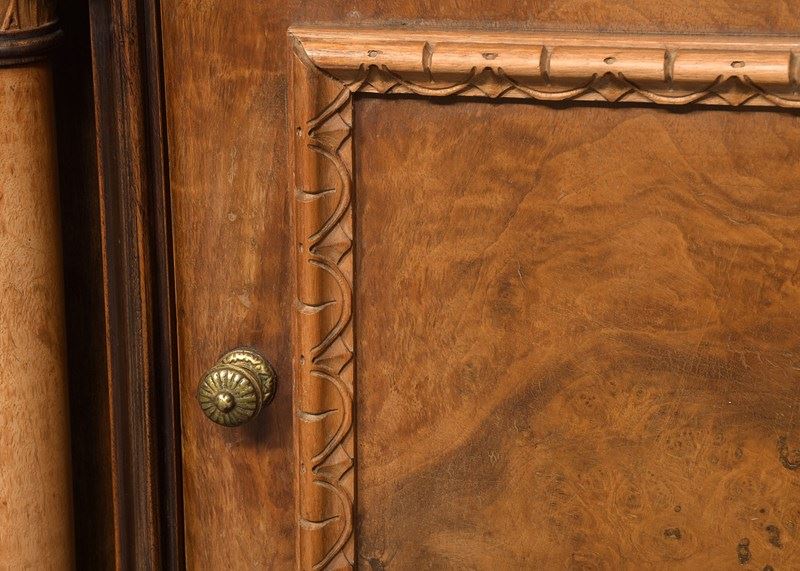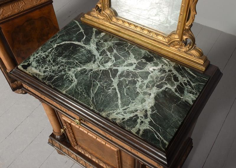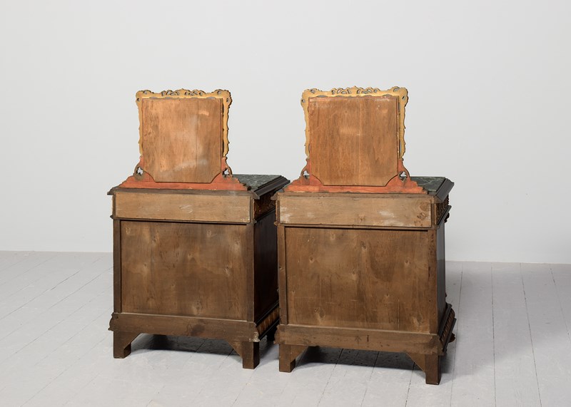 Circa 1930s. Very unusual stylish pair of carved walnut marble and gilded bedside pedestals, the tops with green mottled marble insert with a gilded frame mirror to the back, with etching on the mirror and gilded pierced frame with foliate carving, the front with a full-length drawer which is profusely carved with foliate carving which continues around the sides, beneath this a panel door flanked by a pair of Corinthian columns with carved capitals and bases, beneath with foliate carving on the front and sides, framed with a simple beading, resting on square legs at the back with a pair of carved turned and fluted legs to the front.