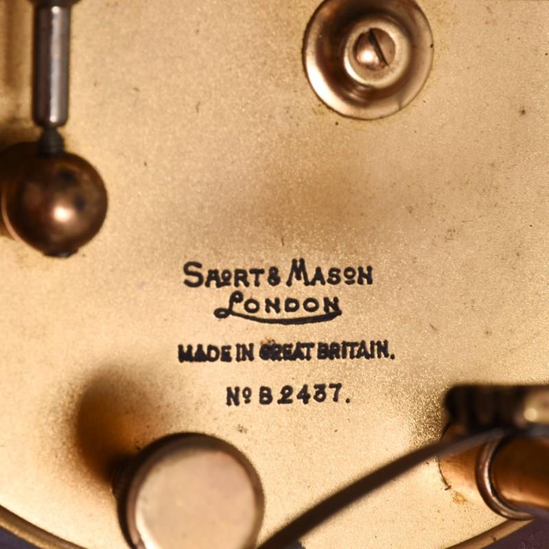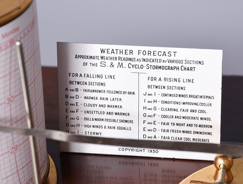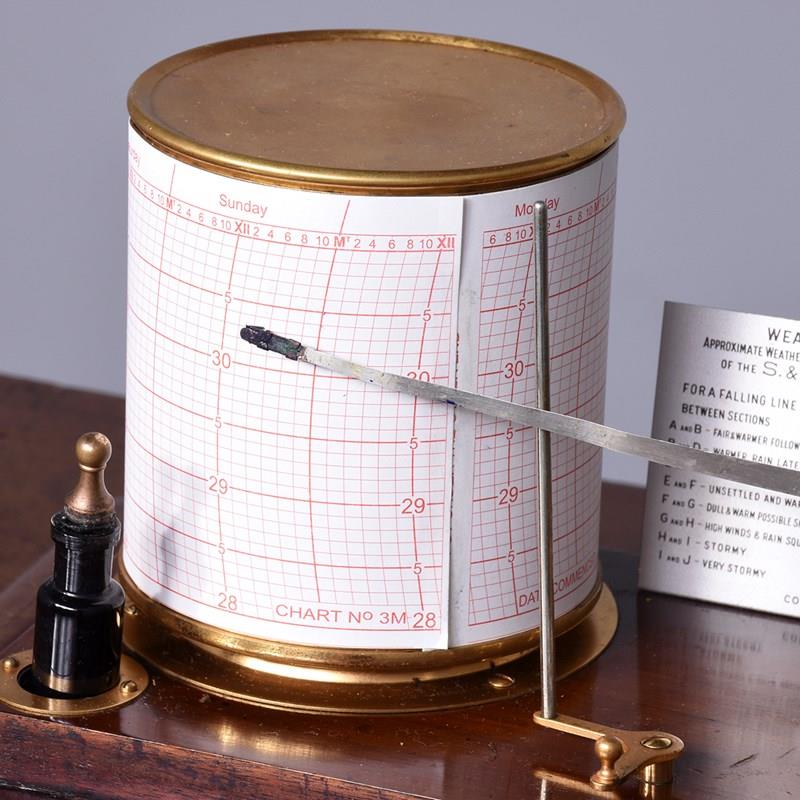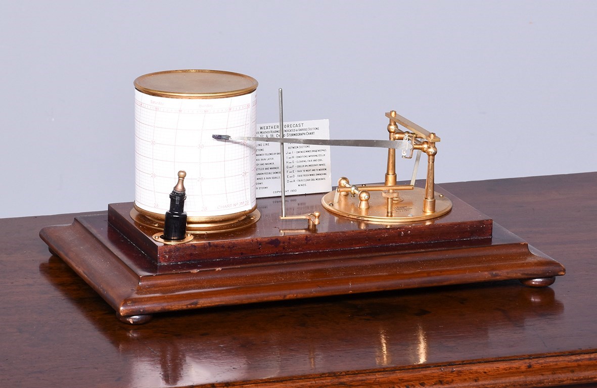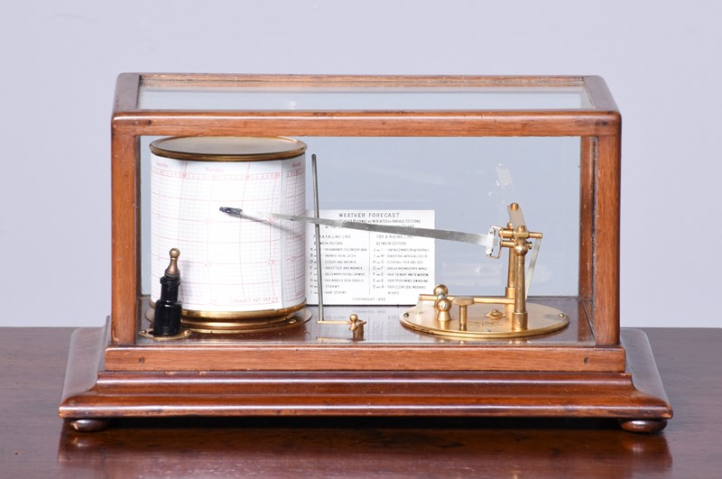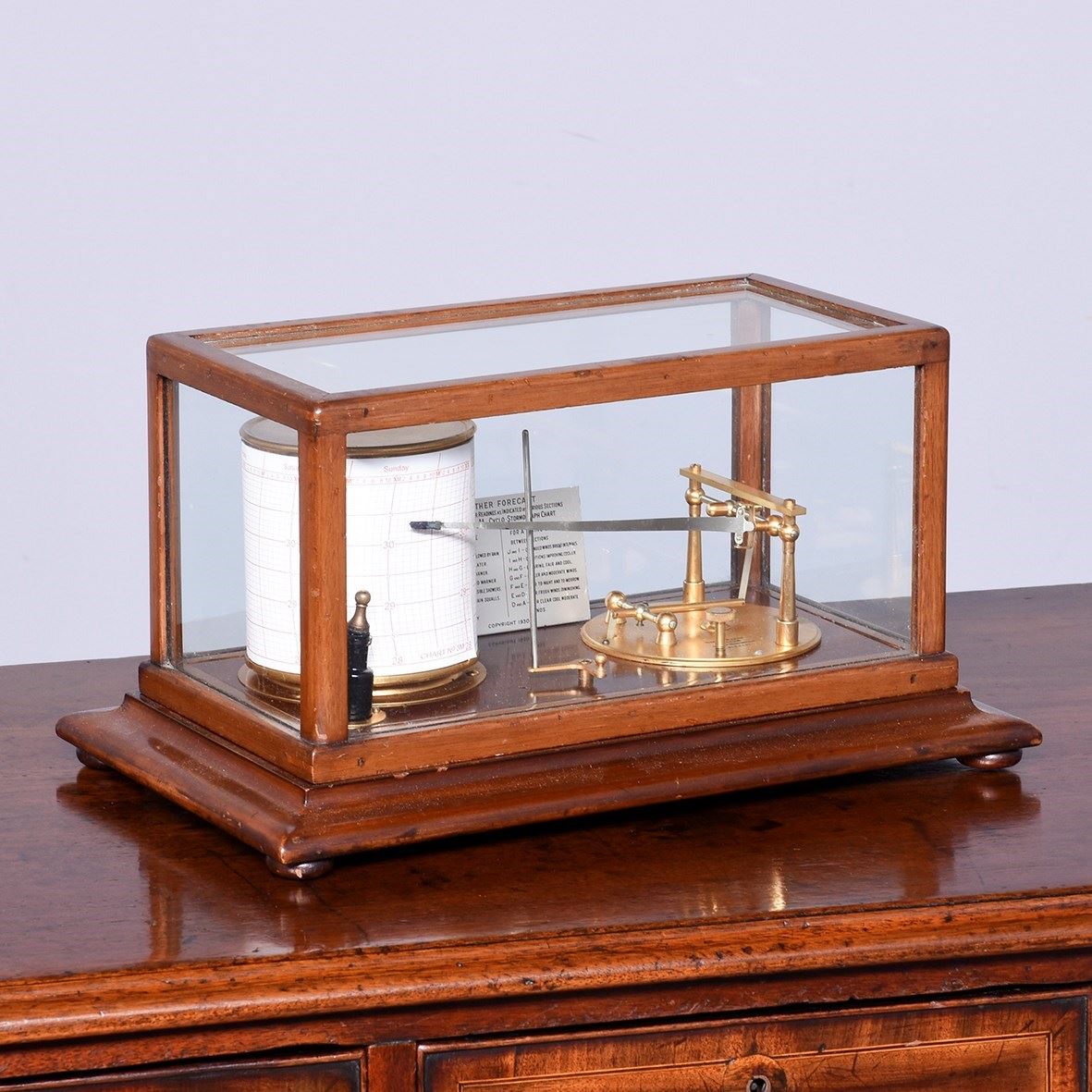 Circa 1930s. Mahogany cased barograph by’ Short & Mason of London’, contained in a mahogany frame glazed on five sides. The mechanism is in gilded brass and has recently been serviced and is working. The glass top lifts off the base for accessing the barograph, all sitting on a stylish mahogany base with ogee moulding and resting on four squat feet.