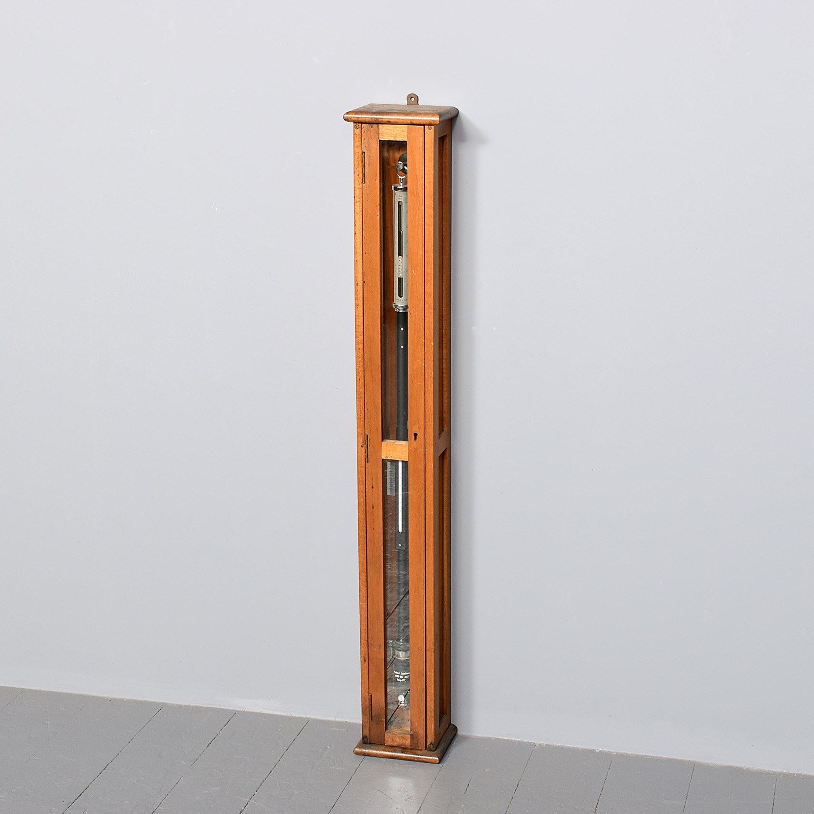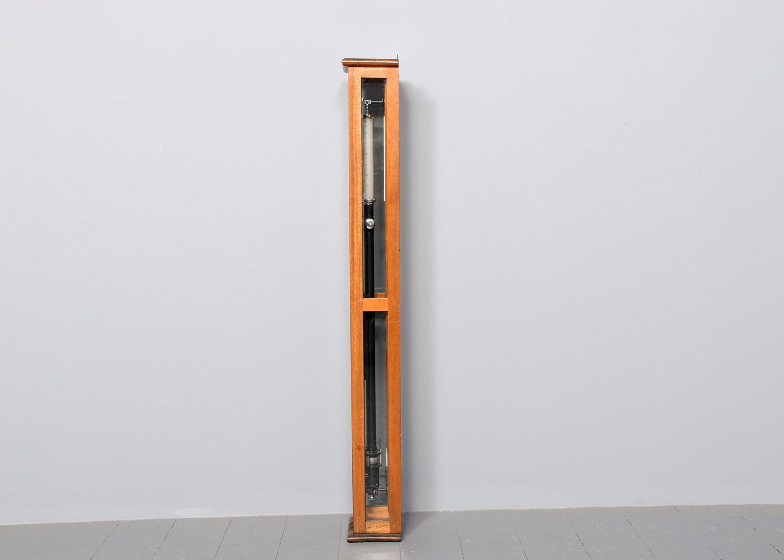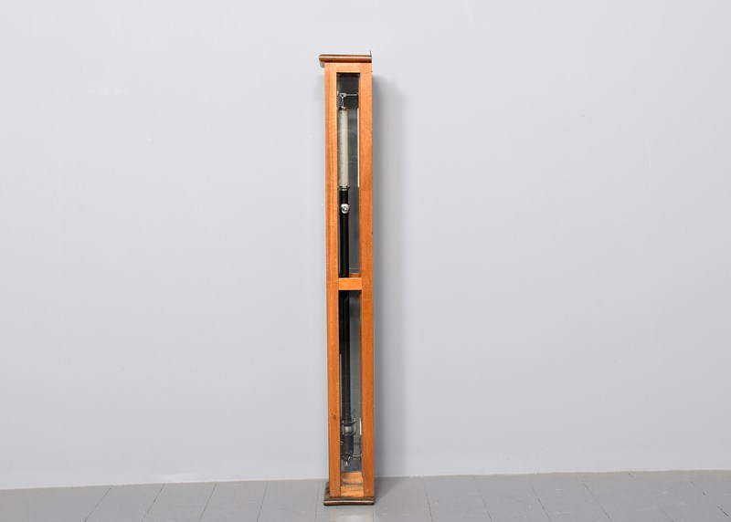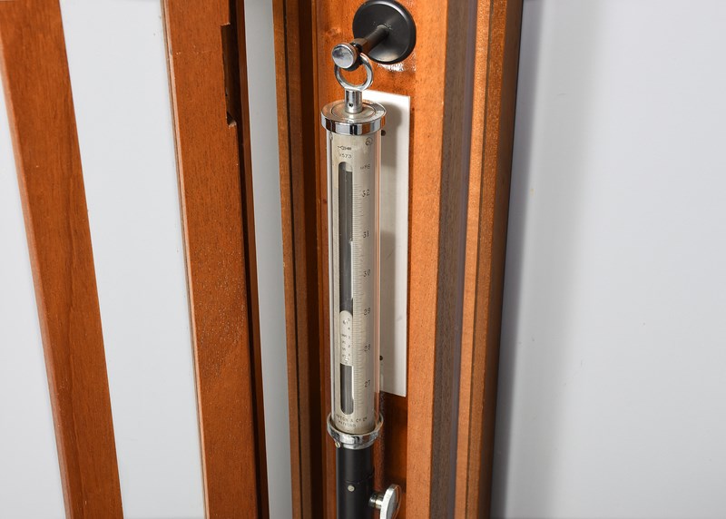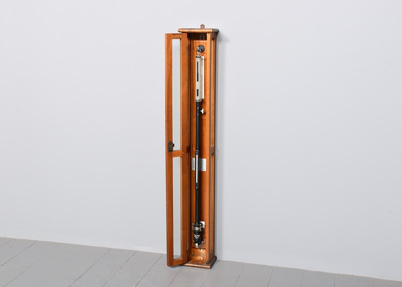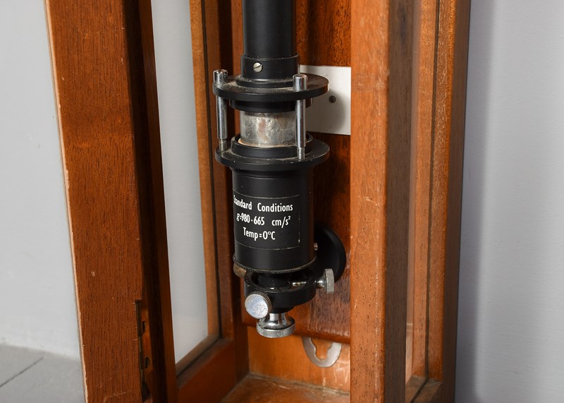 Circa 1930s. A cased industrial barometer/thermometer by 'F. Darton & Sons. Watford', the barometer with a circular glass and chrome top with the dials and mercury filled barometer showing, the ebonized metal body with thermometer on the front and reservoir in the bottom, mounted on a mahogany back plate contained within a three-sided glass hinged wall mounted case, the barometer has been calibrated recently.