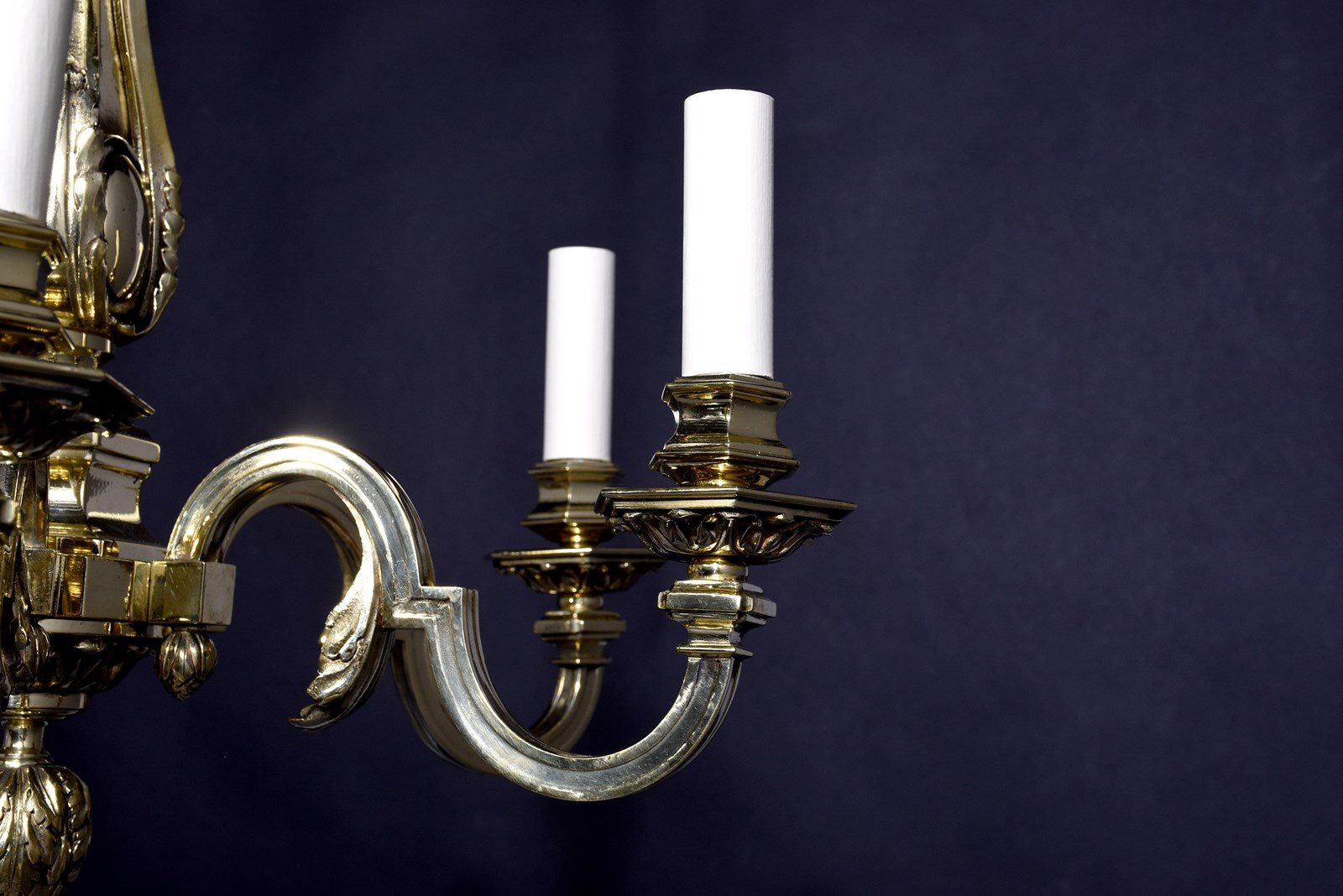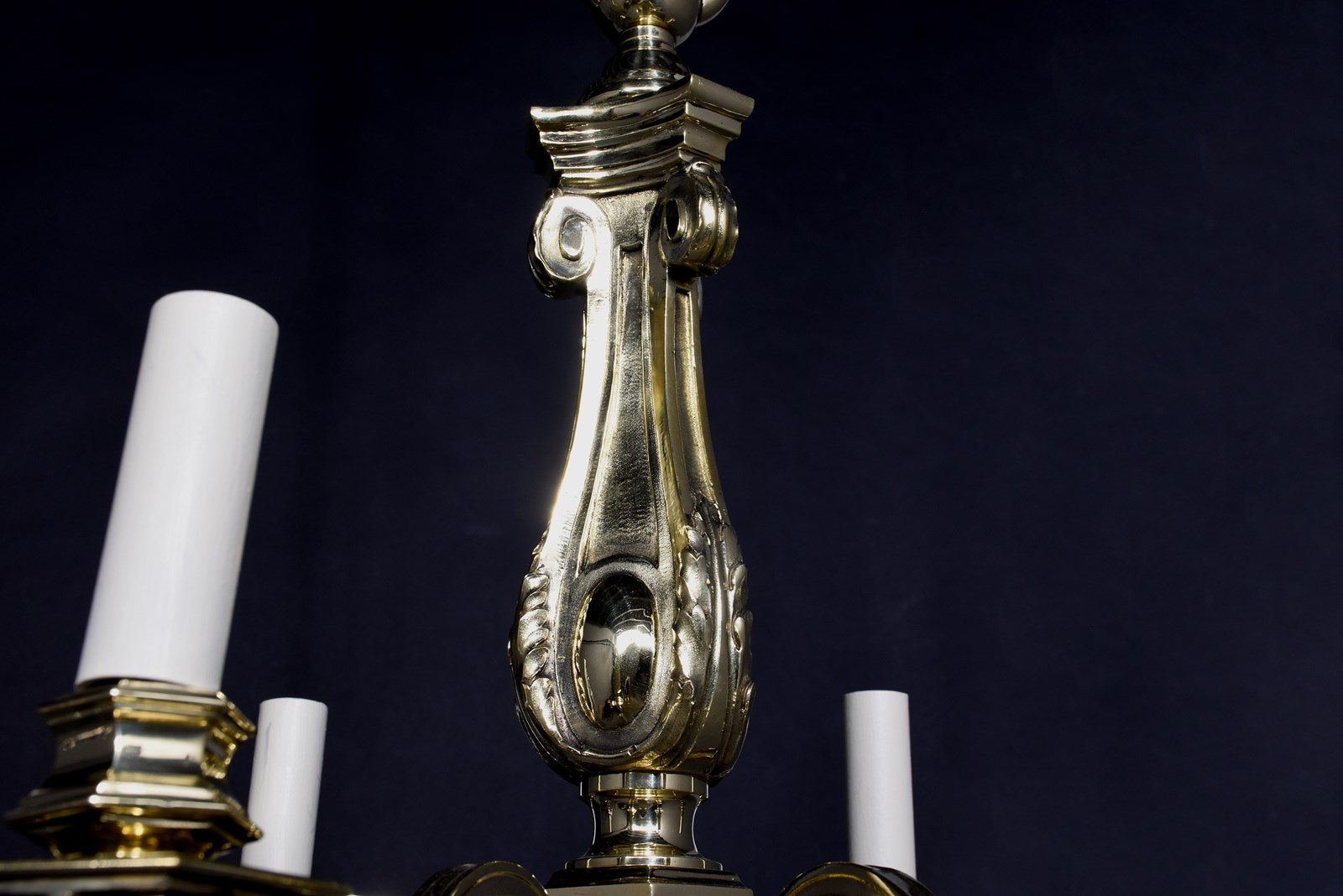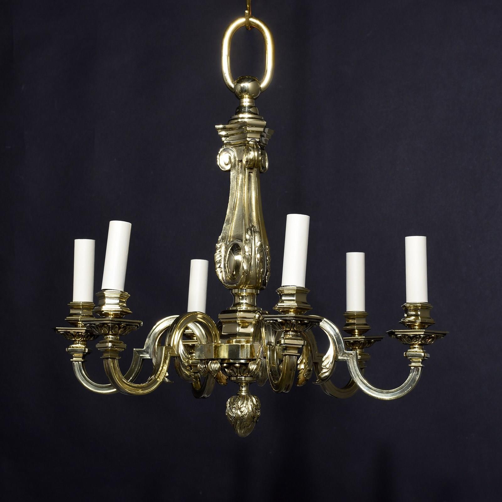Circa 1900. An exhibition quality cast brass chandelier, with the original cast brass ceiling fix and brass cast link chain, the top with a large oval loop, the tri-form body with foliate casting on the top and sides with oval lozenge sections towards the base, the hexagonal stem issuing 3 shaped arms with hexagonal drip trays with foliate carving to the outside, rising up the faux candle holders, the base with elegant downward facing large finial flanked by smaller ones, the stylish lamp has recently been cleaned and re-wired