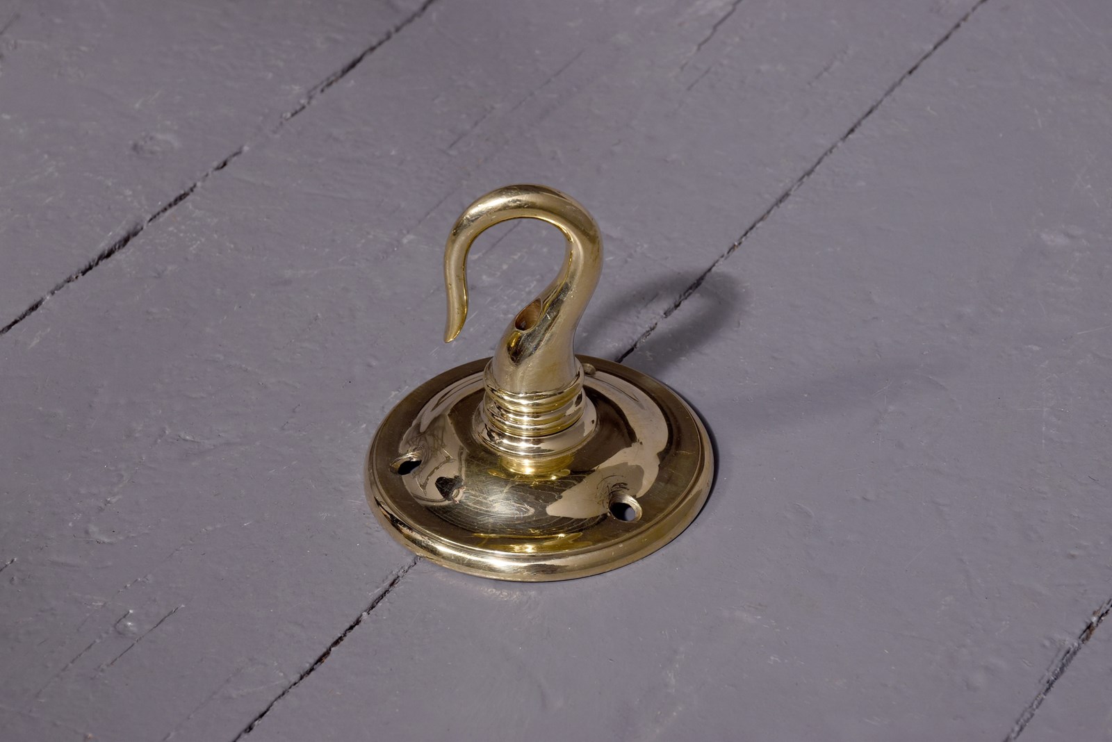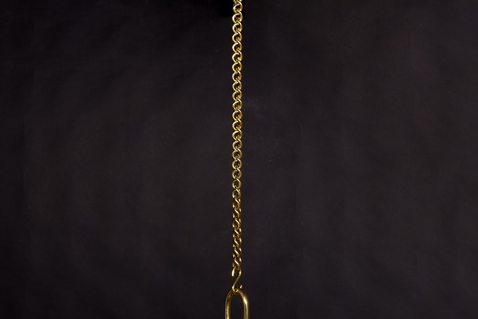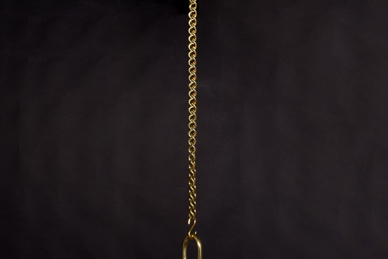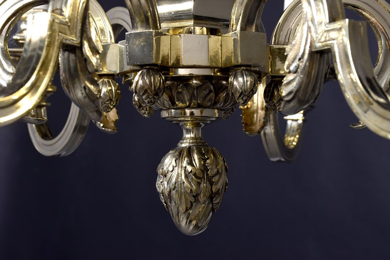 Circa 1900. An exhibition quality cast brass chandelier, with the original cast brass ceiling fix and brass cast link chain, the top with a large oval loop, the tri-form body with foliate casting on the top and sides with oval lozenge sections towards the base, the hexagonal stem issuing 3 shaped arms with hexagonal drip trays with foliate carving to the outside, rising up the faux candle holders, the base with elegant downward facing large finial flanked by smaller ones, the stylish lamp has recently been cleaned and re-wired