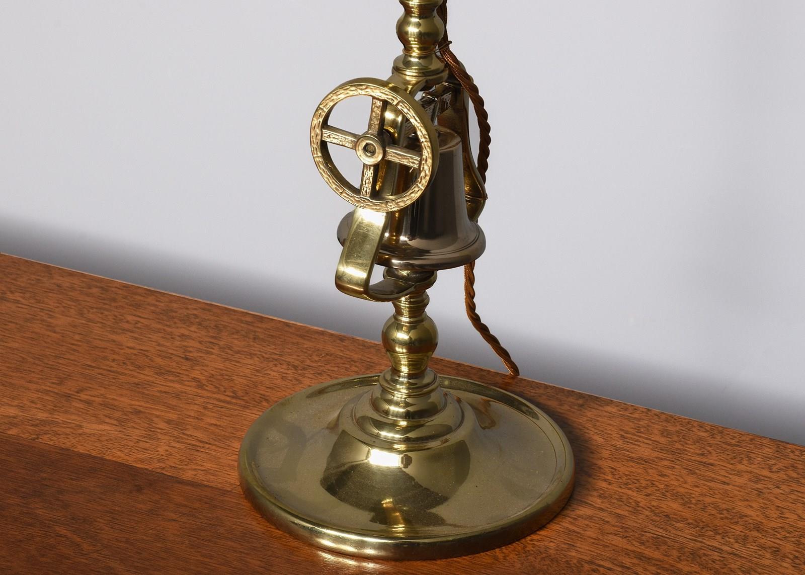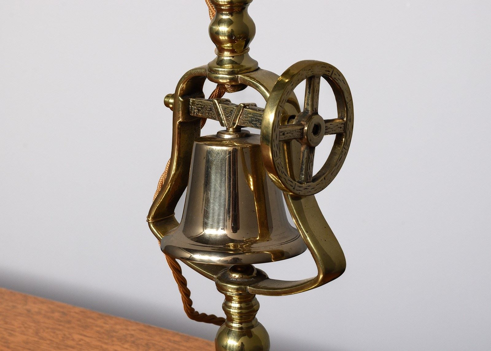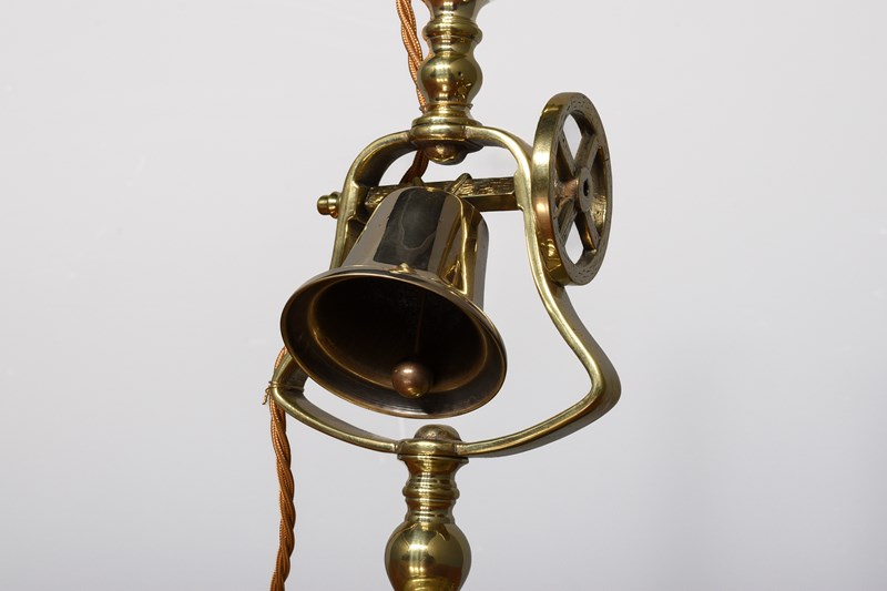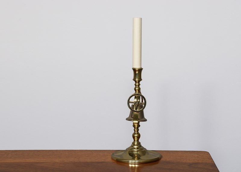 Circa 1860. Mid-Victorian cast brass tavern bell candle stick (recently converted to electricity), the top surmounted with a large faux candle resting on the brass nozzle, beneath this there is a small brass wheel in faux wood pattern and a bell supported on a faux beam, when the wheel rotates it rings the bell, contained in a frame in the form of a bell, supported on a simple brass stem on a large dished base.