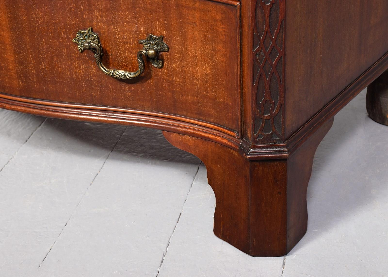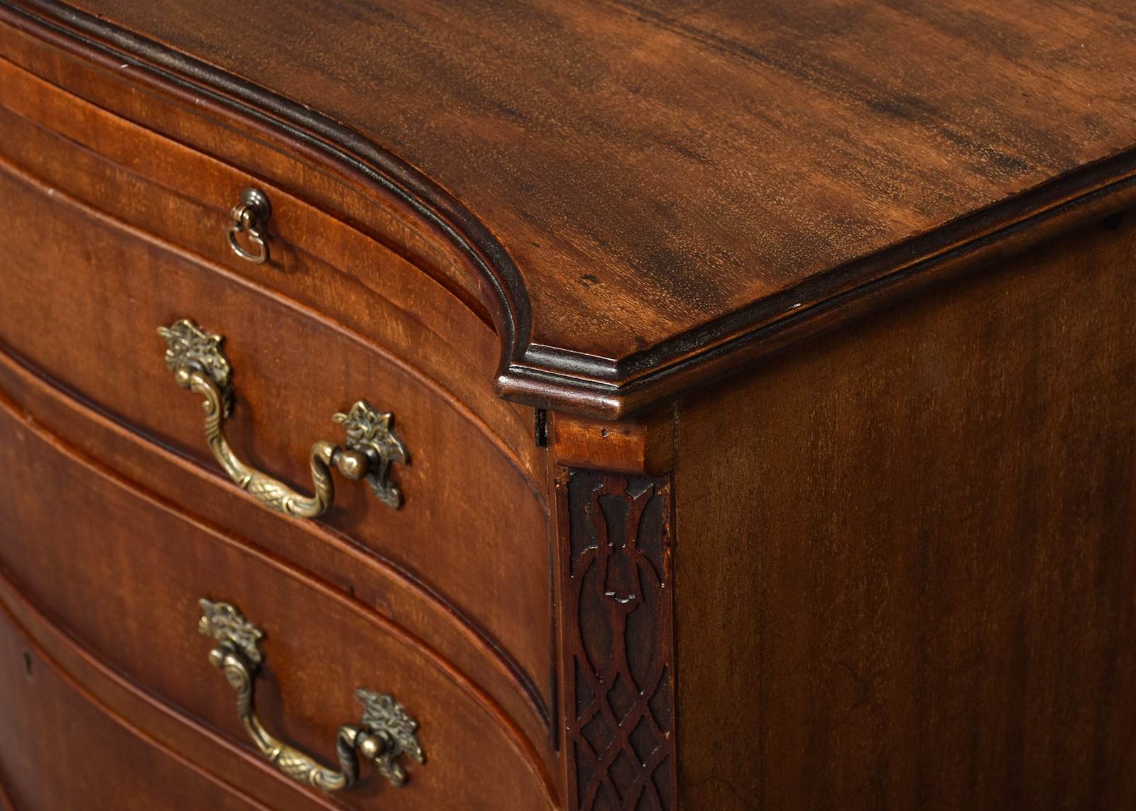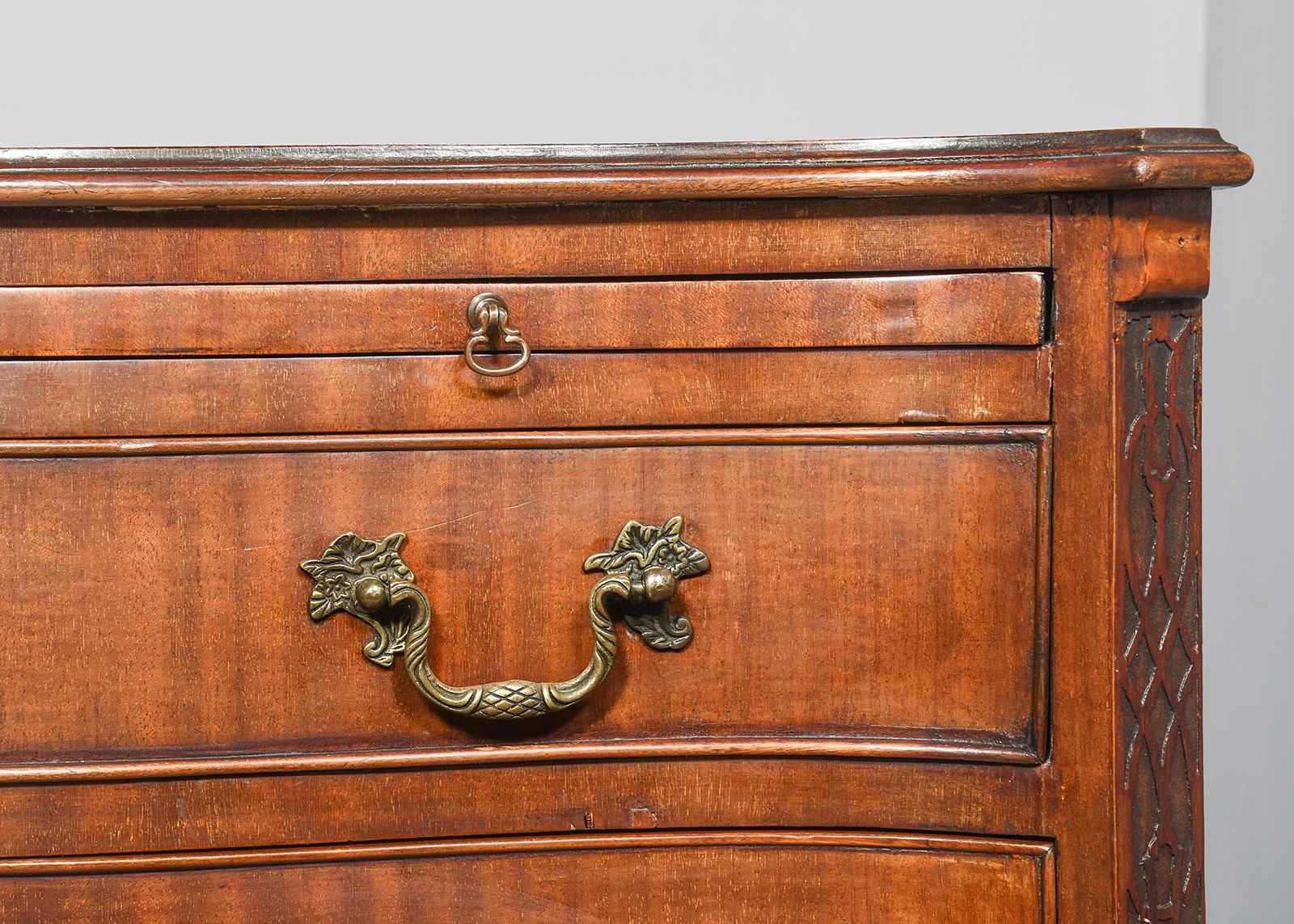 Circa 1900. Chippendale-style neat-sized, serpentine front mahogany chest of drawers. The single-piece figured mahogany serpentine front top above a mahogany slide with brass axe head handles and four cock-beaded, graduated drawers with cast brass engraved swan neck handles and solid oak drawer linings. The canted sides with blind fretwork decoration and all supported on a small, moulded base with shaped bracket feet.