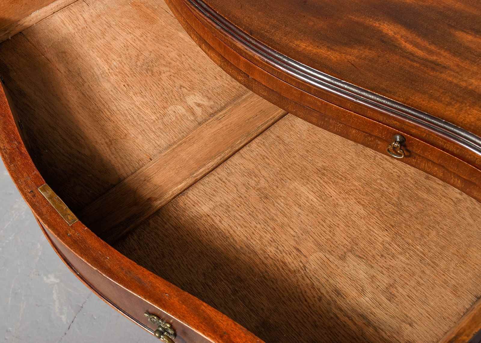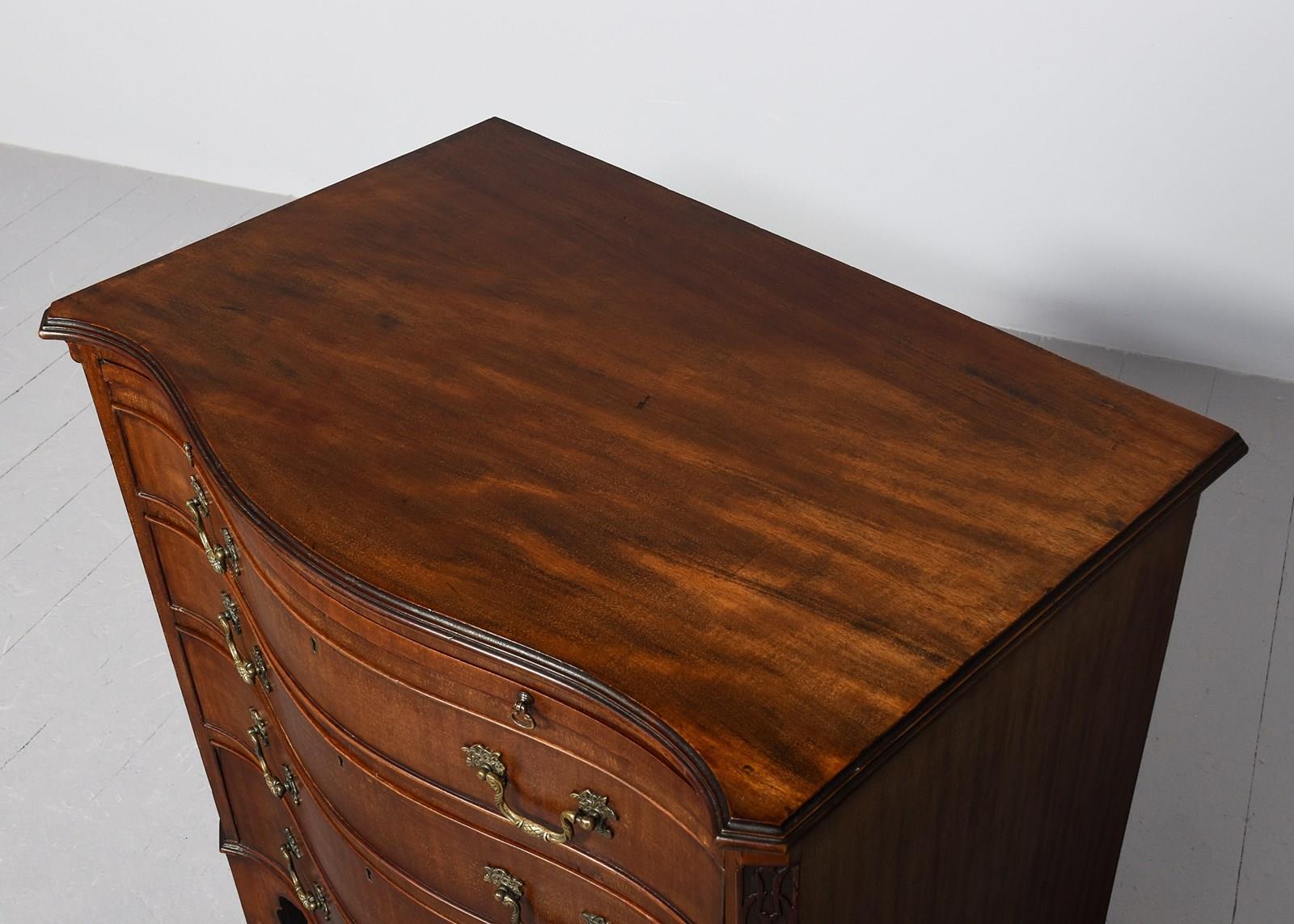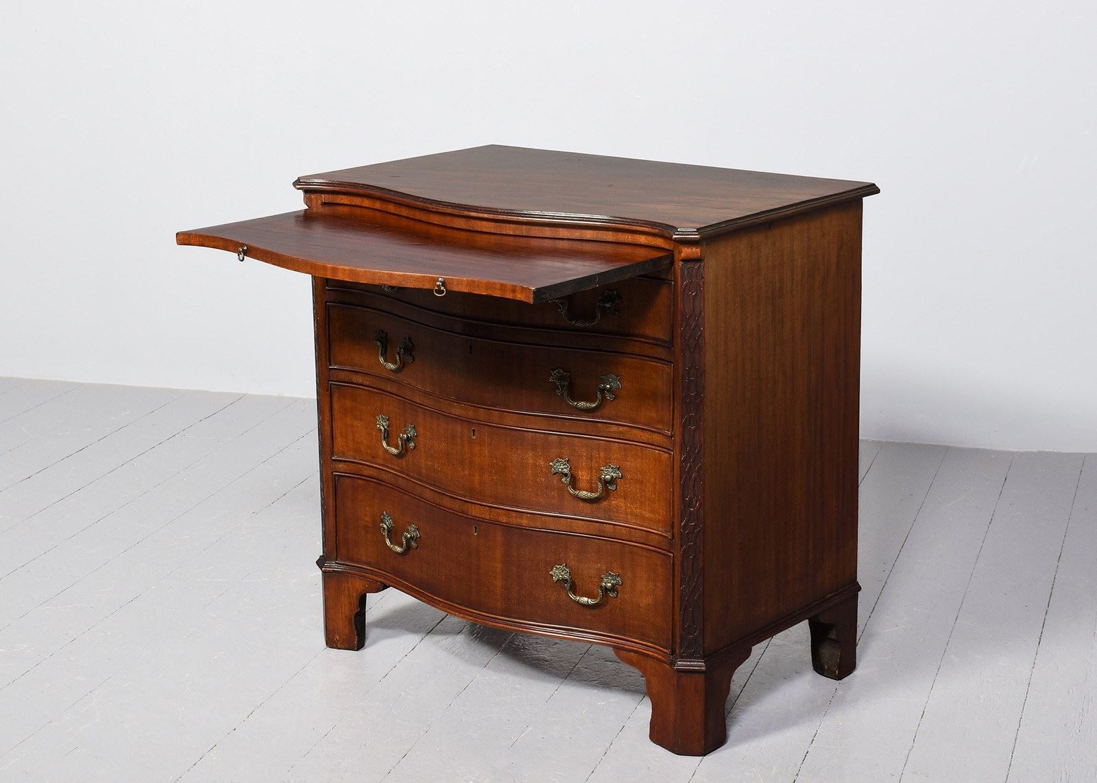 Circa 1900. Chippendale-style neat-sized, serpentine front mahogany chest of drawers. The single-piece figured mahogany serpentine front top above a mahogany slide with brass axe head handles and four cock-beaded, graduated drawers with cast brass engraved swan neck handles and solid oak drawer linings. The canted sides with blind fretwork decoration and all supported on a small, moulded base with shaped bracket feet.