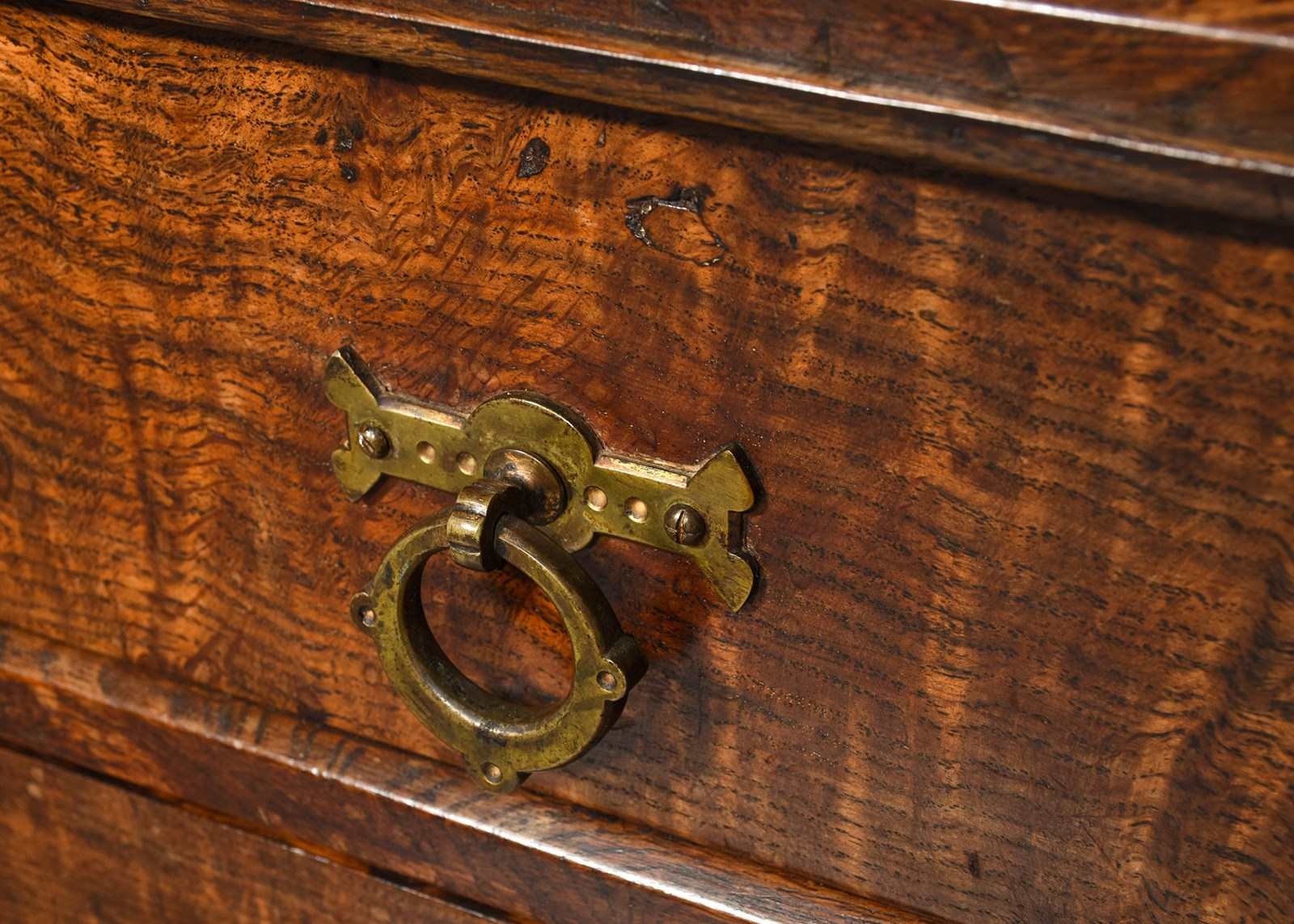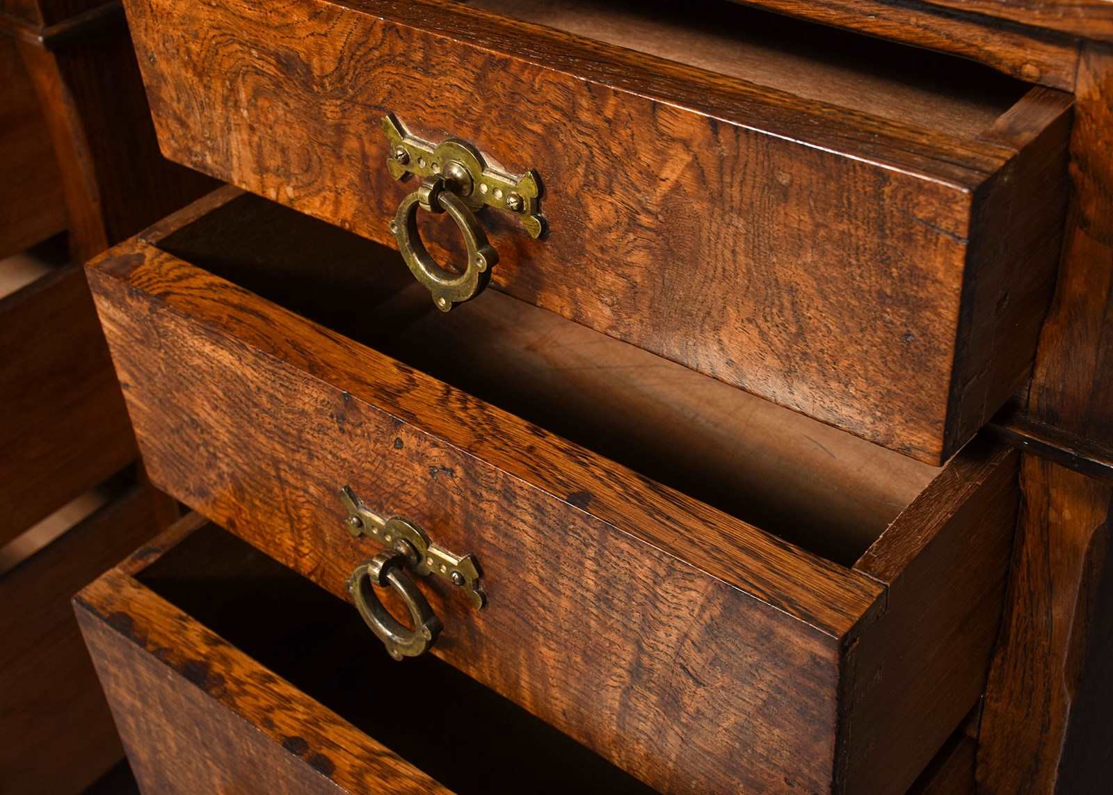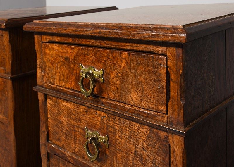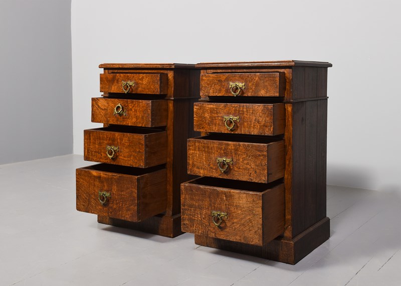 The tops in an unusual figured pollard oak with moulded edges above four graduated drawers with Art and Crafts brass handles and mahogany drawer linings (sign of quality). The corners with Arts & Crafts chamfering, and sitting on enclosed plinth bases.