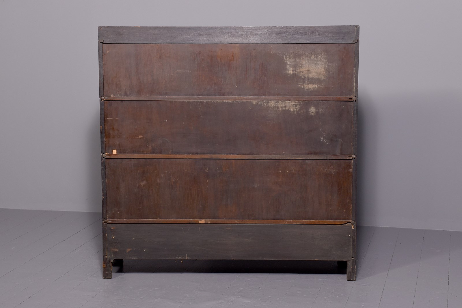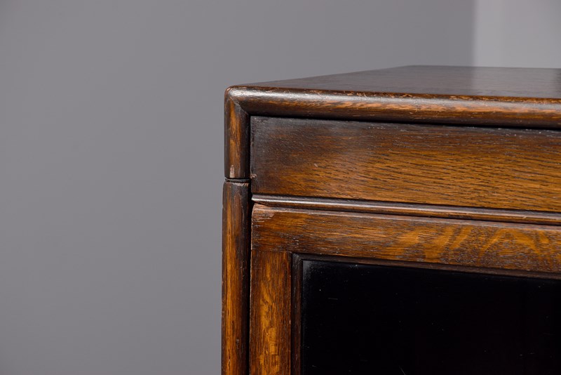 Circa 1900. A three-tier oak section bookcase, the polished top with a moulded fore-edge and simple frieze, the front with three pairs of double-glazed doors, each has a pair brass knob handle, beneath the bottom door is a pair of oak drawers each with cast brass D shaped handles, resting on square legs at the back and a ball and claw foot at the front, comes in 5 sections.