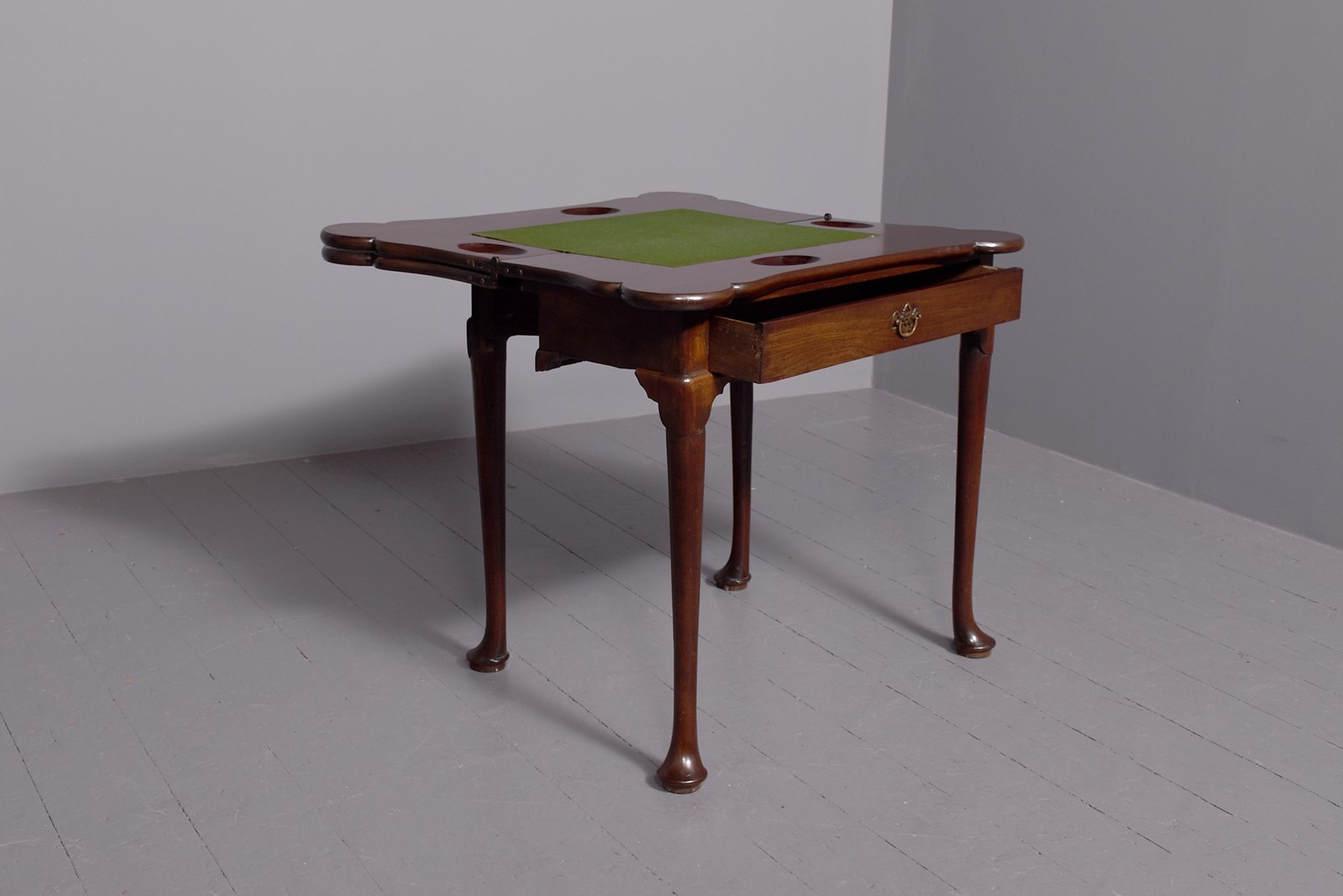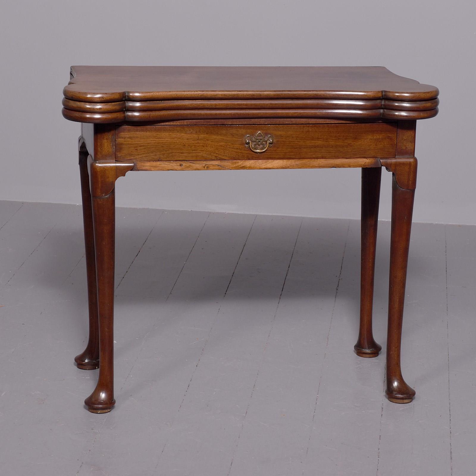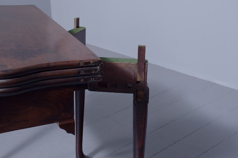 Circa 1760 an early George III mahogany triple top card tea games table, the shaped tops are hinged, inside the first one is a polished mahogany surface(tea table), the second one is lined in baize(card table) with four oval guineas wells, the two back legs are hinged and swing out to support the tops when open, the simple frees at the front with a full length drawer, all resting on four lapped club legs finishing on a simple pad foot.