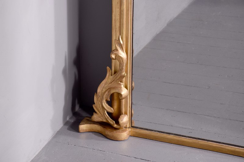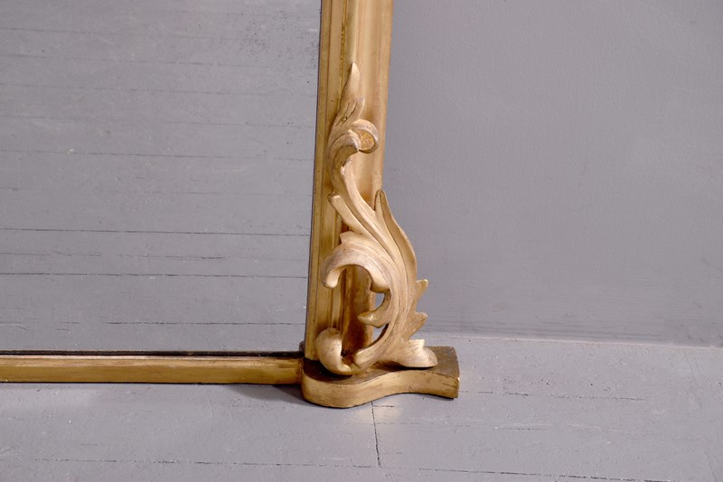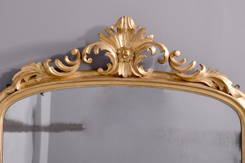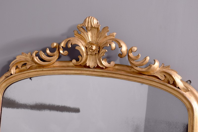 Circa 1860. An early Victorian carved and gilded over mantle mirror, the rectangular shaped mirror with domed top with applied carved and gilded section including a wonderful canopy centered by a flower-head with a carved foliate canopy section with curvaceous scrolling to the sides, the base with two small extensions with applied gilded foliate carving, the frame retains its original water gilding and mercury mirror plate with foxing towards the top and speckled throughout.