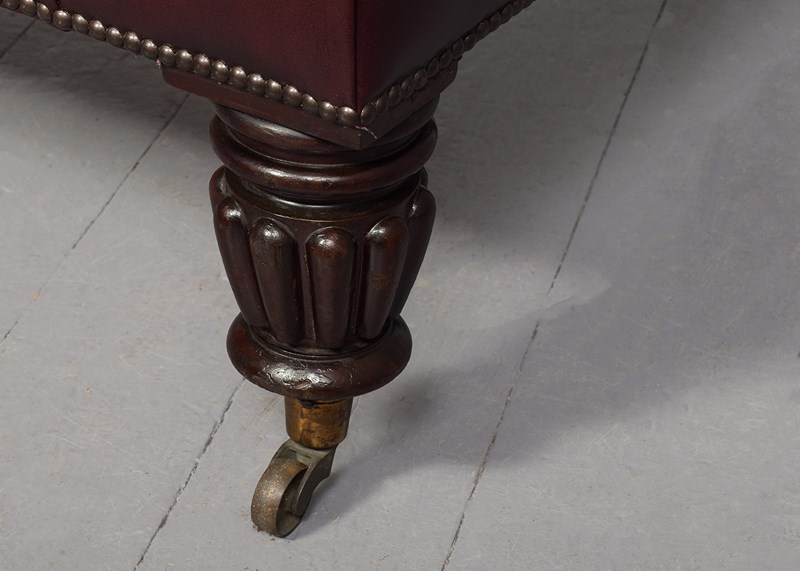 Circa 1830 with adaptations. Early Victorian, unusual, large mahogany-framed buttoned leather stool. The rectangular top with deep buttoned quality burgundy hide with brass studding, supported on stylish fluted and turned legs with original brass caps and castors. Rare item, in excellent condition.