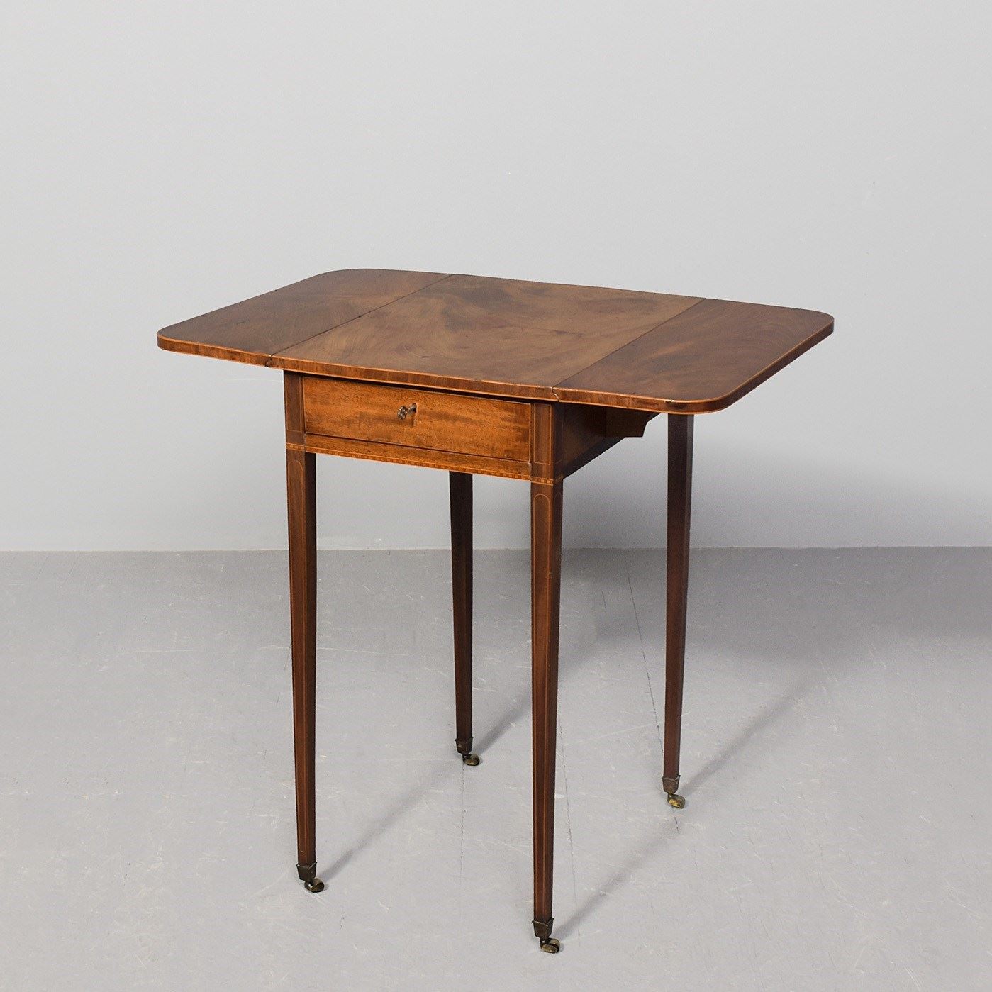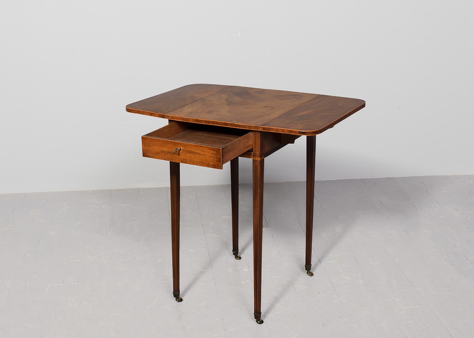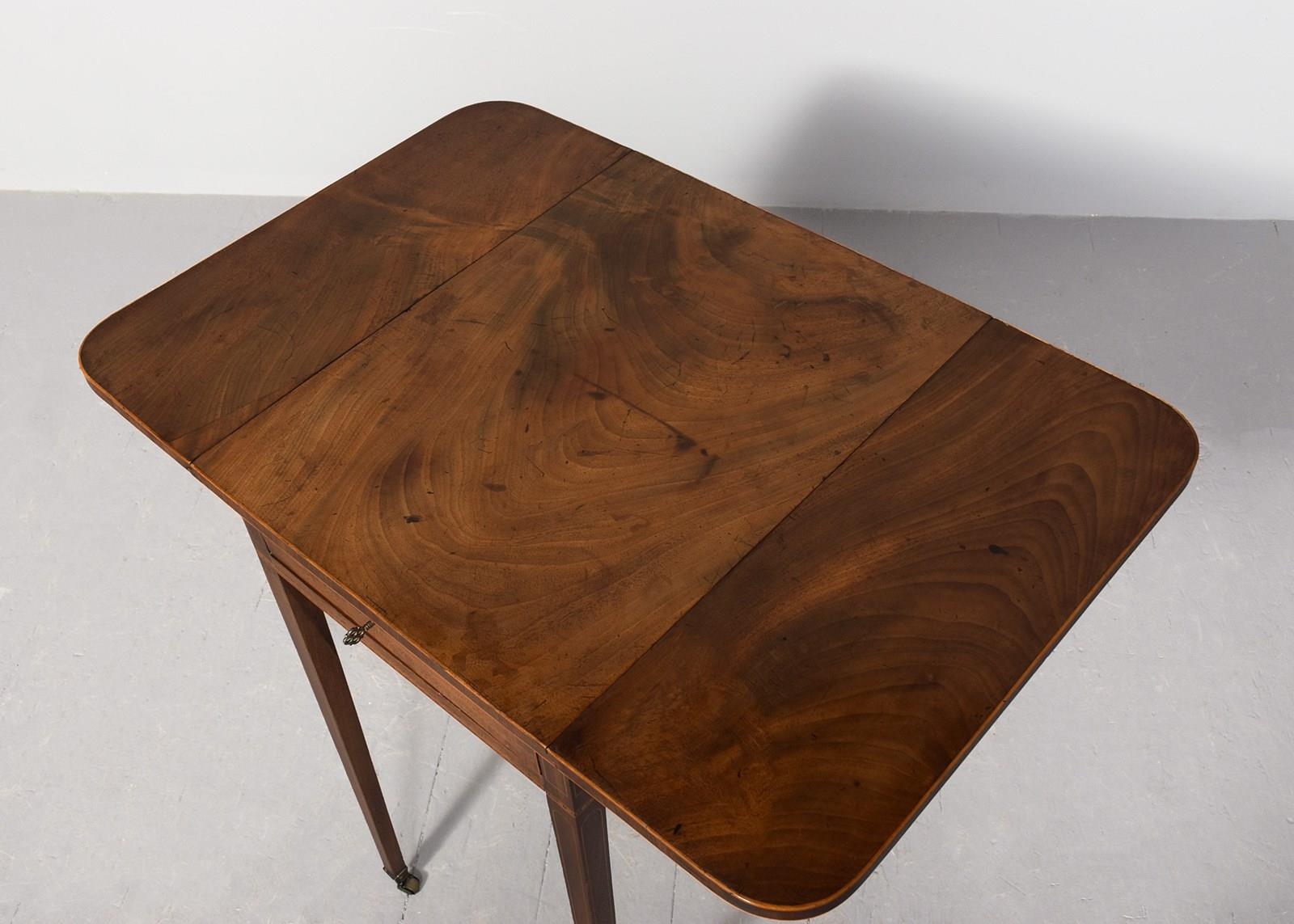 Circa1810. A late George III mahogany Pembroke/work table by 'Bruce and Burns of Edinburgh'. The diminutive table with finely figured mahogany top with string inlay, two flaps with rounded corners, held open by wooden hinges, with a full-length drawer with a heraldic escutcheon, the top of the drawer with the name clearly stamped, beneath the drawer, there is a chequered inlay, resting on four elegant square tapering legs with string inlay