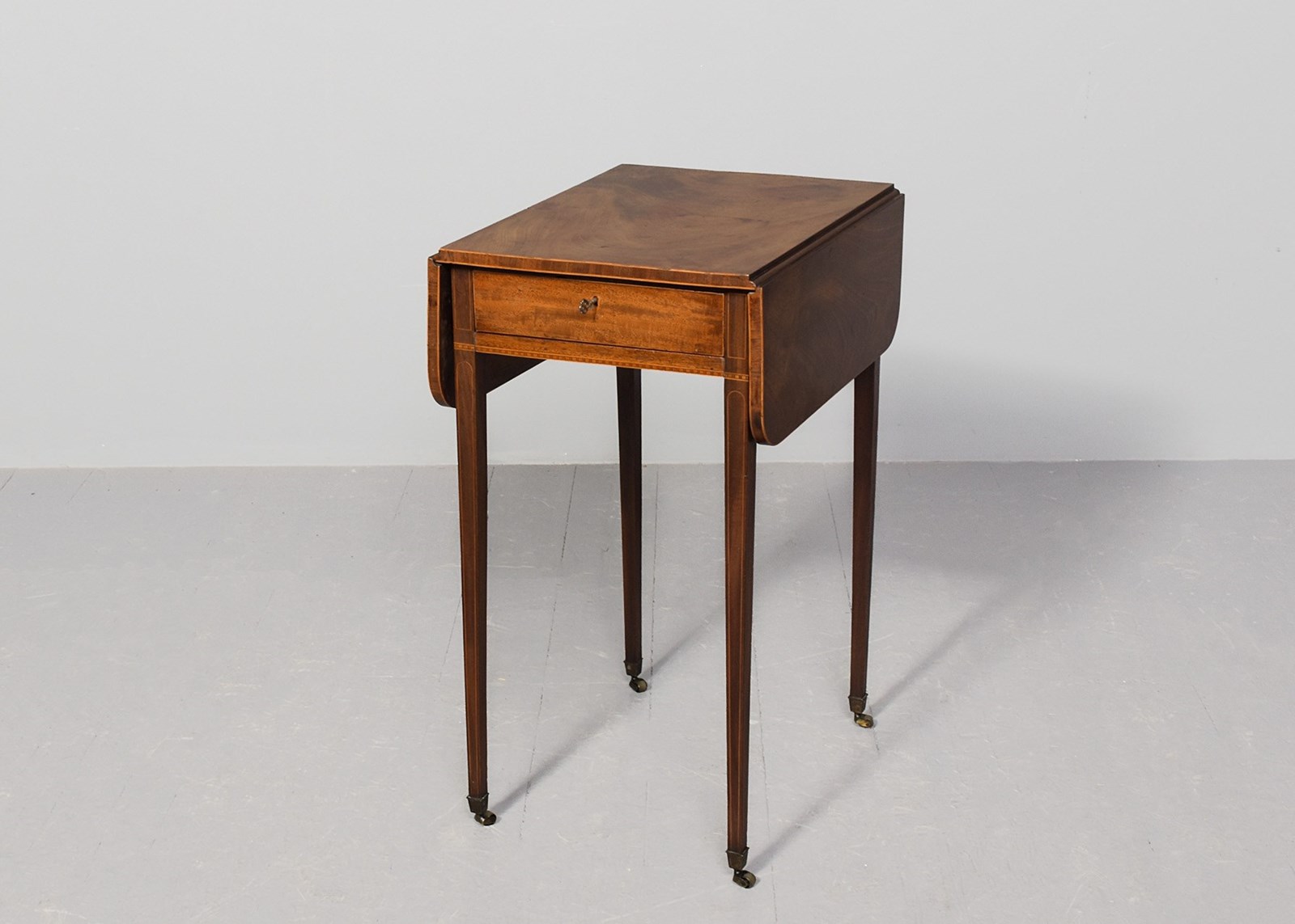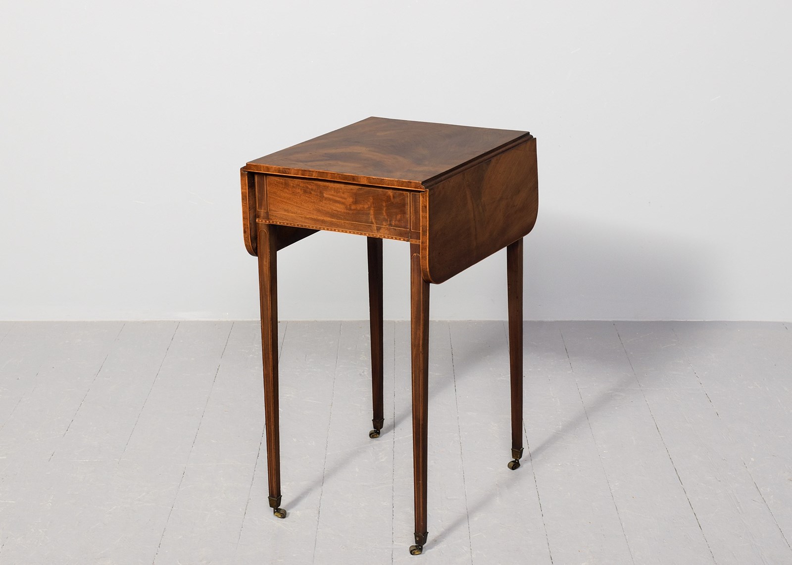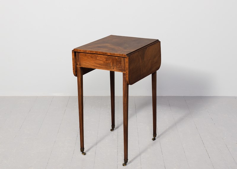 Circa1810. A late George III mahogany Pembroke/work table by 'Bruce and Burns of Edinburgh'. The diminutive table with finely figured mahogany top with string inlay, two flaps with rounded corners, held open by wooden hinges, with a full-length drawer with a heraldic escutcheon, the top of the drawer with the name clearly stamped, beneath the drawer, there is a chequered inlay, resting on four elegant square tapering legs with string inlay