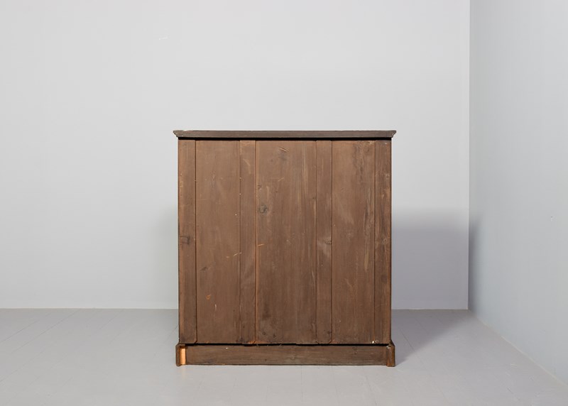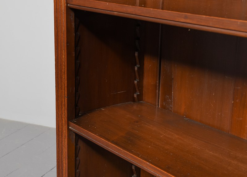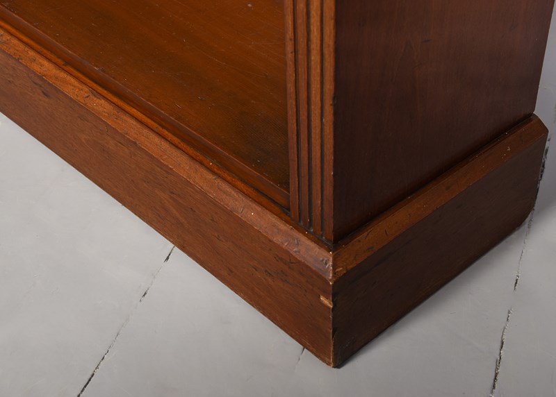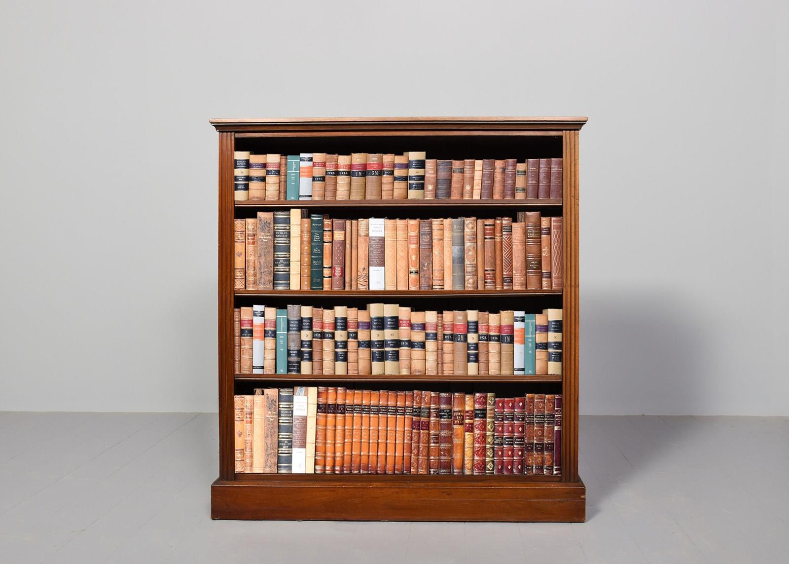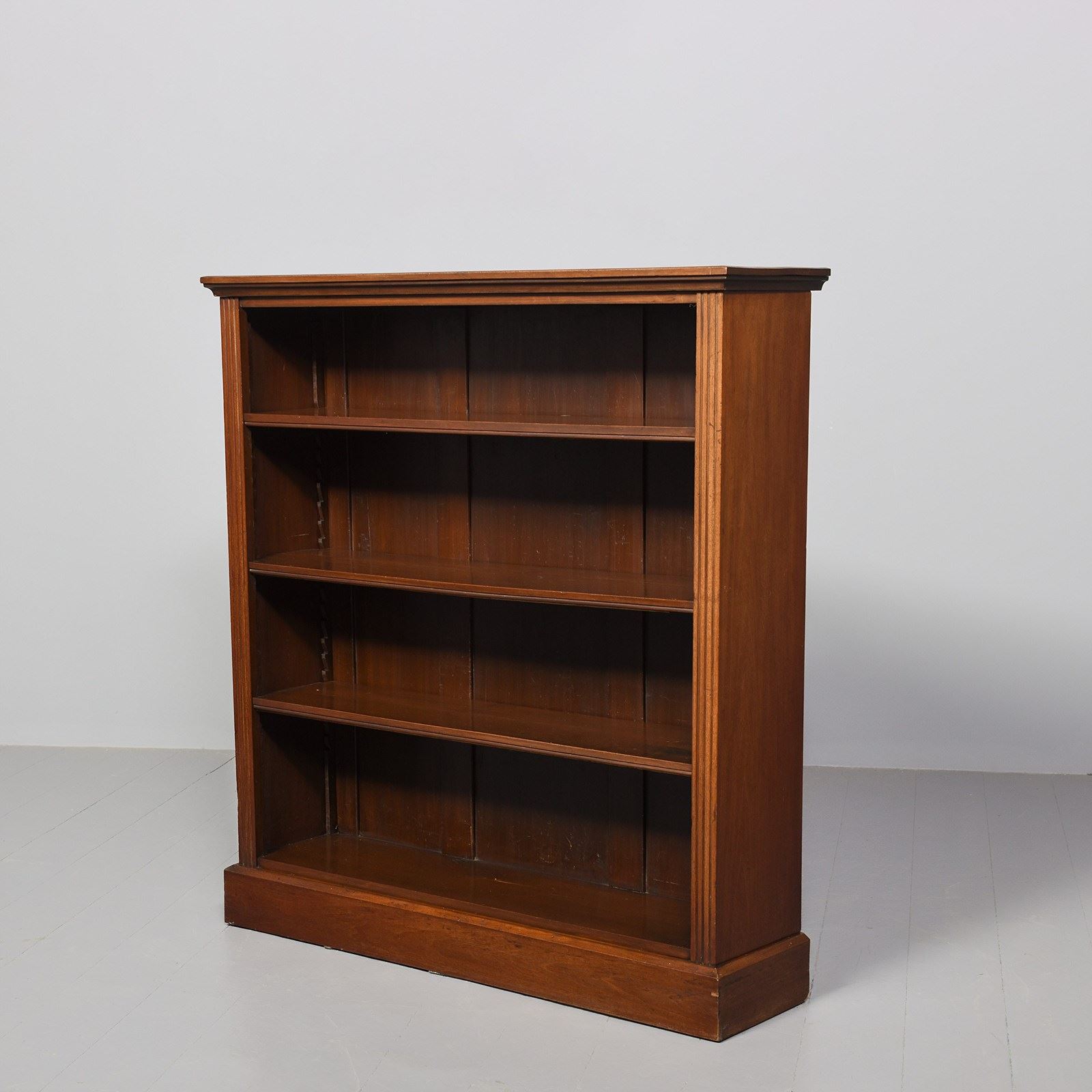 Circa 1900. A neat-sized Edwardian mahogany open bookcase, the solid top with a simple chamfered leading-edge, the front with three adjustable mahogany shelves, the bookcase with ribbed facings on both sides, resting on an enclosed mahogany plinth.