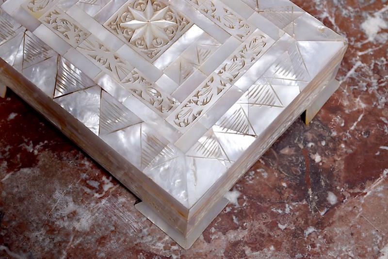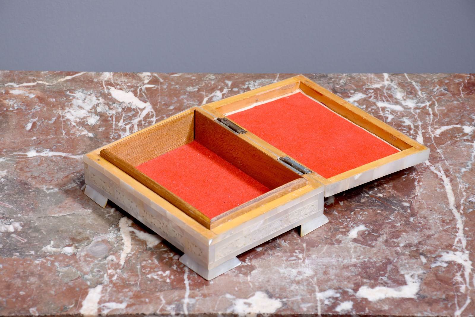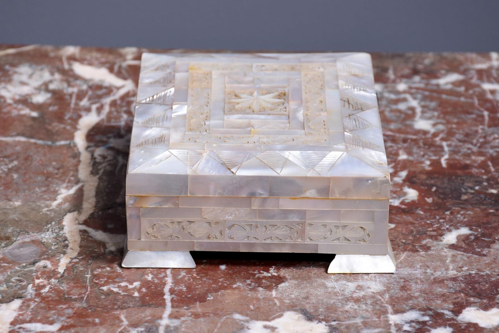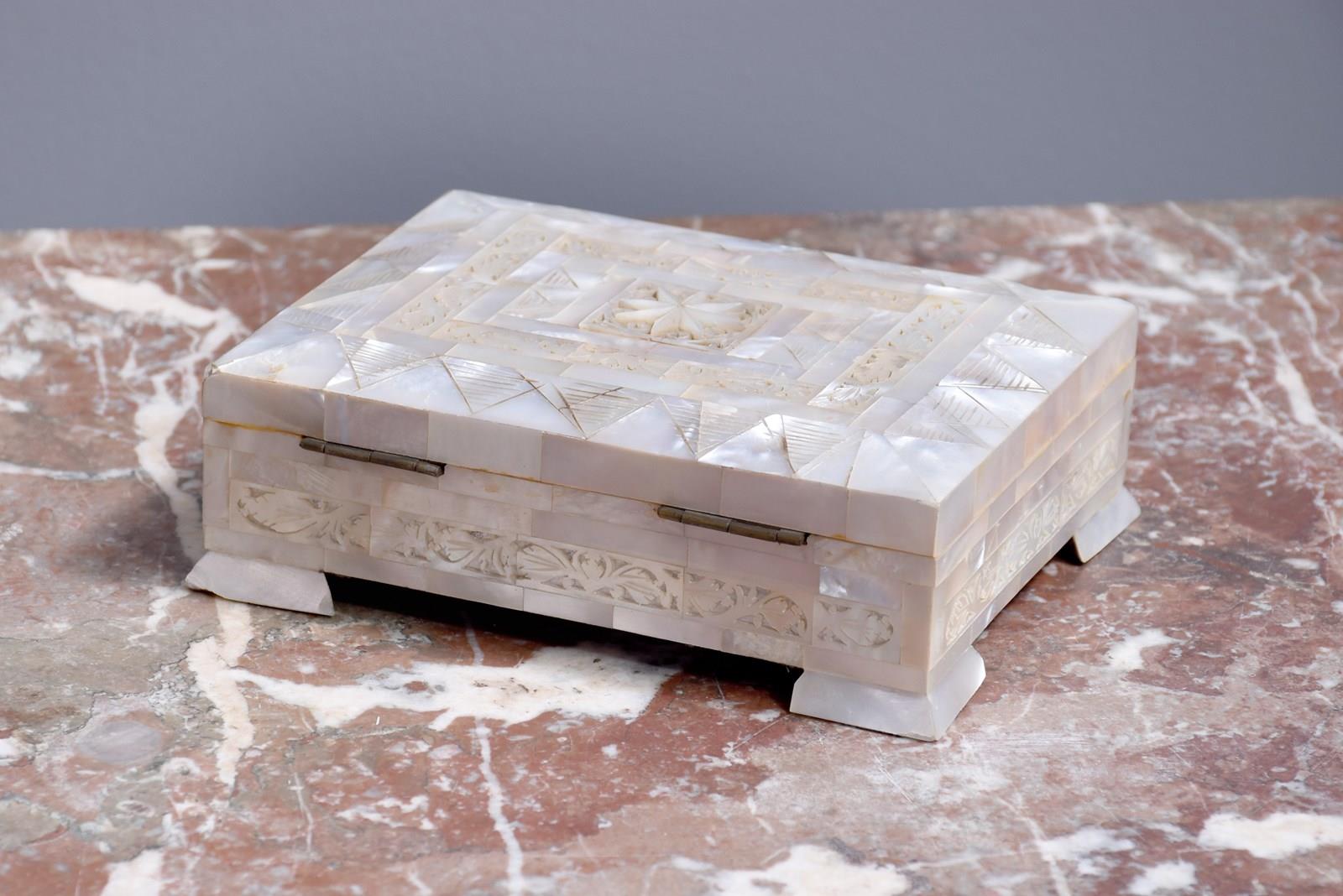 Circa 1910 Edwardian period mother of pearl decorated jewellery box. The angled top with star and carved foliate decoration above geometric decorations, opens to a velvet-lined interior. The sides with foliate carved and rectangular decorations over angled bracket feet.