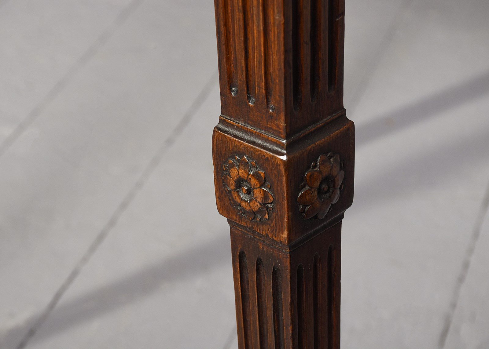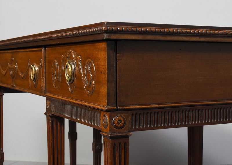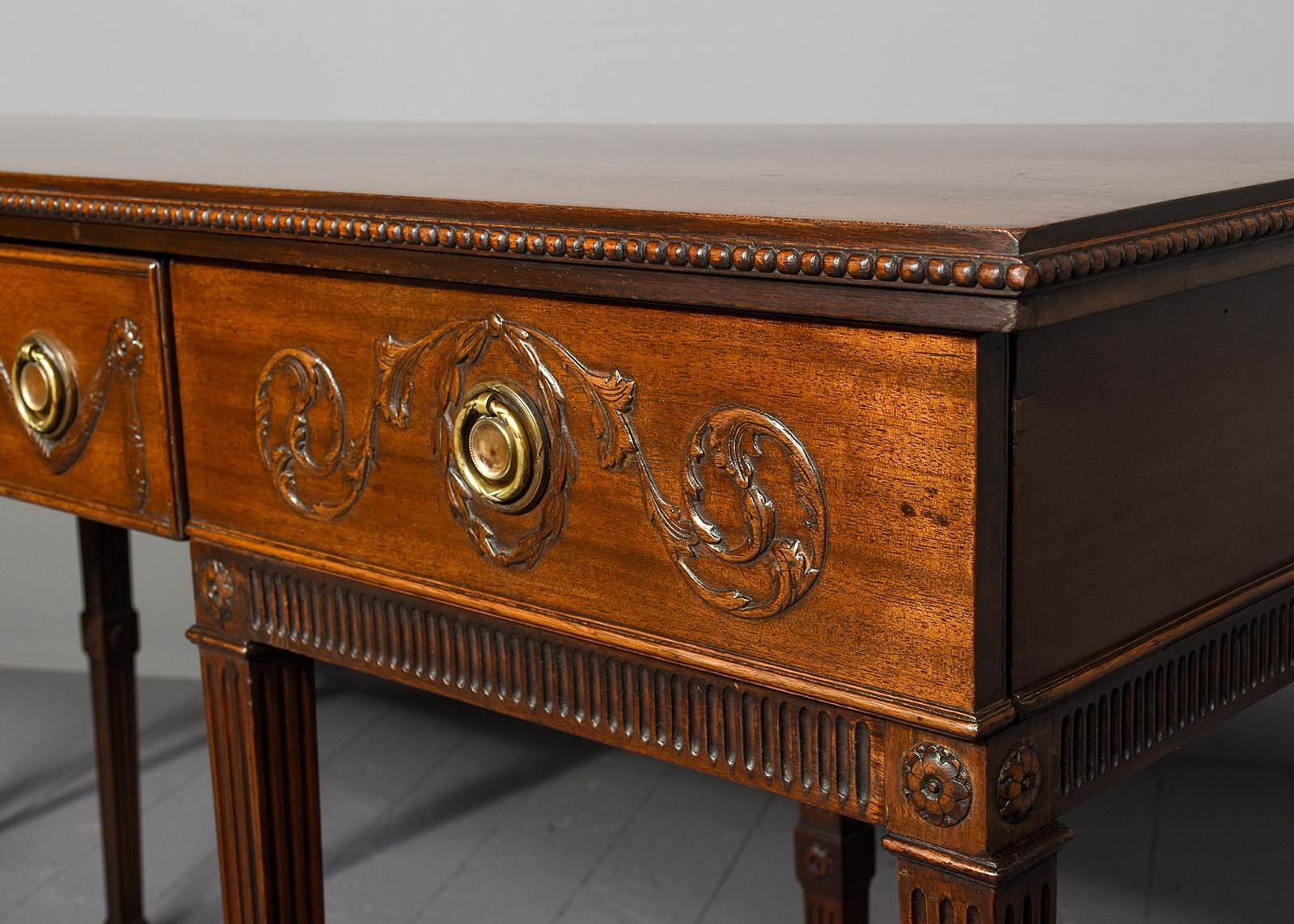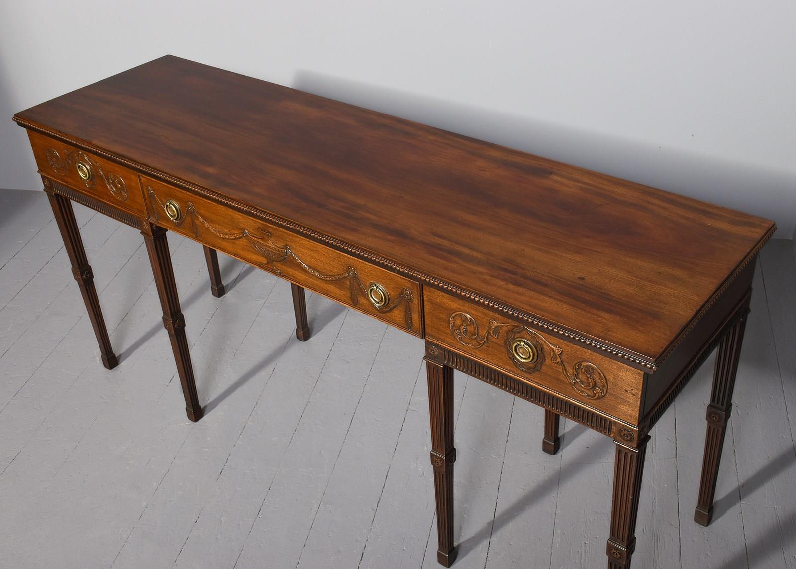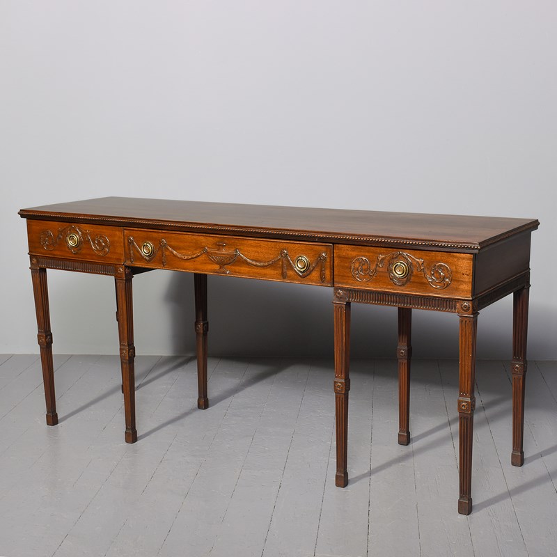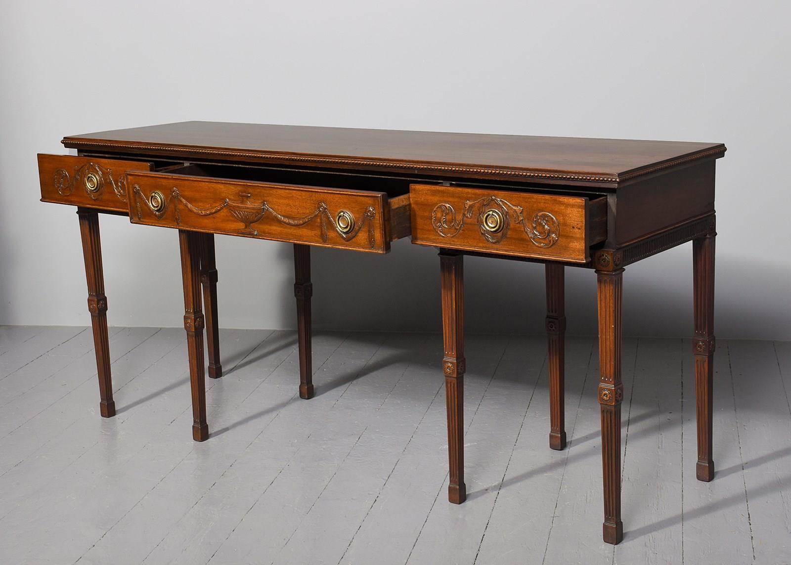 Circa 1880. Elegant Georgian Adam-style carved mahogany hall or side table. The top in figured Spanish mahogany with a beaded fore-edge above three frieze drawers with neo-classical carvings of scrolled foliage, urns and swags and with brass ring drop handles. The drawers with solid oak drawer linings and the sides with fluted aprons. All supported on eight tapering fluted legs with applied paterae, all on neat spade feet.