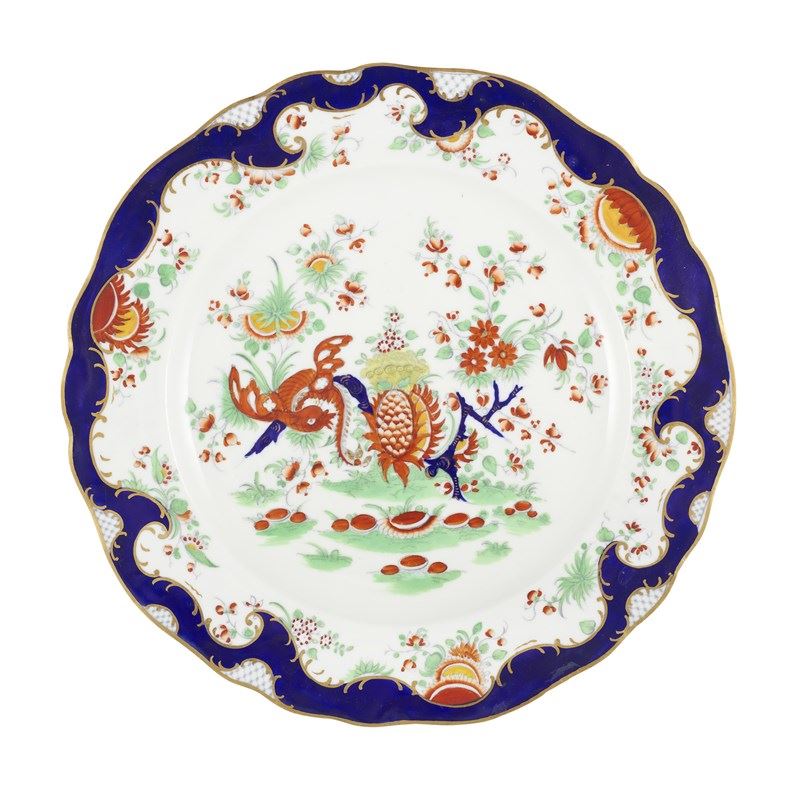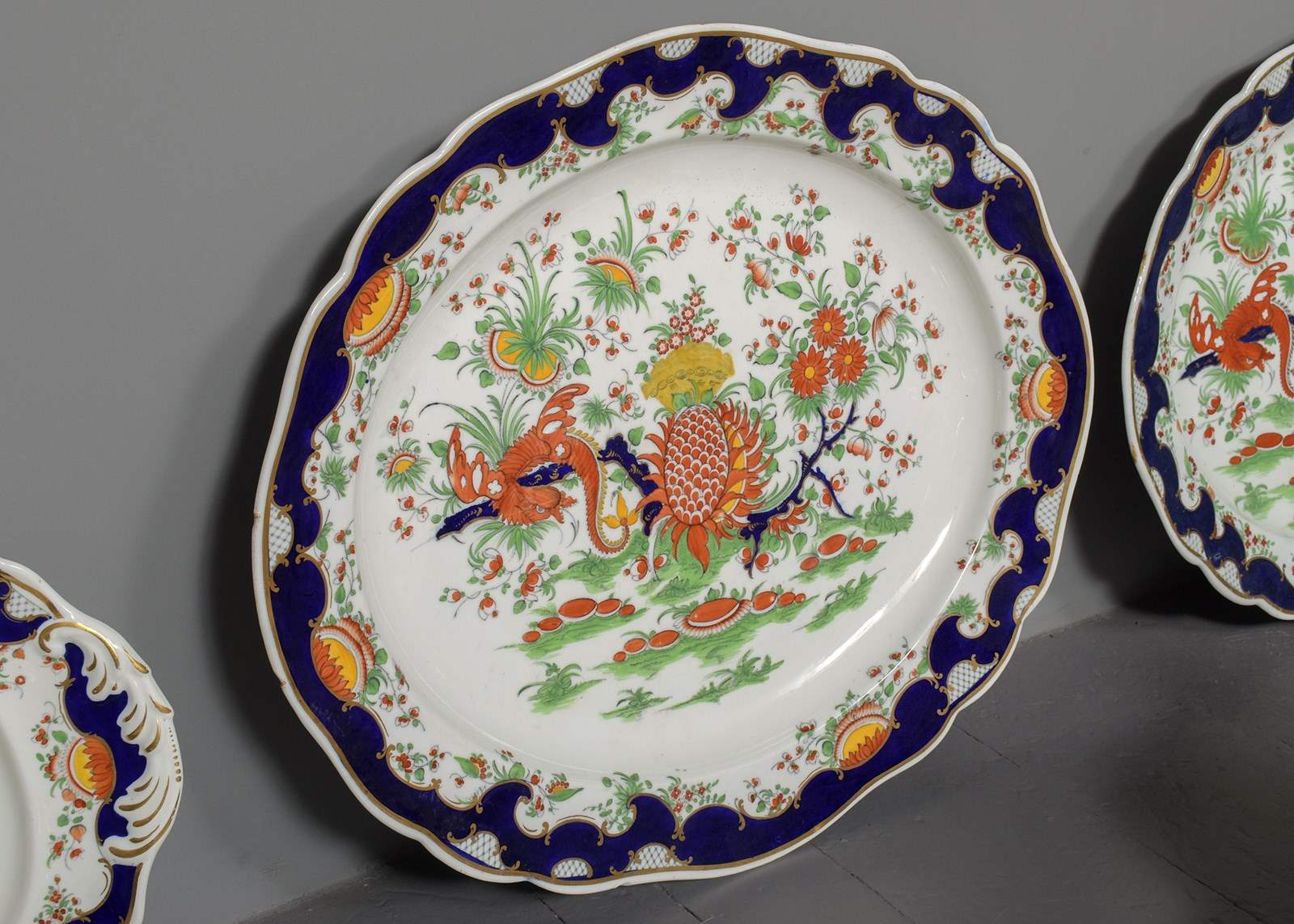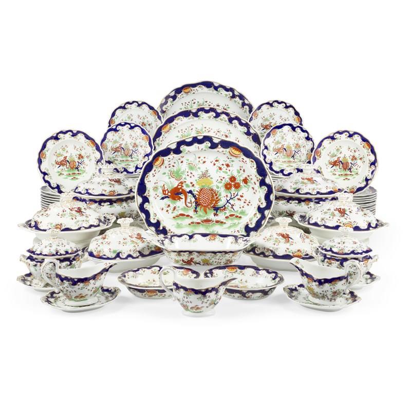 Circa 1800, the large dinner service by Chamberlains Worcester, in the Jabberwocky pattern, printed and enamelled decoration with gilt highlights; comprising: fifty-two dinner plates, 26.5cm wide; forty-one twiffler (medium sized) plates, 23cm diameter; twenty-four shallow bowls, 26.5cm diameter; two large tureens and covers on stands, tureens 36cm wide, 37.5cm wide; four
