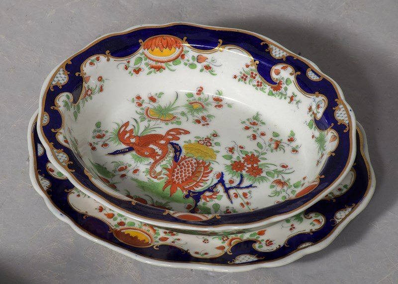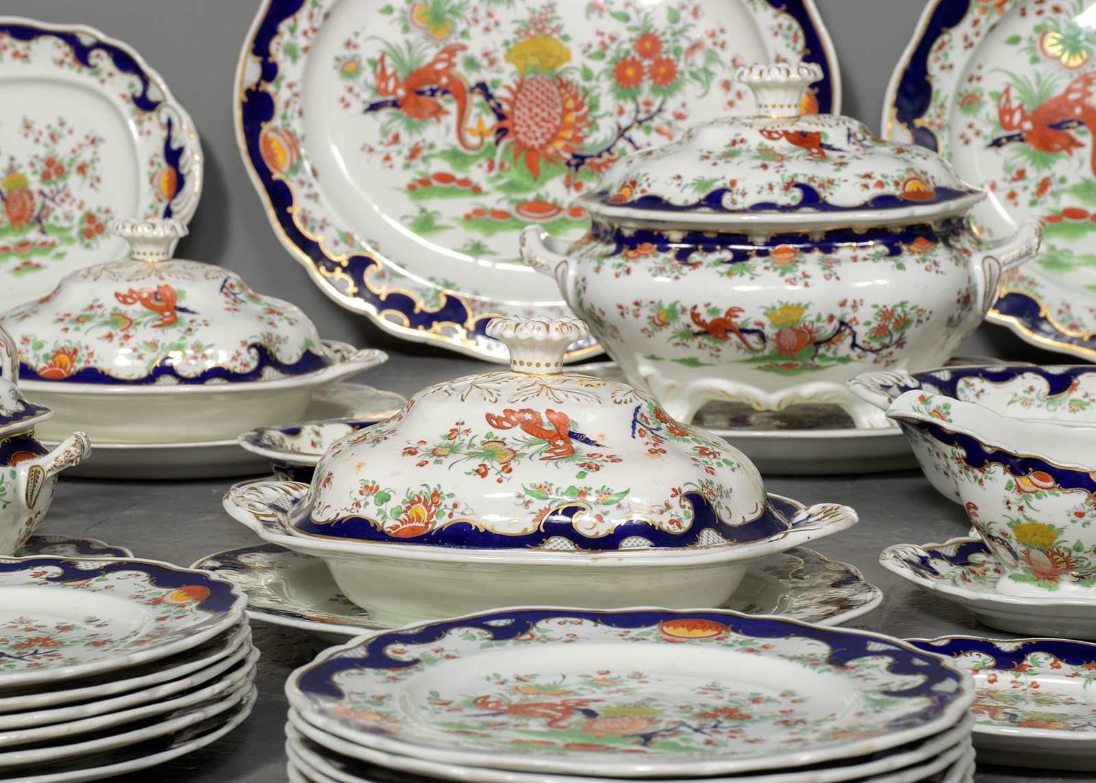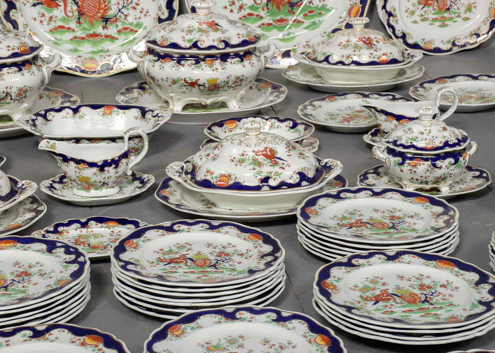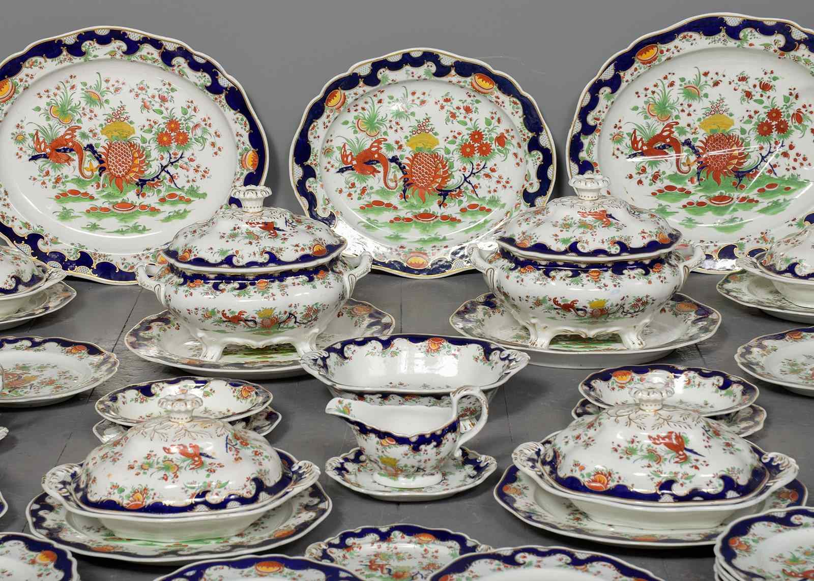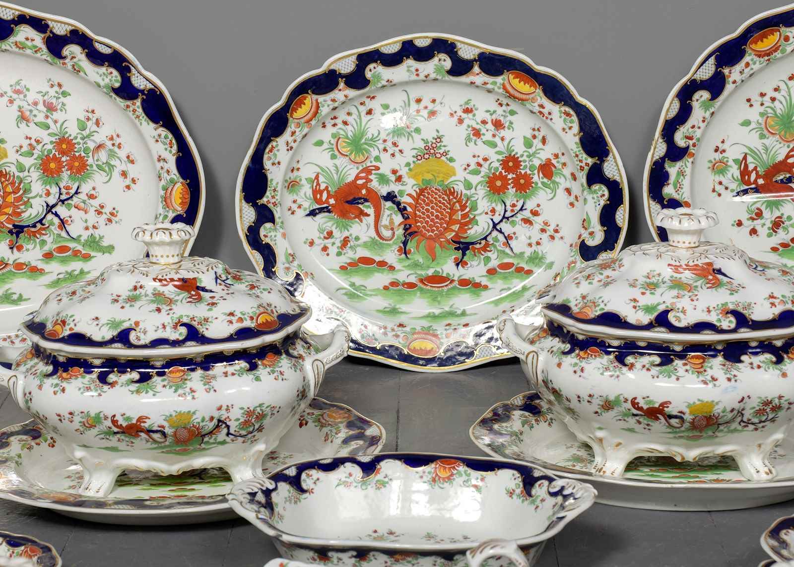 vegetable tureens with covers, 33cm wide; two small sauce tureens with covers and four stands, tureens 19.6cm wide, stands 22cm wide; an oblong dish raised on four feet, 31cm wide; two oval dishes, 23cm wide; three sauce boats, 20cm wide; seventeen graduated ashets of various sizes ranging from 25cm wide - 52cm wide; some pieces are unmarked, some are impressed, some have the painted pattern number 4141.