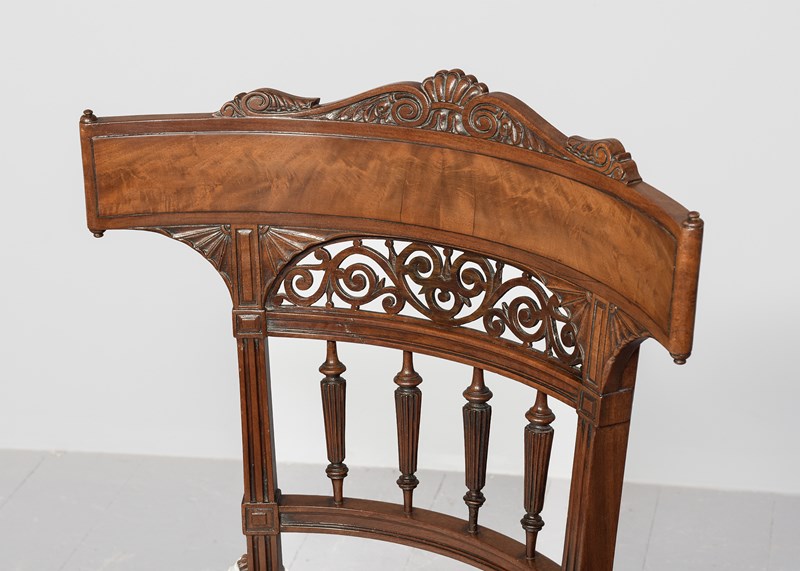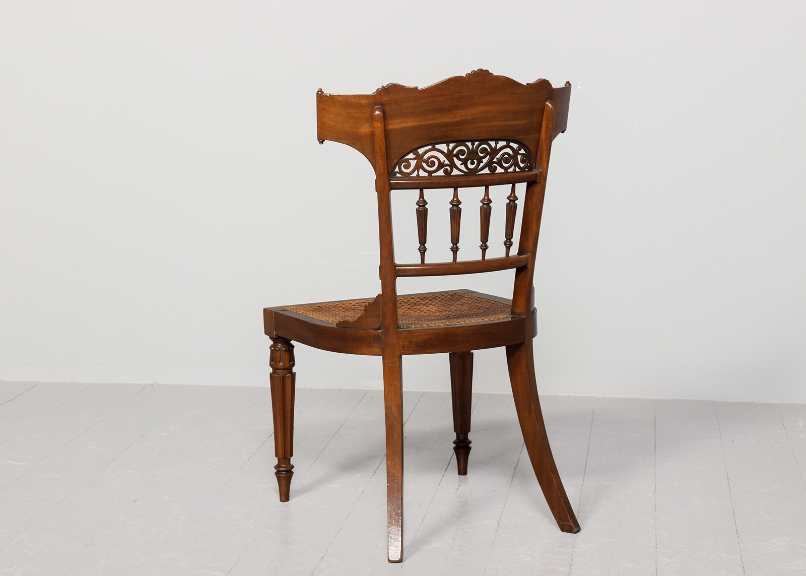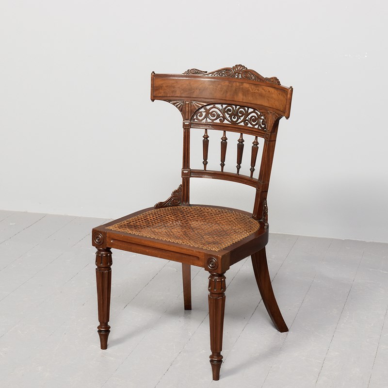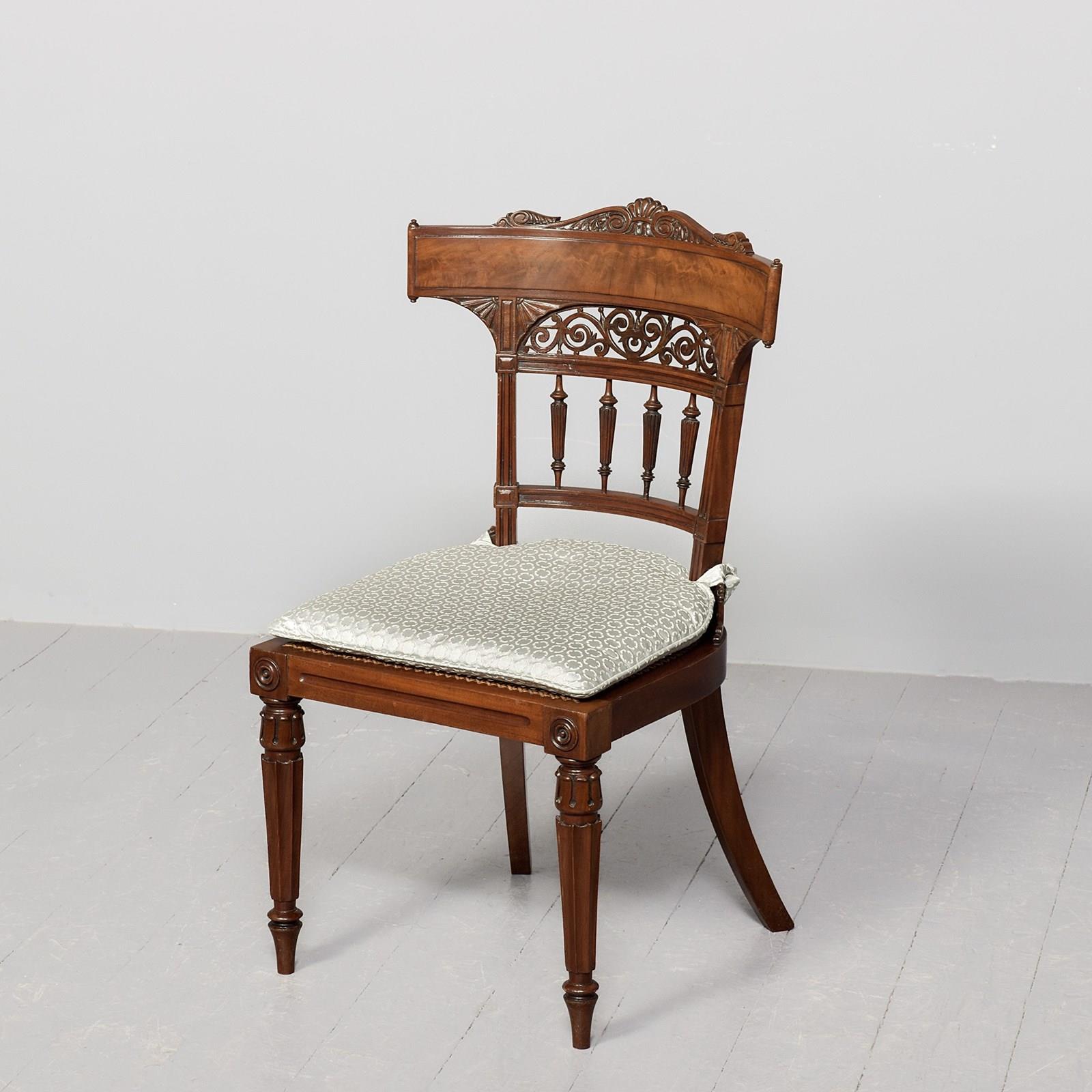 Circa 1860. Victorian mahogany Klismos back chair, the curved tablet top surmounted by a carved section, the back with book-matched flame mahogany with a pierced section framed by a pair of carved fans, four carved fluted spindles supported on a curved rail, the base of the uprights with carved quarter brackets, with the original cane seat and removable squab cushion, back legs are square and out swept, the front legs headed by a pair of rondels with a simple seat, are carved turned fluted and tapering, finishing on an extended turned toe.