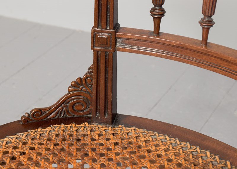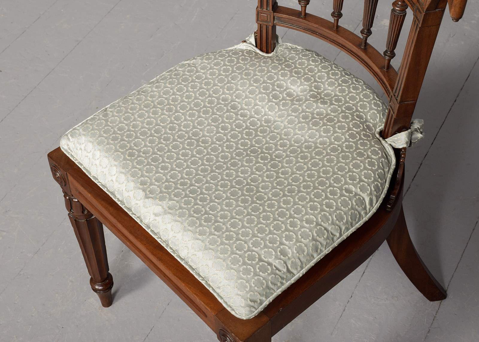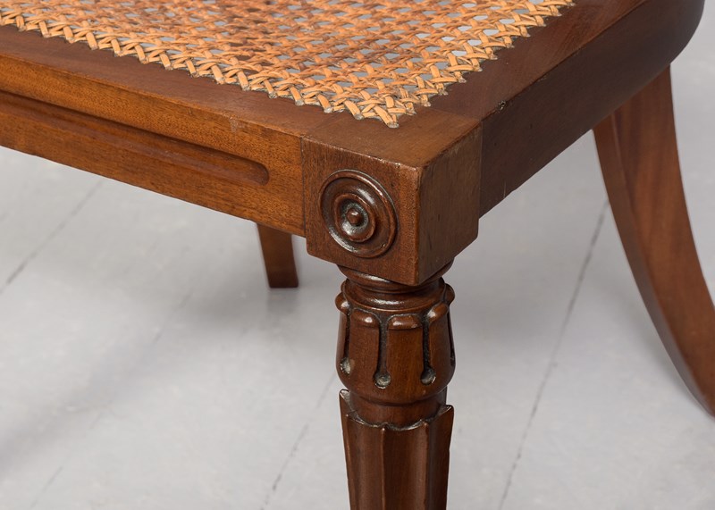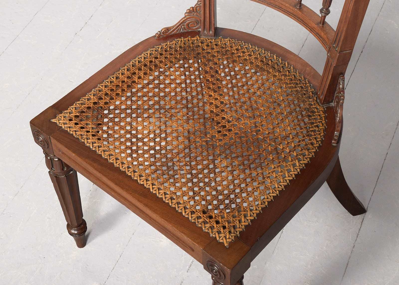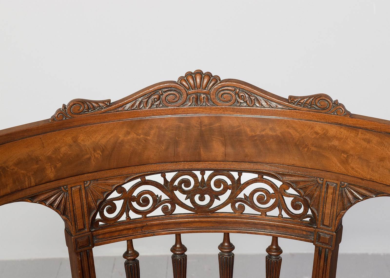 Circa 1860. Victorian mahogany Klismos back chair, the curved tablet top surmounted by a carved section, the back with book-matched flame mahogany with a pierced section framed by a pair of carved fans, four carved fluted spindles supported on a curved rail, the base of the uprights with carved quarter brackets, with the original cane seat and removable squab cushion, back legs are square and out swept, the front legs headed by a pair of rondels with a simple seat, are carved turned fluted and tapering, finishing on an extended turned toe.
