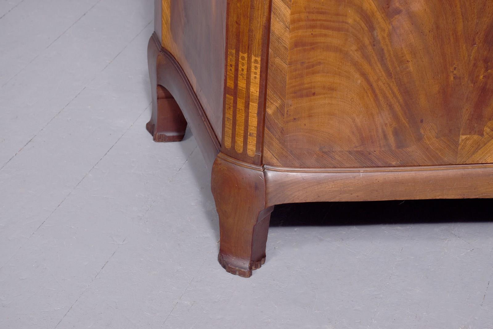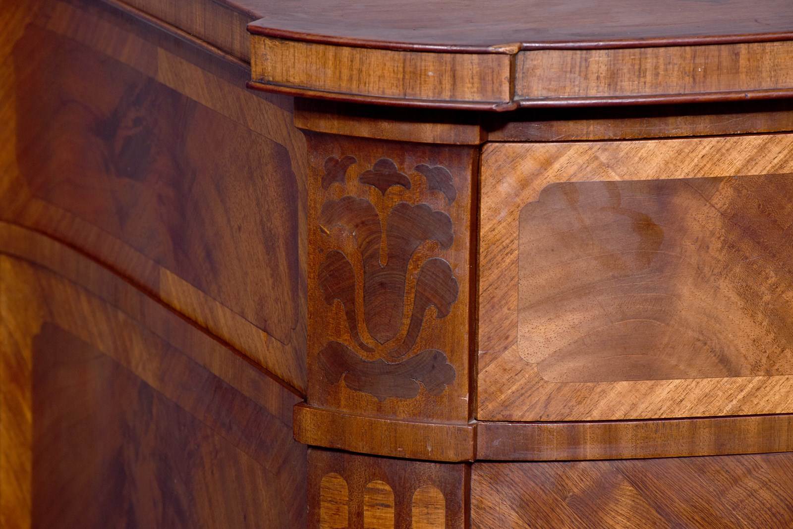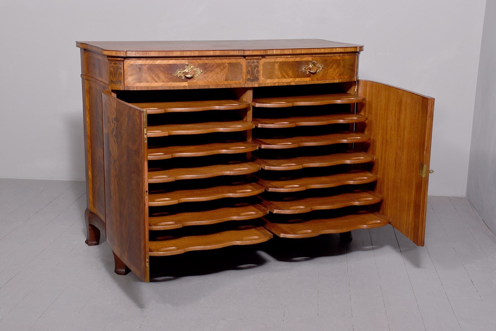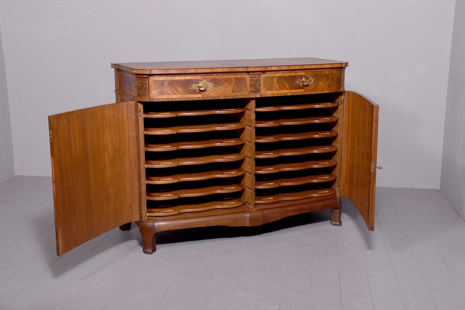 Circa 1910. An exhibition quality mahogany and inlaid folio cabinet by ‘Whytock & Reid of Edinburgh’, designed in the French taste the solid shaped top with beaded and cross banded fore-edge, he front with a pair of curved doors with French Rococo gilded handles, with Kingwood banding, beneath a pair of curved inlaid marquetry doors, which open to reveal two banks with pull out shaped folio trays each with a pair of pierced handgrips, the gables with panels in finest feathered mahogany, the fore-edges with inlaid panels, beneath the doors there is a shaped frieze that follows the forms of the doors, all resting on stylish Whytock & Reid Lorimer-style feet