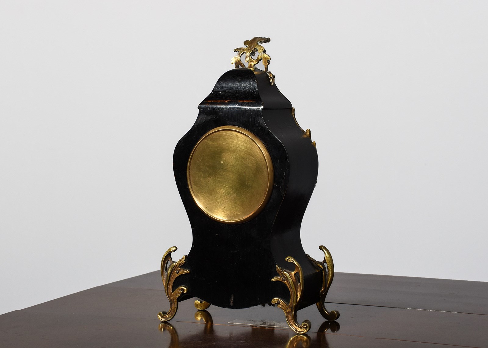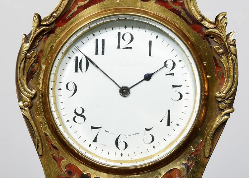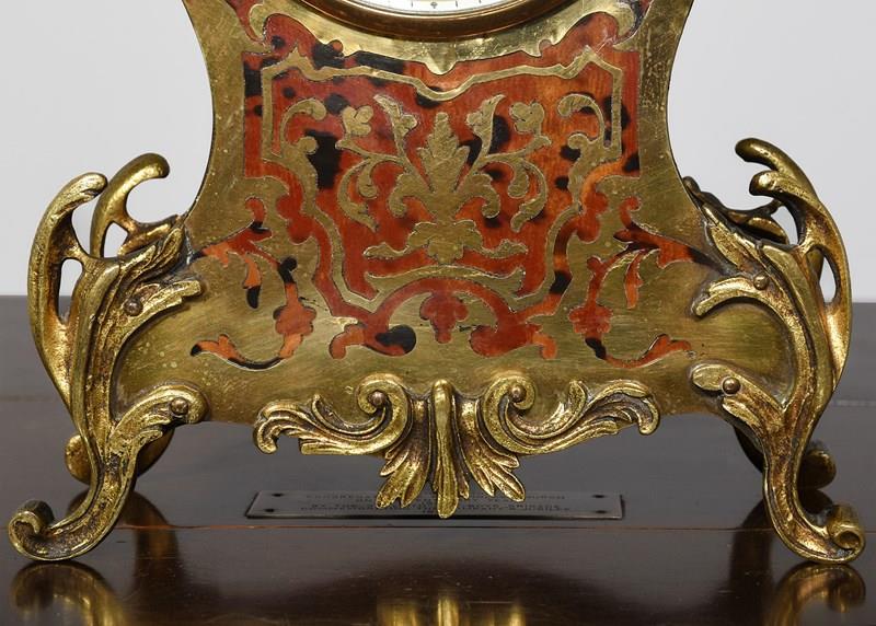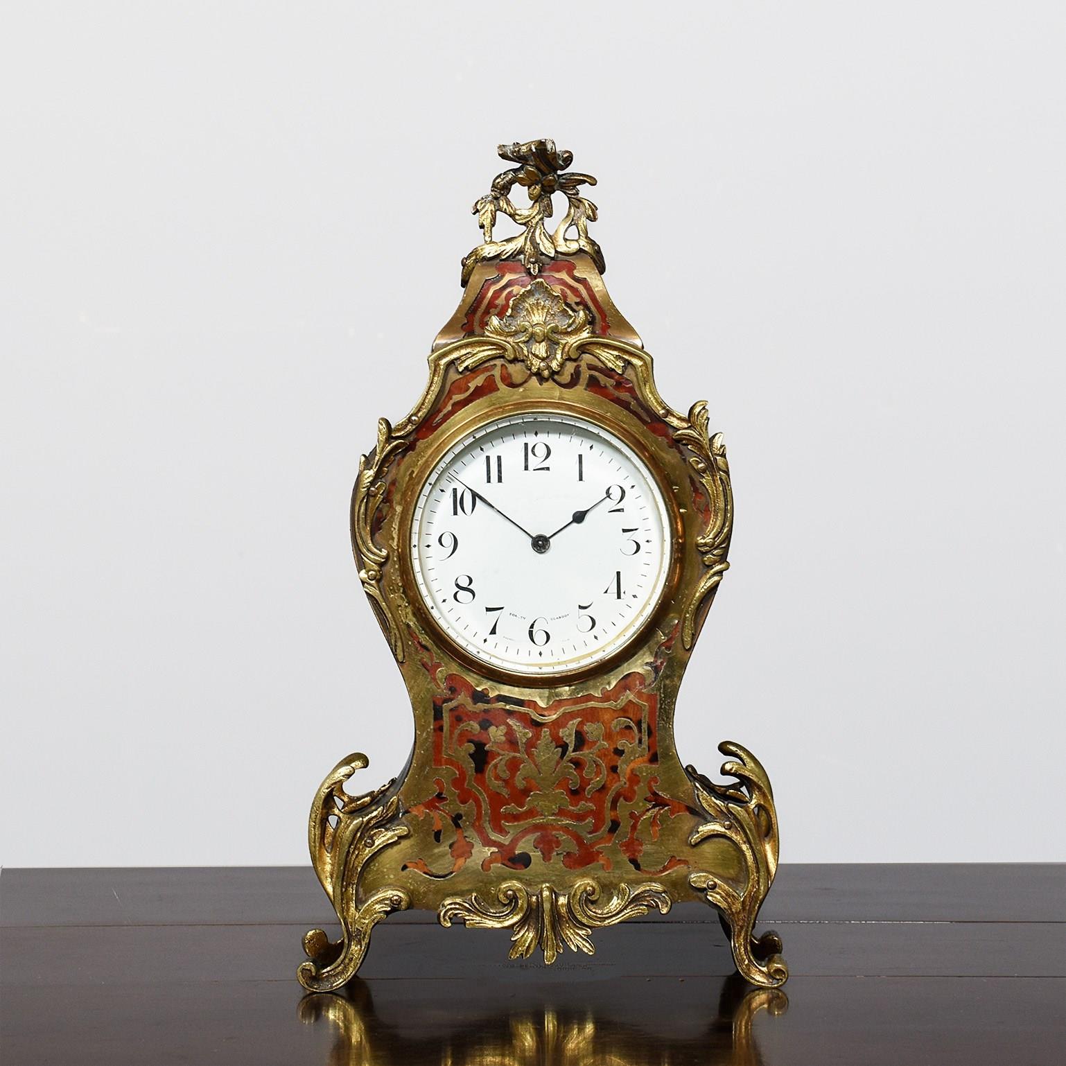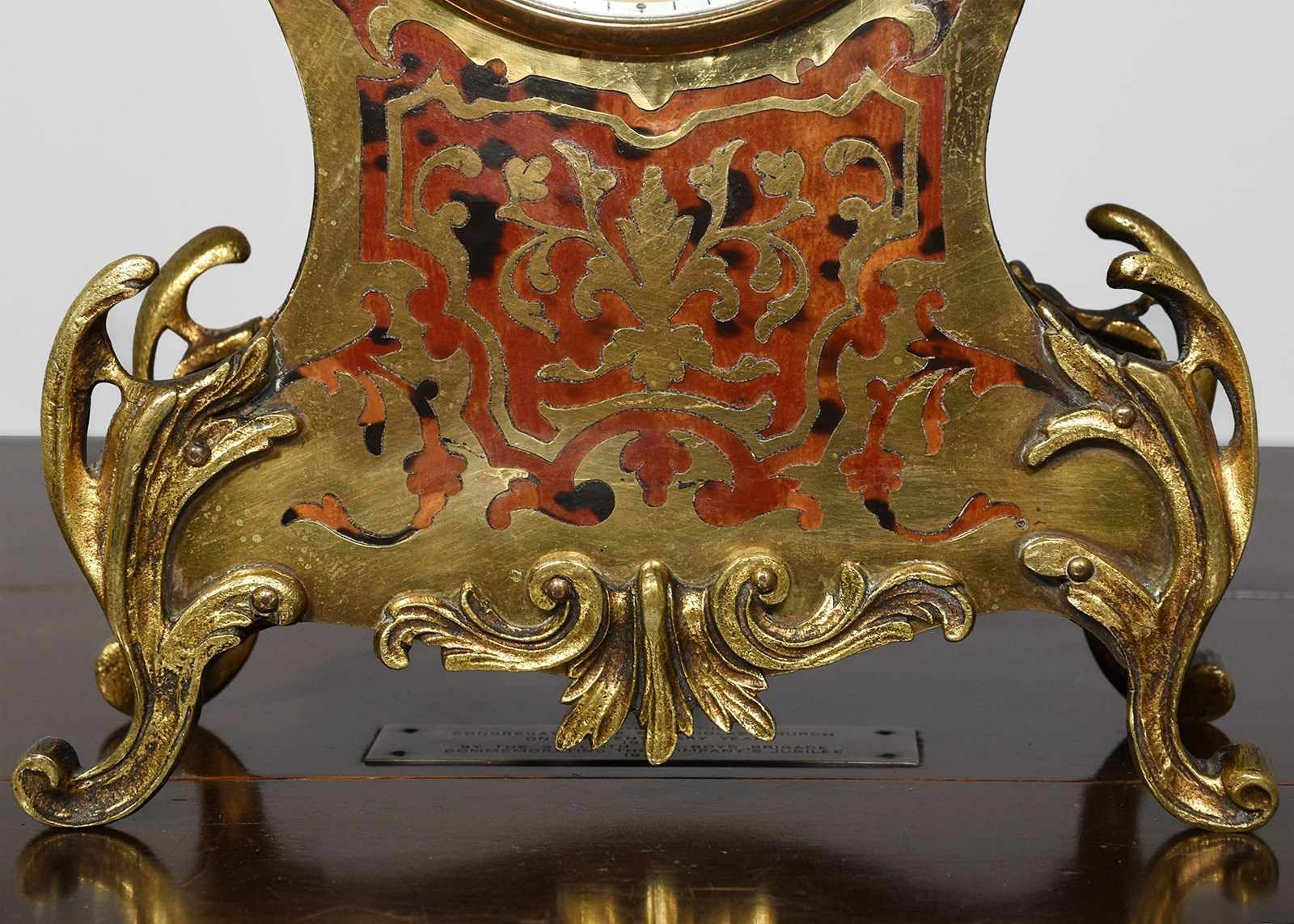 Circa 1900, a French Boulle mantel clock in Louis XV style, white enamel dial with Arabic numerals bearing the retailers name ‘Sorley of Glasgow’, all contained in a case of cartouche shape, with gilt brass scrolling, foliate mounts, resting on elegant cast cabriole legs.