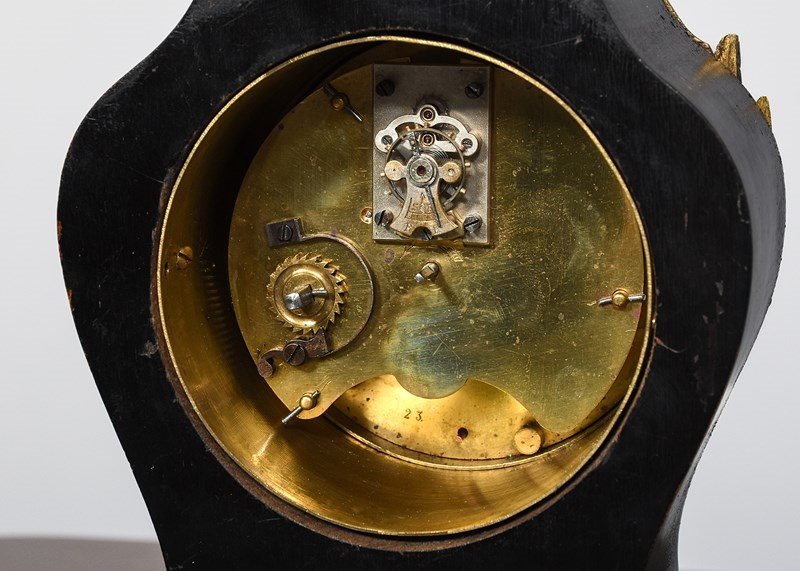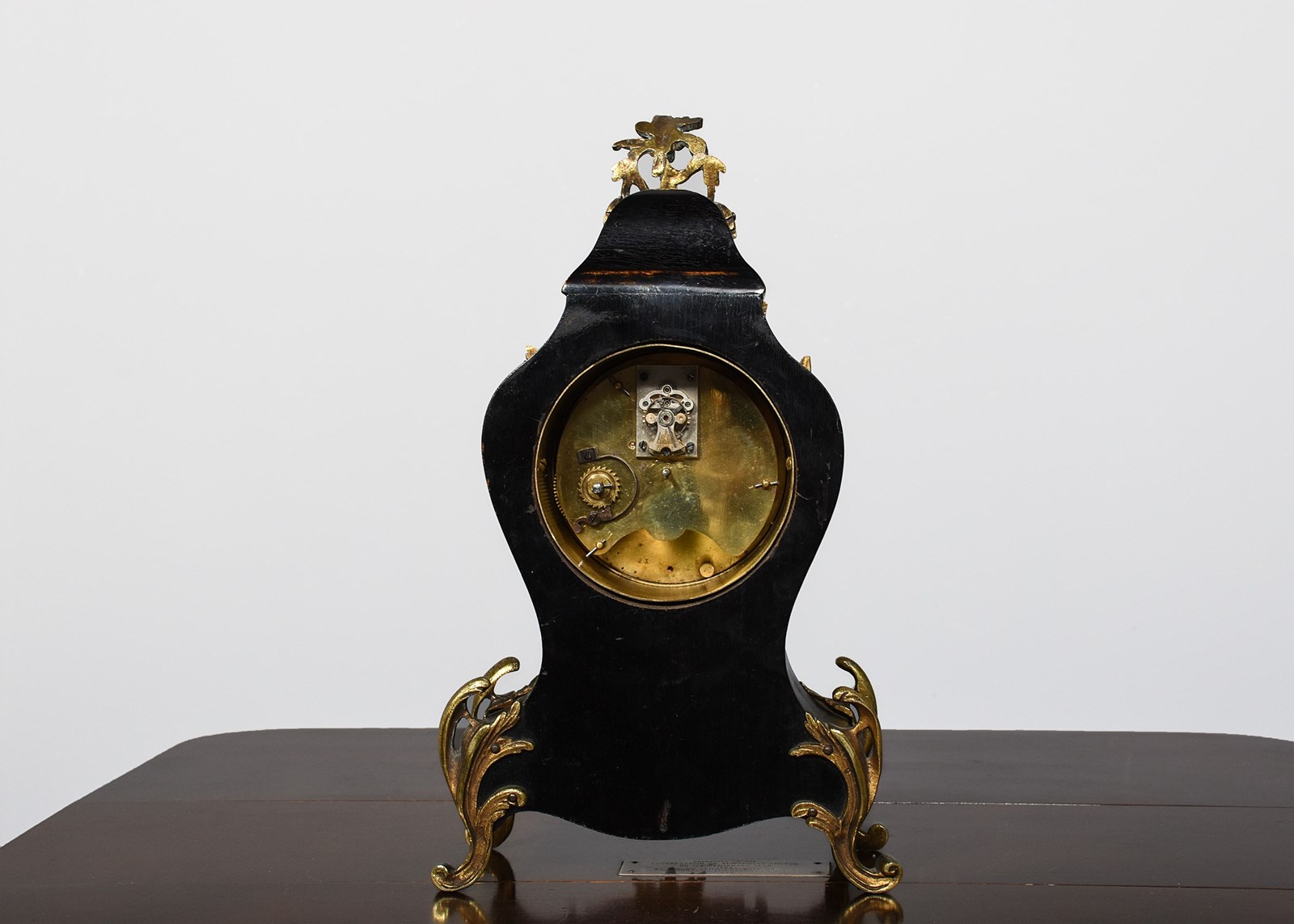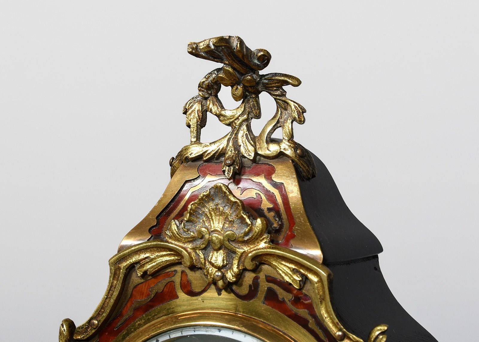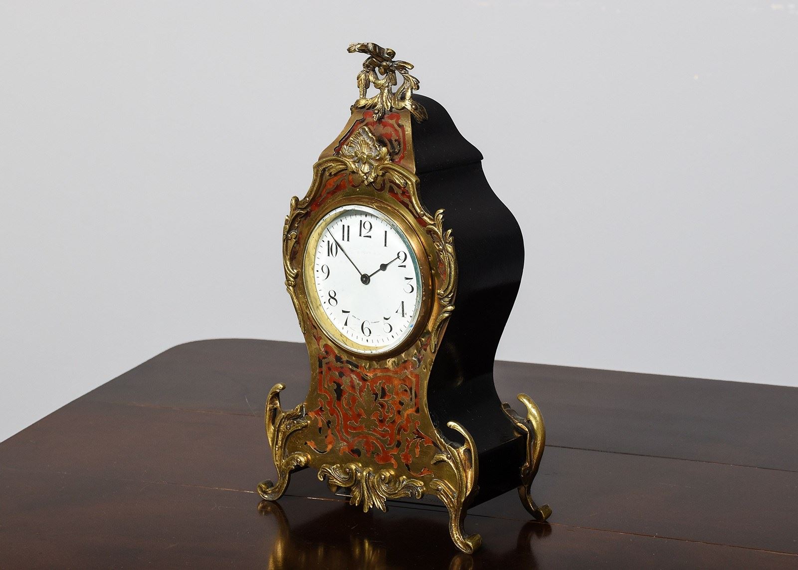 Circa 1900, a French Boulle mantel clock in Louis XV style, white enamel dial with Arabic numerals bearing the retailers name ‘Sorley of Glasgow’, all contained in a case of cartouche shape, with gilt brass scrolling, foliate mounts, resting on elegant cast cabriole legs.