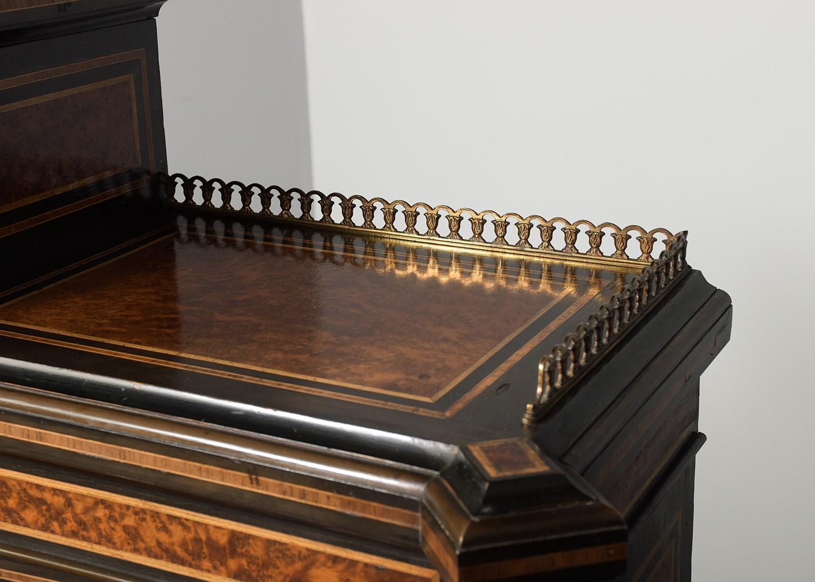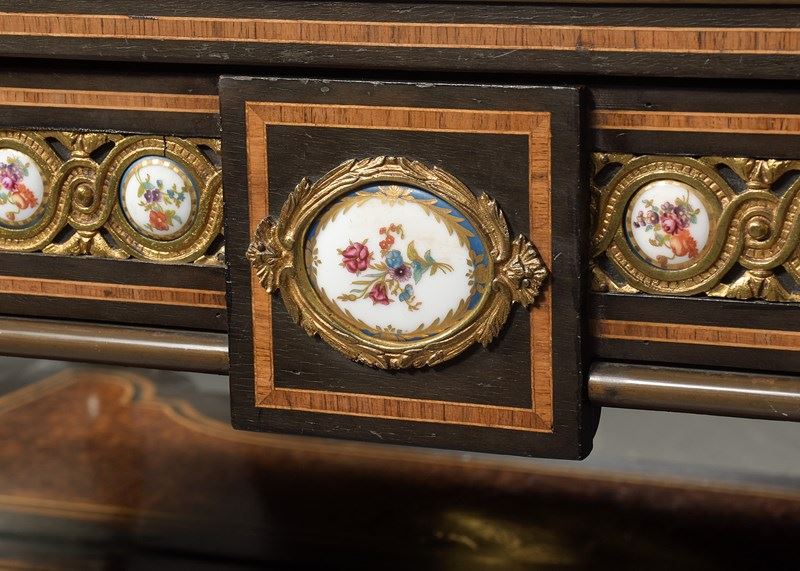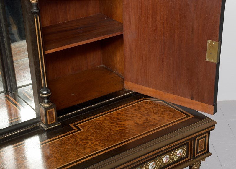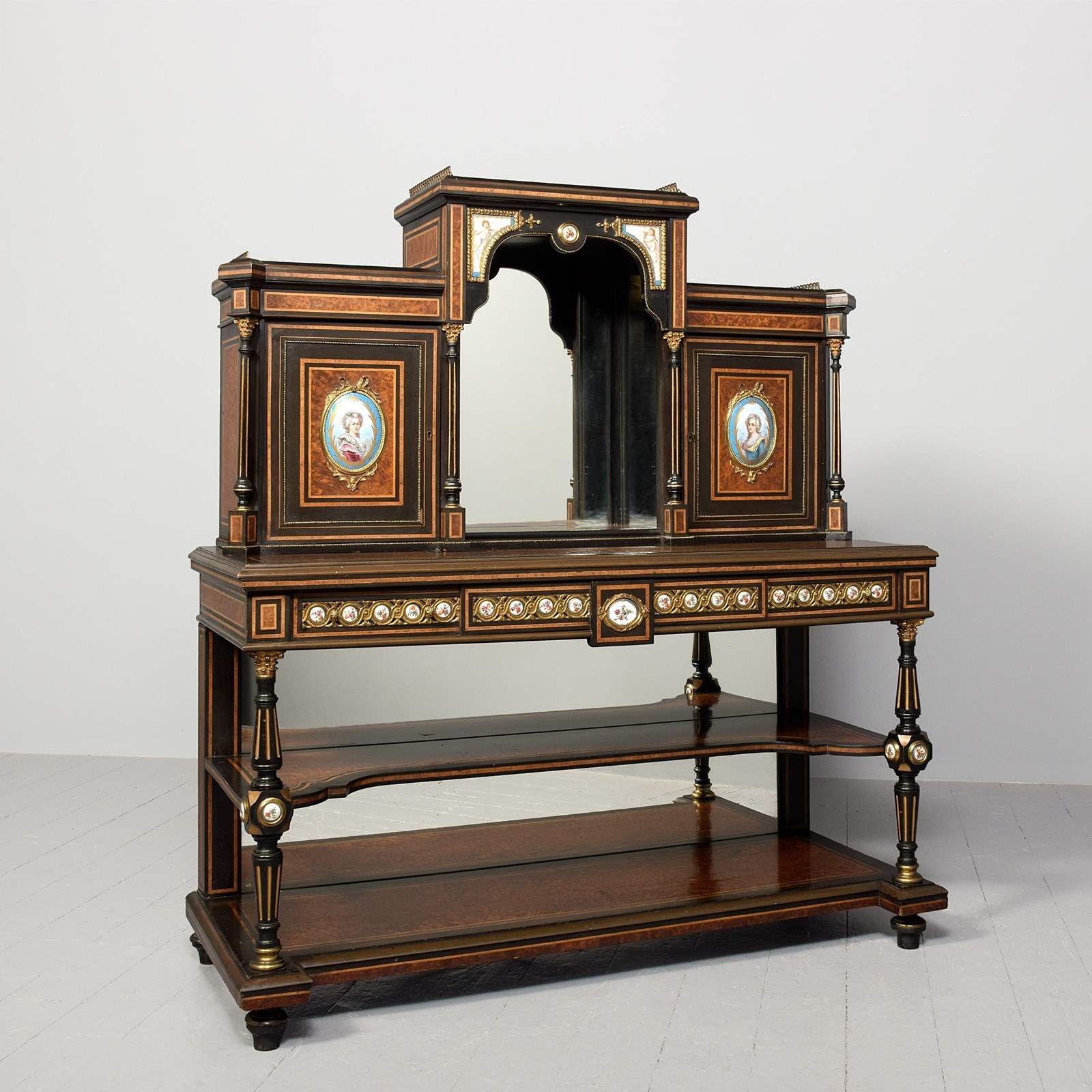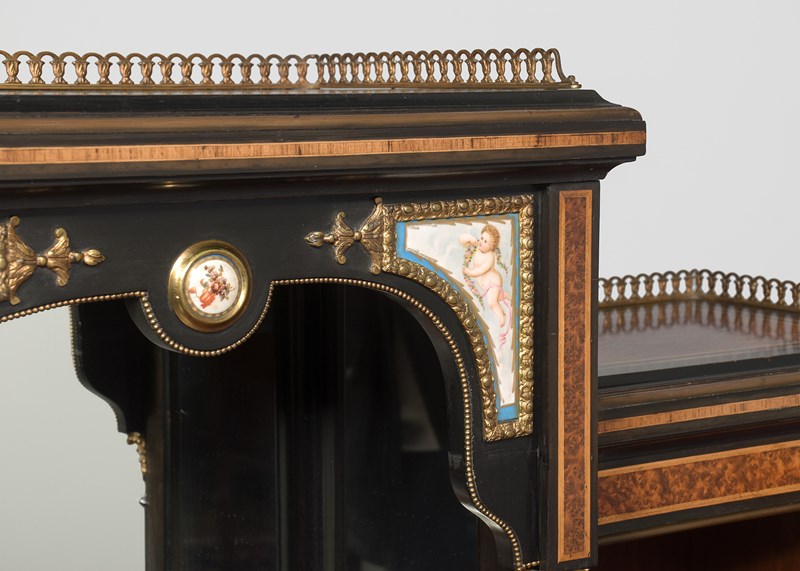 Circa 1860. A mid Victorian ebonized, porcelain and gilded metal mounted side cabinet, the breakfront top with pierced gallery, the central section with a mirror and recess, flanked by doors with three quarter brass galleries over mounted panels with Serves style porcelain plaques, all flanked by fluted and gilded columns with elegant capitals, the lower section with a moulded brass edge over three frieze drawers, the centre drawer with a leathered and tooled writing surface with a rinceaux frieze and further porcelain plaques, two mirror backed tiers flanked by fluted tapering supports, all raised on troupie feet
