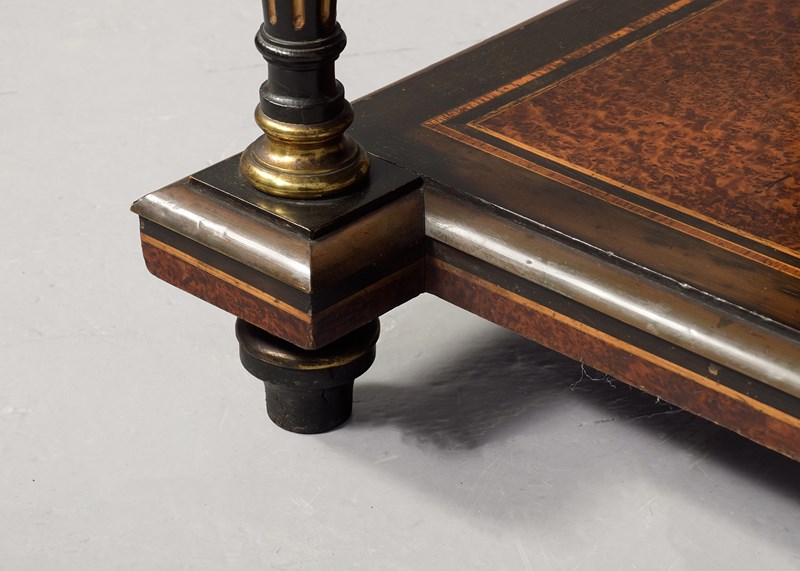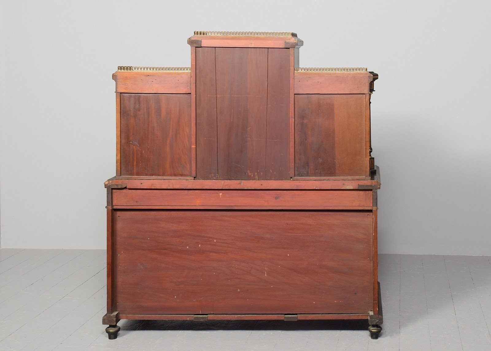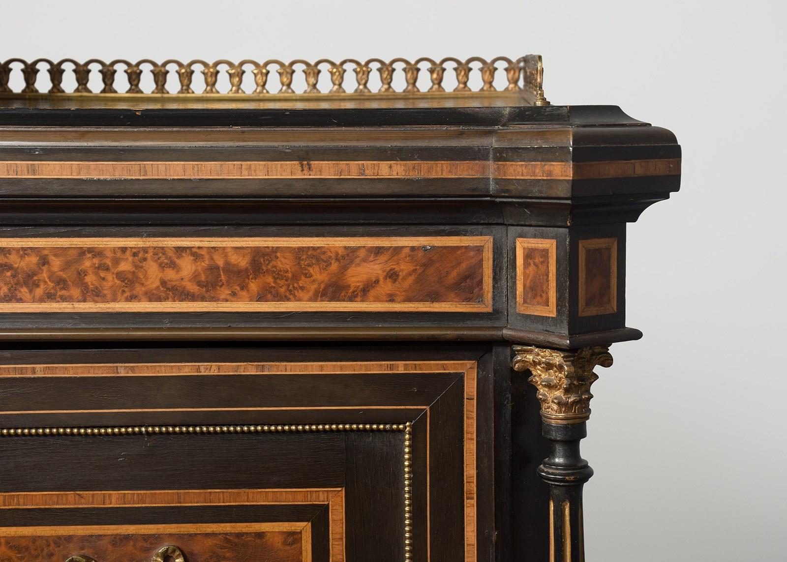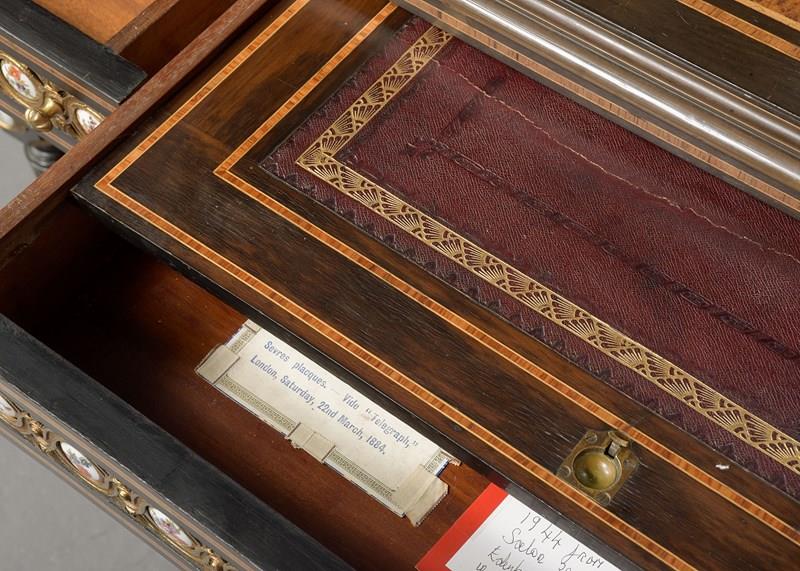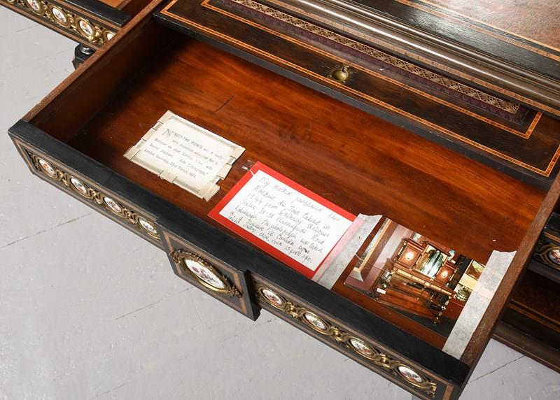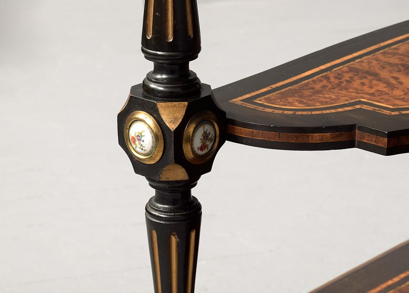Circa 1860. A mid Victorian ebonized, porcelain and gilded metal mounted side cabinet, the breakfront top with pierced gallery, the central section with a mirror and recess, flanked by doors with three quarter brass galleries over mounted panels with Serves style porcelain plaques, all flanked by fluted and gilded columns with elegant capitals, the lower section with a moulded brass edge over three frieze drawers, the centre drawer with a leathered and tooled writing surface with a rinceaux frieze and further porcelain plaques, two mirror backed tiers flanked by fluted tapering supports, all raised on troupie feet