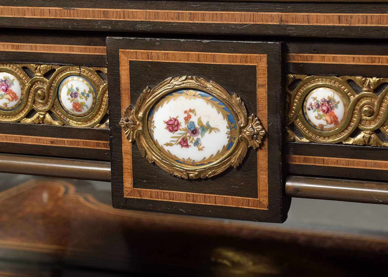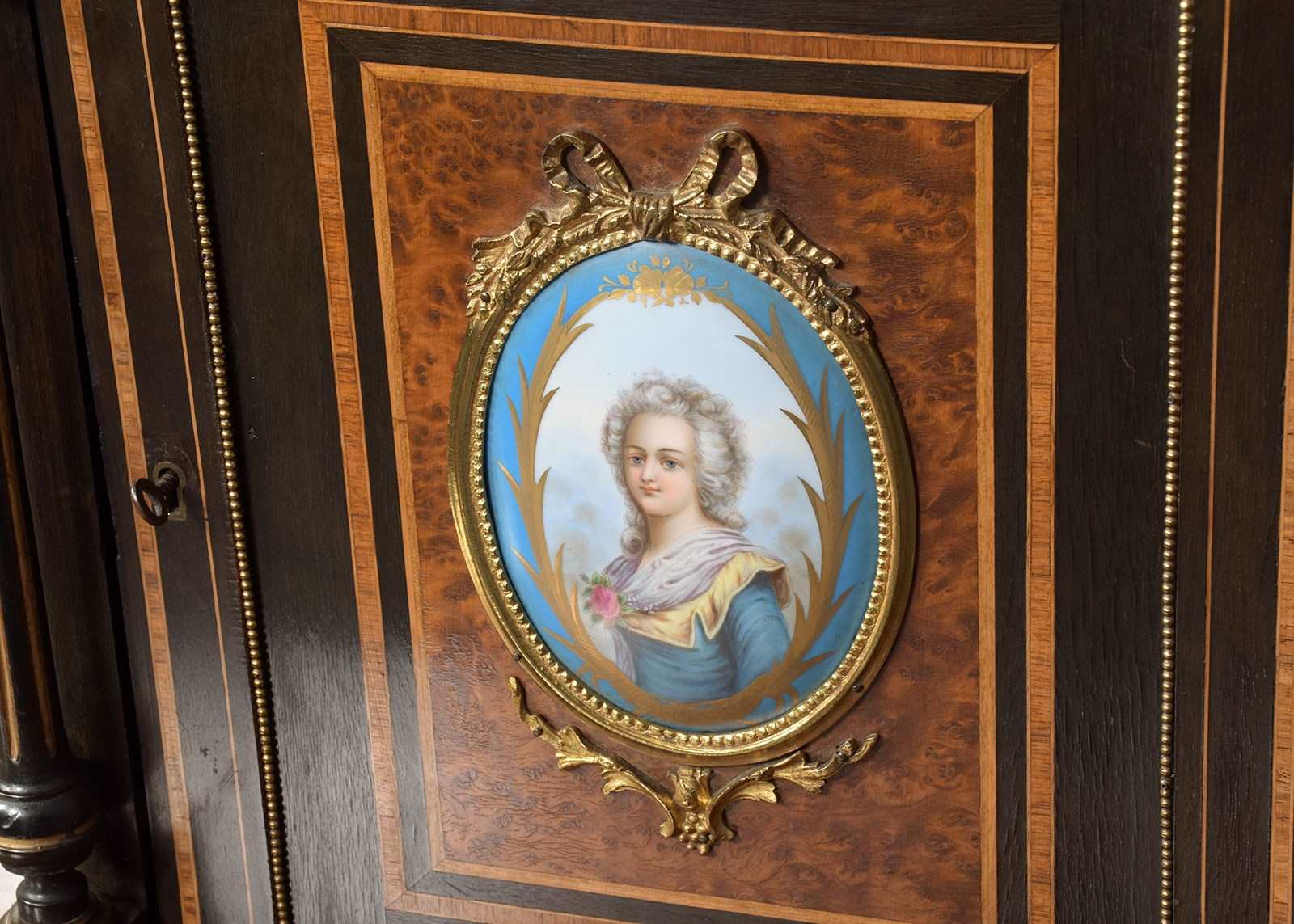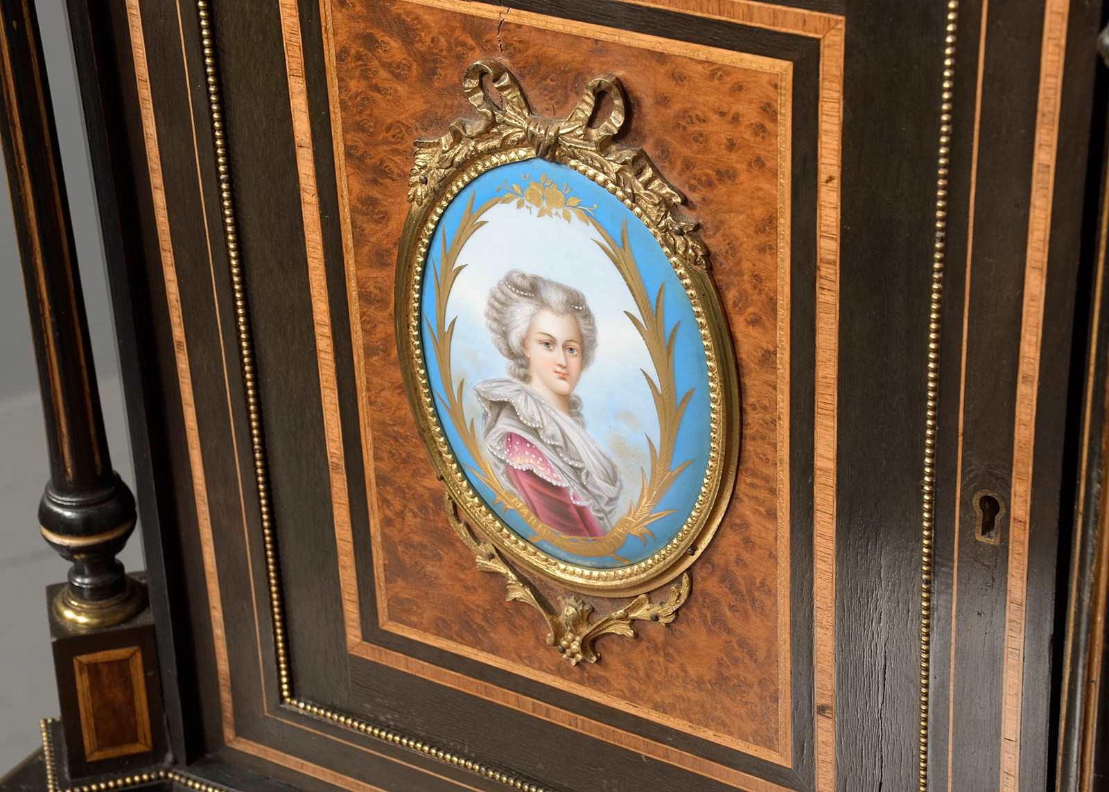 French Porcelain, Gilt, Amboyna And Inlaid Side Cabinet