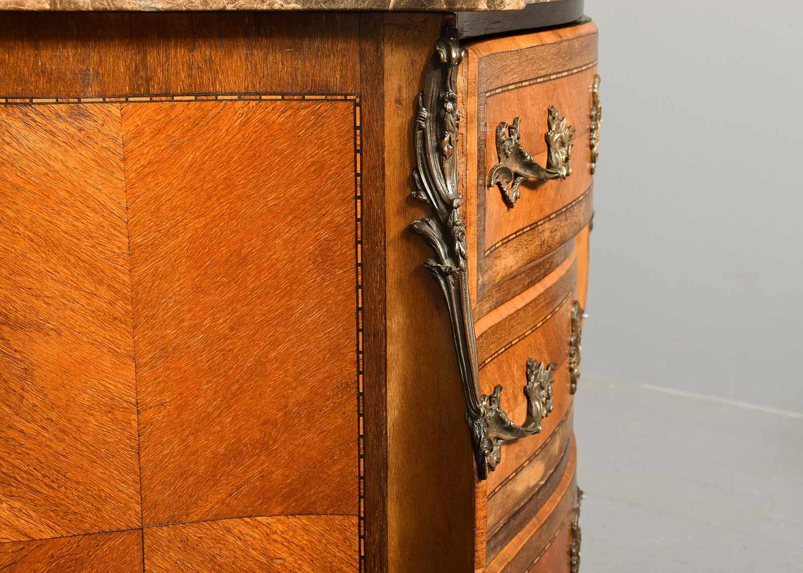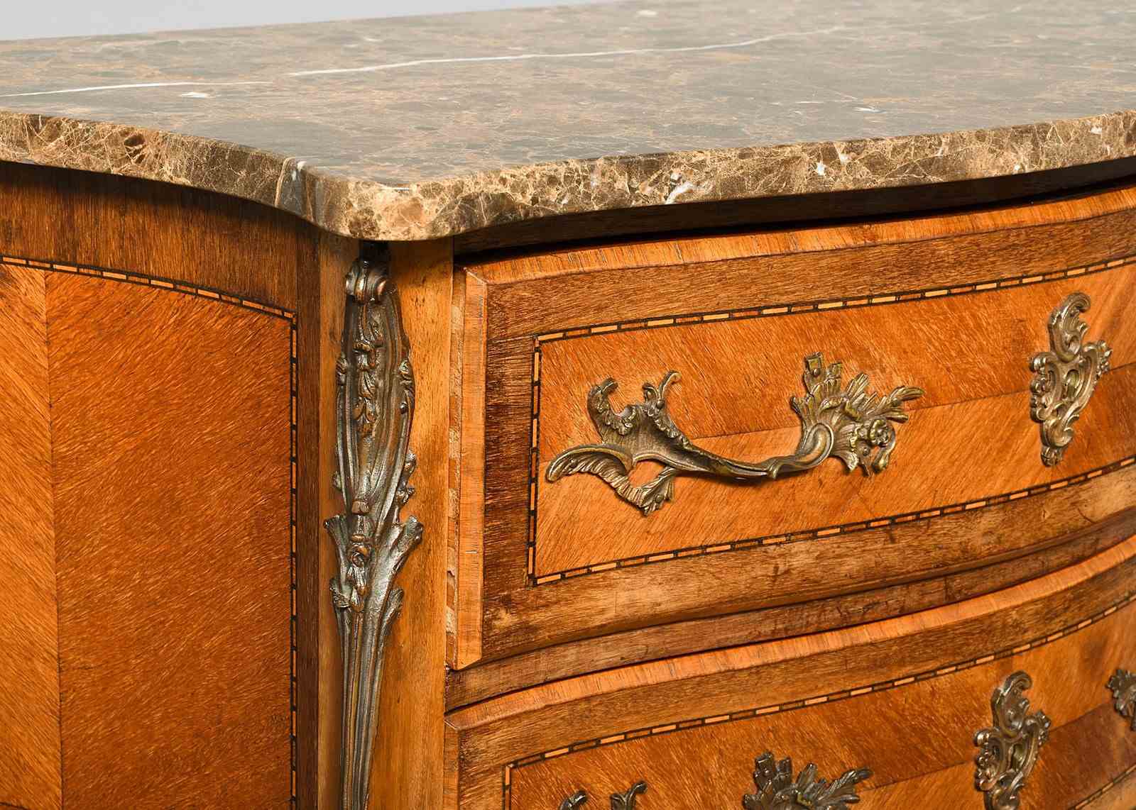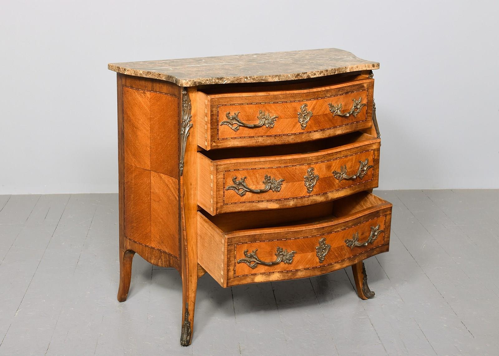 Circa 1900. French serpentine-fronted marble top inlaid mahogany commode. The shaped serpentine fronted top in a beautifully figured. Tan, cream and white marble with flat fore edges above three serpentine drawers with chequered inlay, crossbanding and rococo brass handles and escutcheons. The shaped front legs with brass mounts over short cabriole feet with brass sabots.