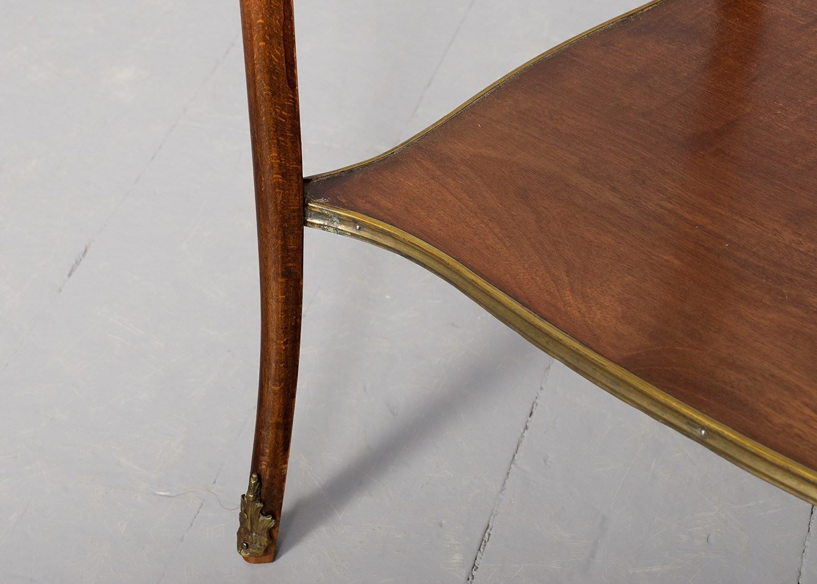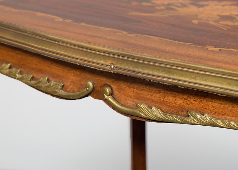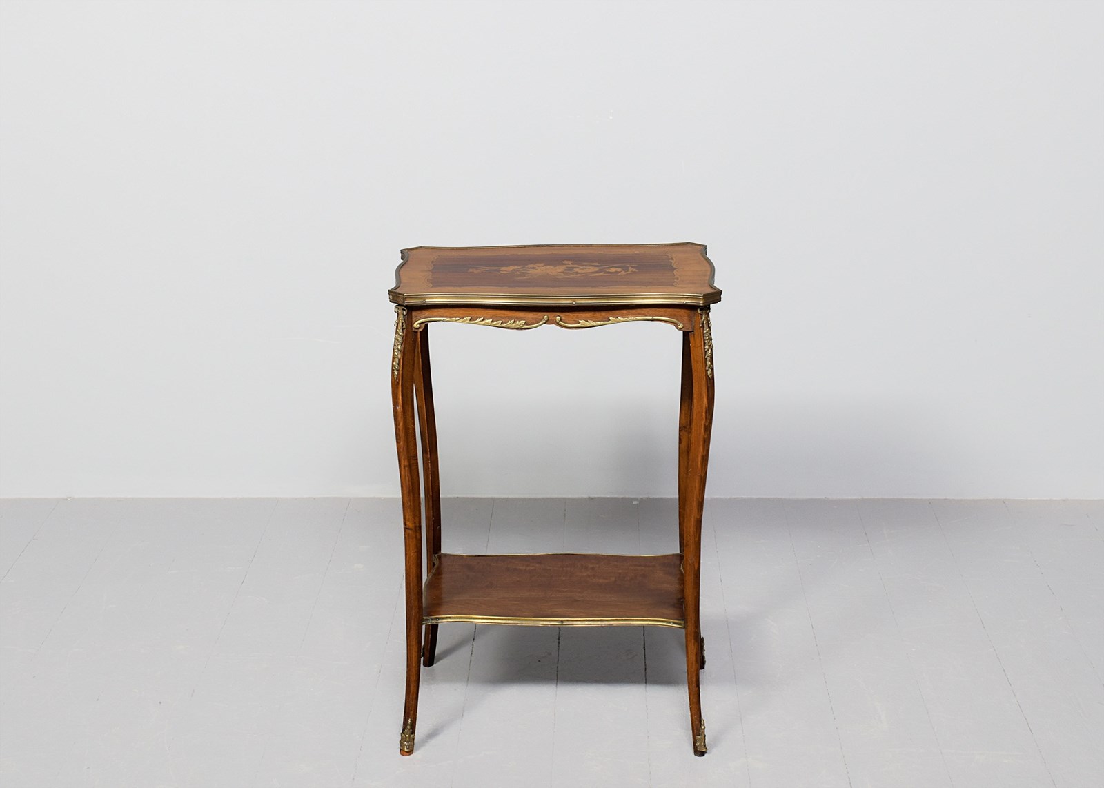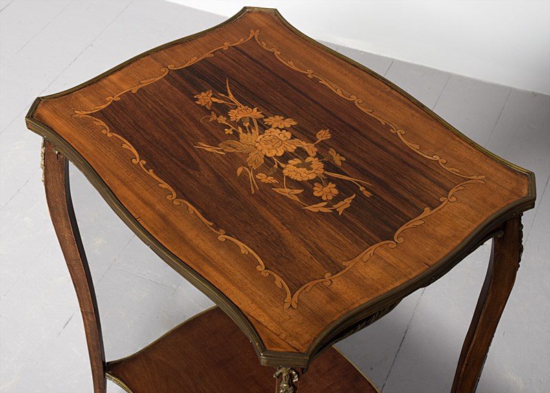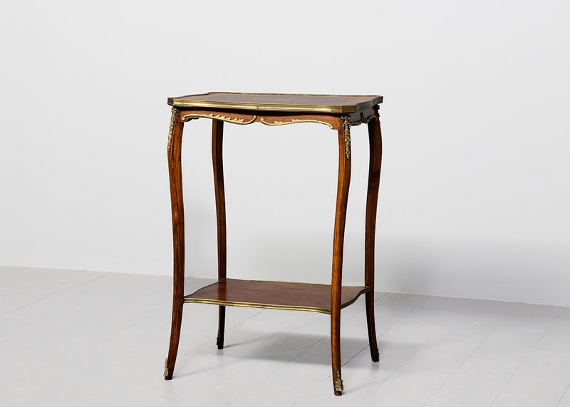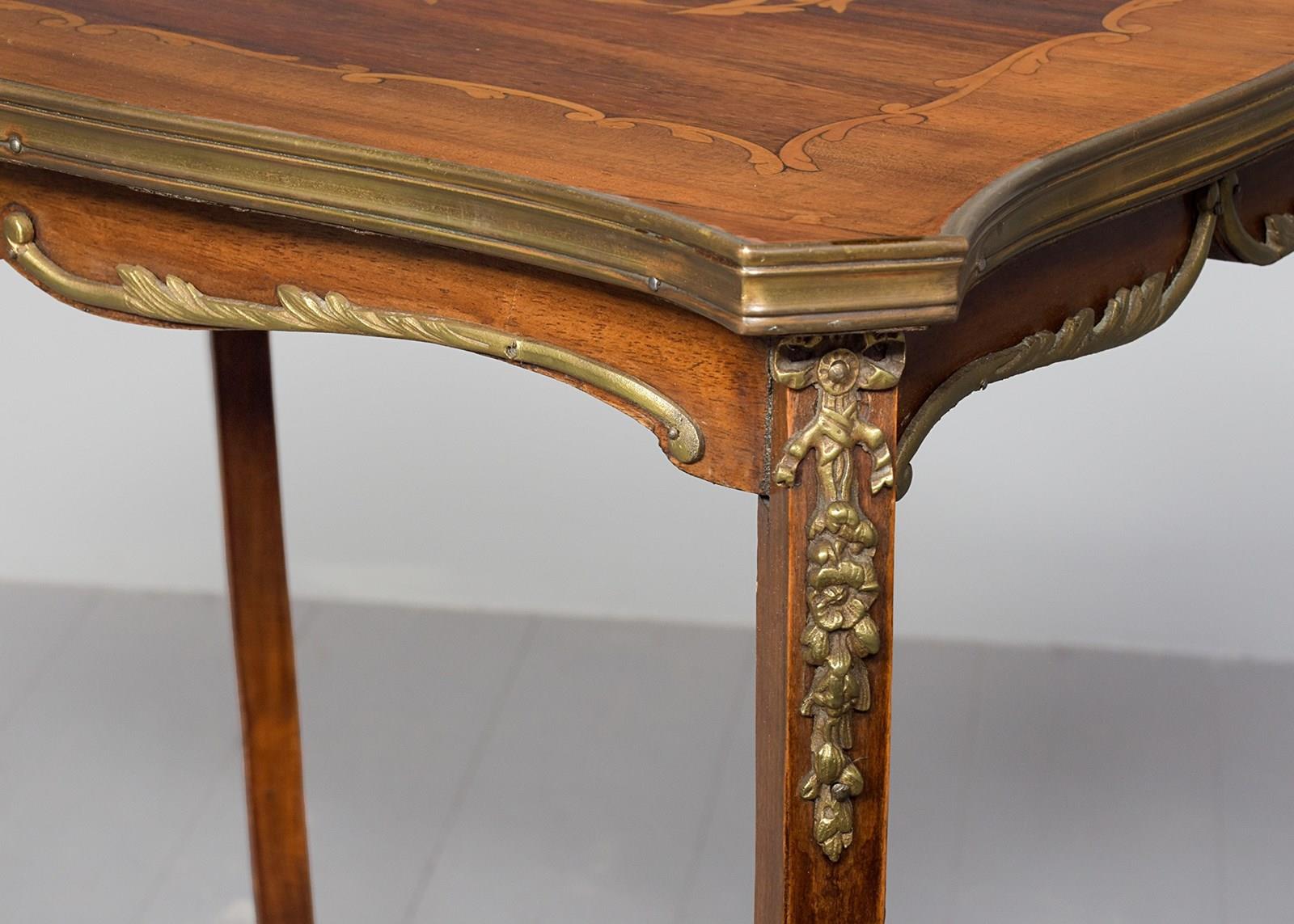 Circa 1900, a stylish French-shaped top occasional table. The table top is a mixture of walnut and rosewood with foliate marquetry in the centre and framed in a Rococo frame of satinwood, all contained in a cast brass moulded banding. Below this is a shaped apron with brass beading with foliate casting. Towards the bottom of the legs there is a tray which follows the same shape as the top without the marquetry but with a similar brass edge. At the top of the legs there is foliate castings which taper down the top of the leg and the legs are simple and elegant, finishing with small cast brass sabots. The table is a neat size, clean and sturdy.