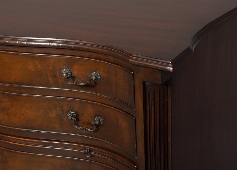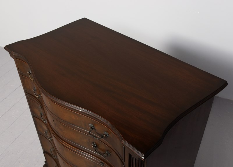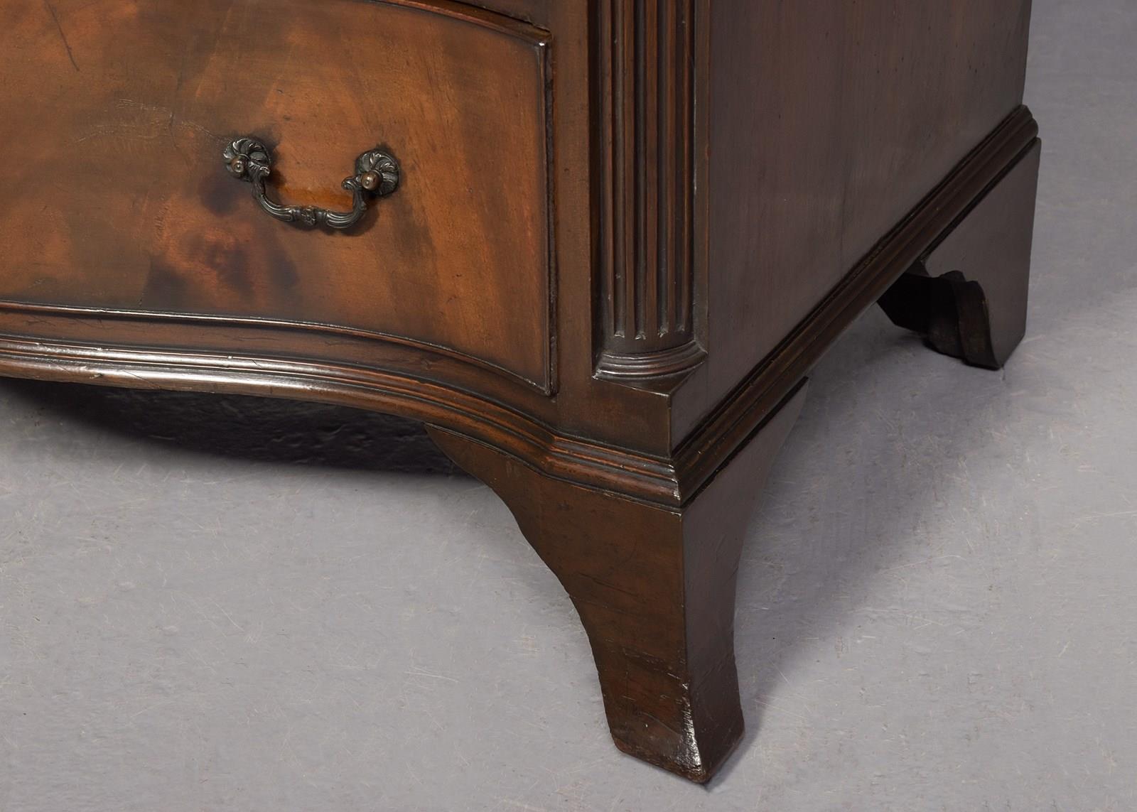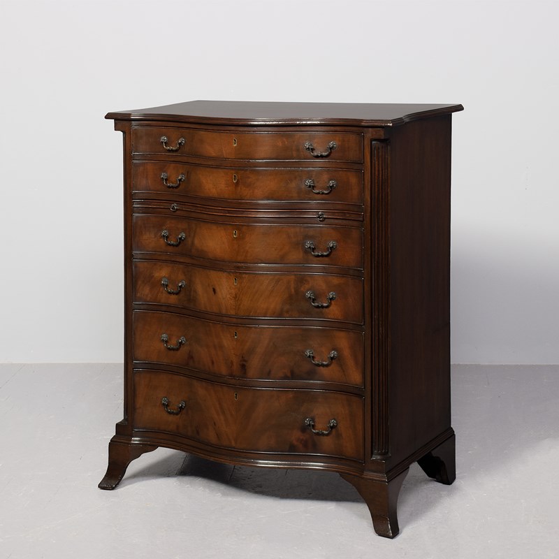 Circa 1900. George 3rd style serpentine-front, mahogany chest of drawers. The top in a nicely figured mahogany with a moulded fore edge above six cock-beaded graduated drawers with cast brass swan neck handles and solid oak drawer linings, and a brushing slide. The body with fluted canted corners & supported on a simple moulded base over splayed French bracket feet. In excellent condition.