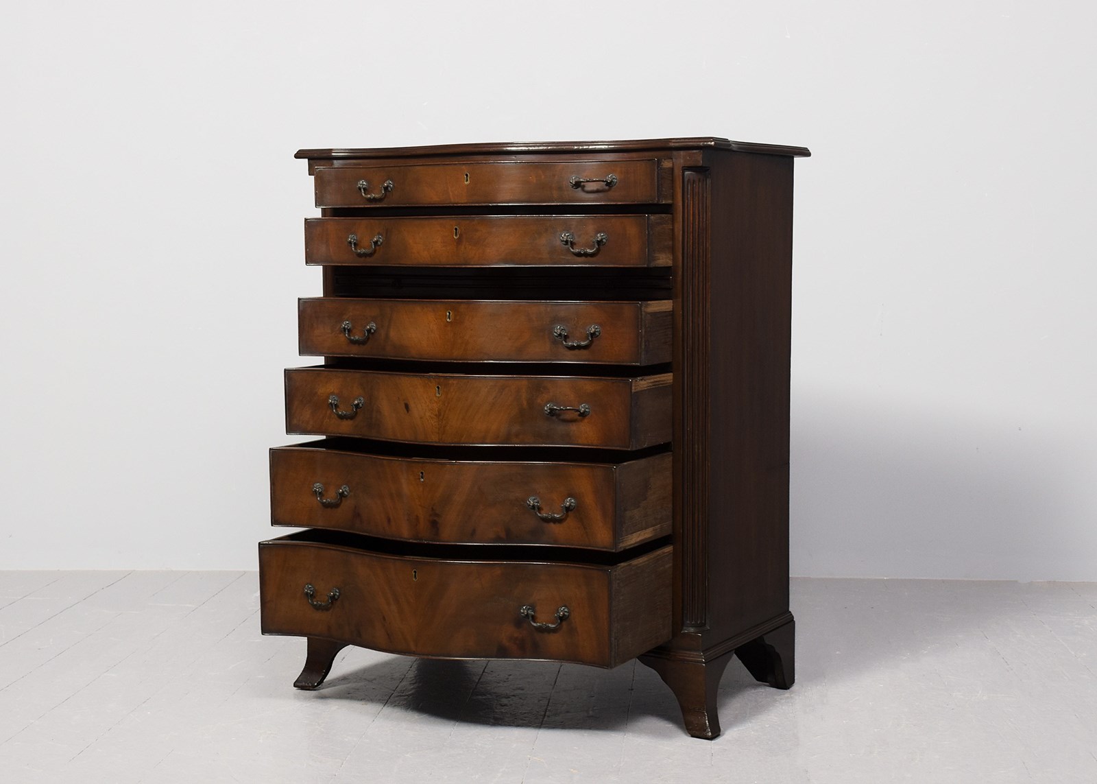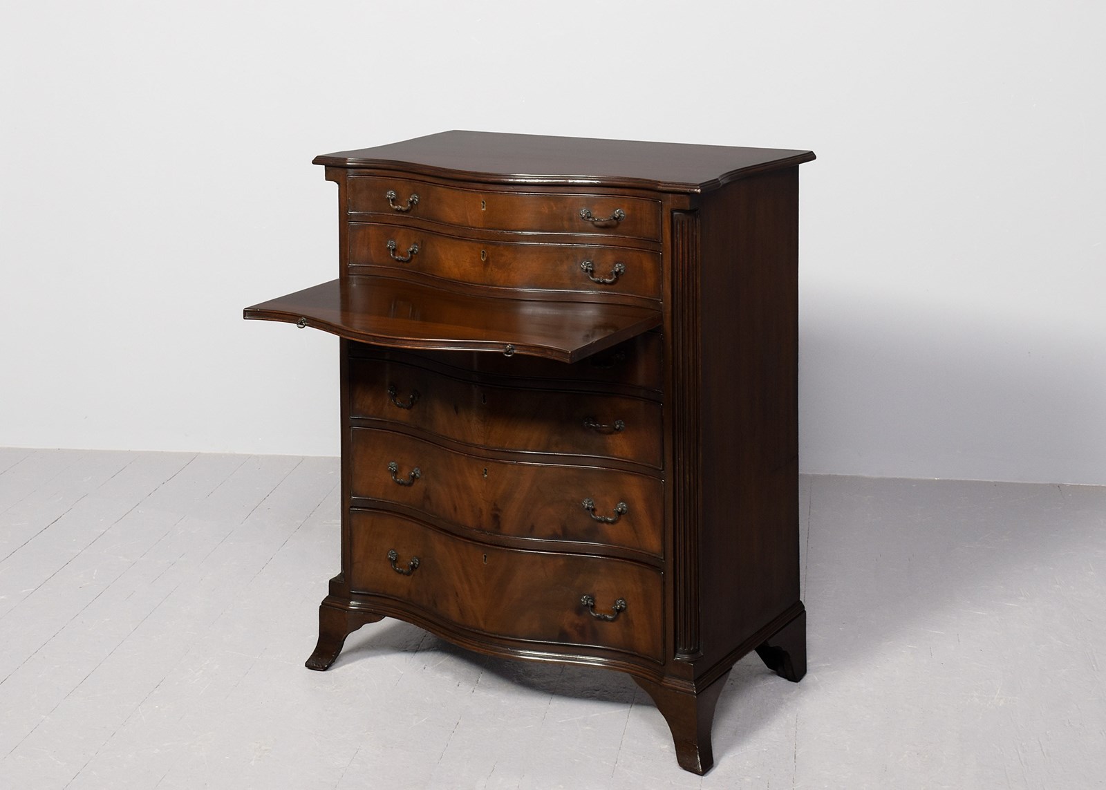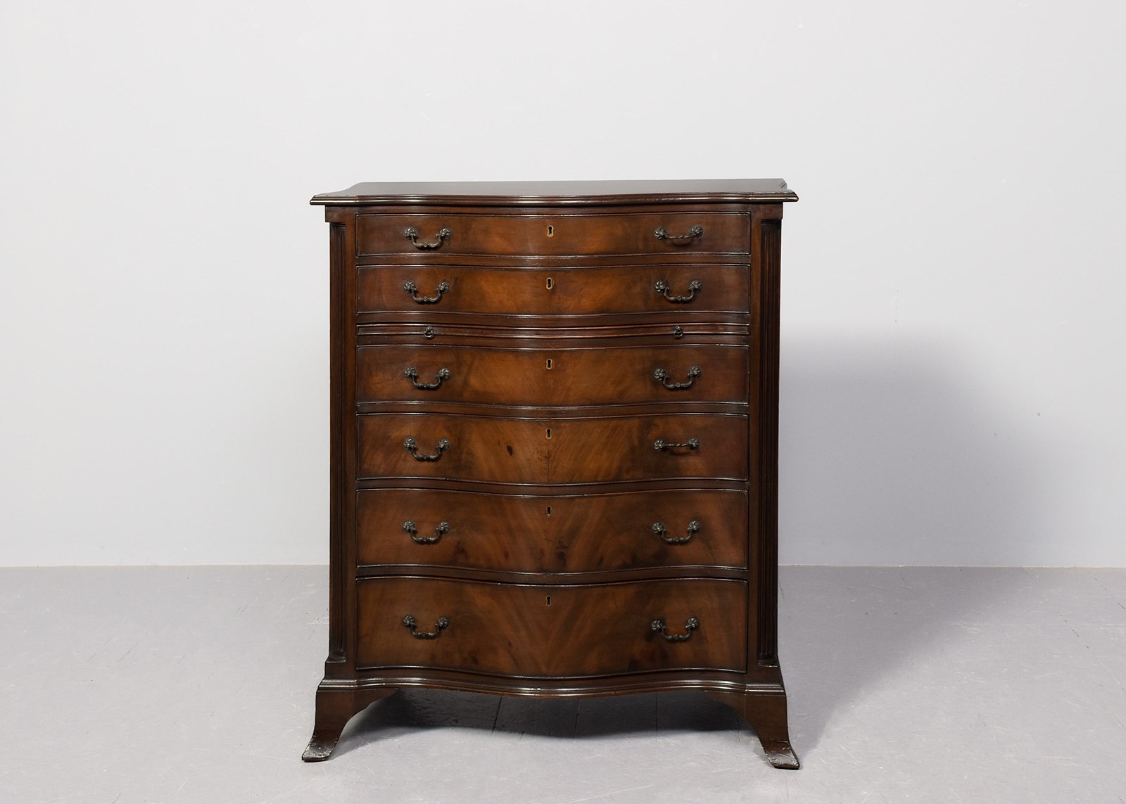 Circa 1900. George 3rd style serpentine-front, mahogany chest of drawers. The top in a nicely figured mahogany with a moulded fore edge above six cock-beaded graduated drawers with cast brass swan neck handles and solid oak drawer linings, and a brushing slide. The body with fluted canted corners & supported on a simple moulded base over splayed French bracket feet. In excellent condition.