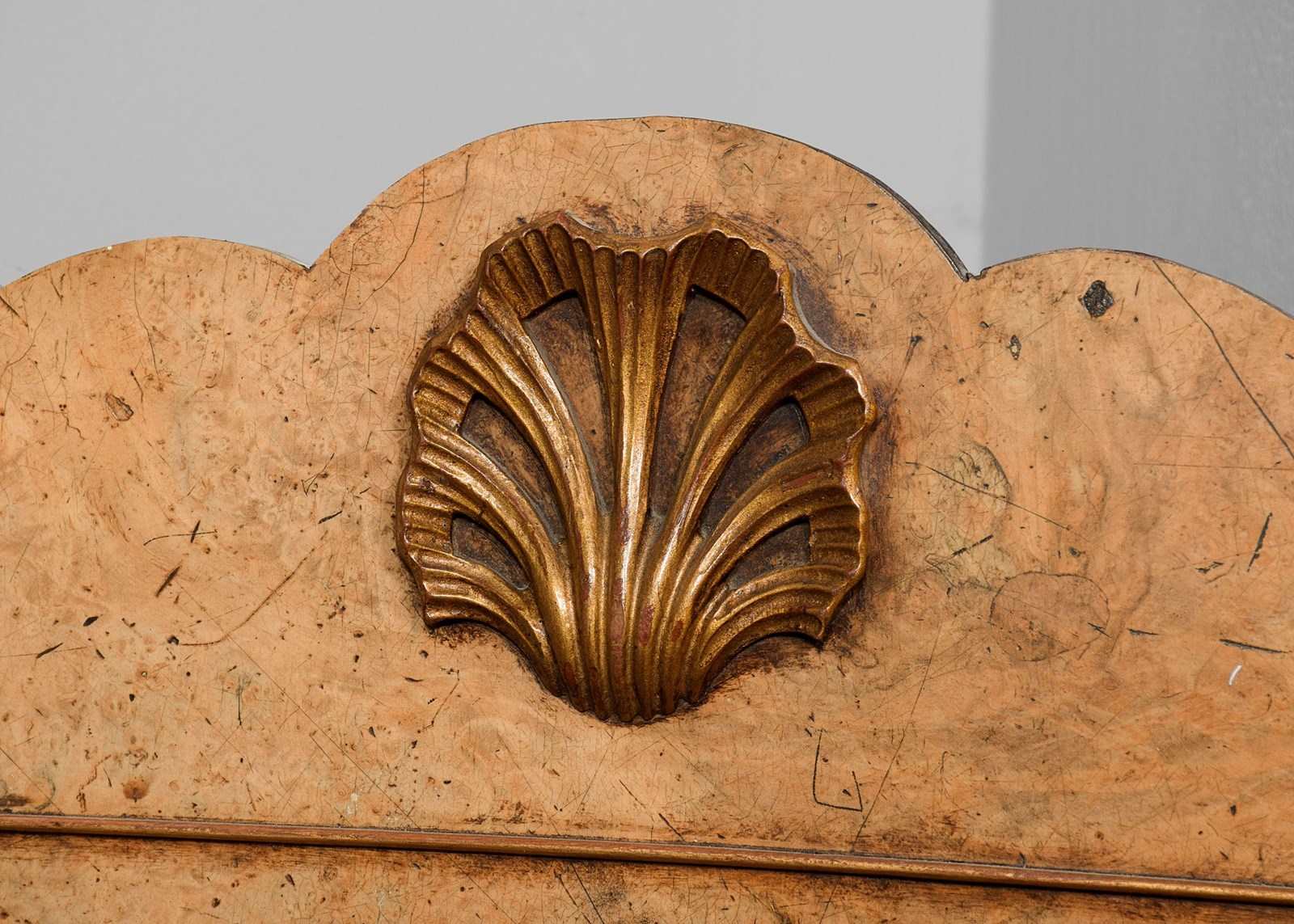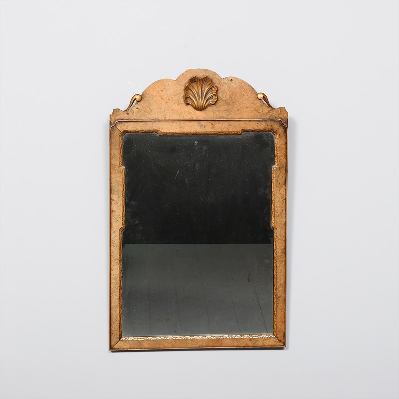 Circa 1900. George I style walnut and gilded mirror, the shaped cresting rail with gilded shell in the center and two small pierced scrolling’s to the end, the original mirror in a carved and gilded shaped slip with burr walnut panel to the outside and a small raised gilded beading which continues around the frame, the burr walnut is mellow in colour and the gilding with excellent patination.