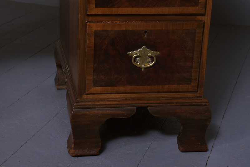 Circa 1880. George II style crossbanded figured walnut knee hole desk. The desk top in mirror-matched figured walnut with crossbanding and moulded, shaped front. The three frieze drawers with matching crossbanding, cut brass engraved handles opening to solid mahogany drawer linings and brass locks (sign of quality). A central shaped knee hole flanked by banks of three drawers supported on neat moulded bases with ogee bracket feet.